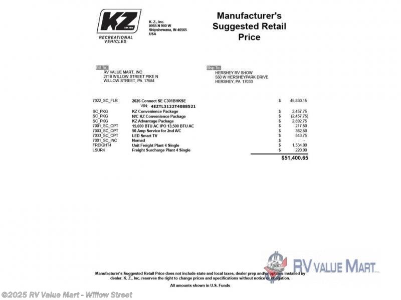 Request More Info on this 2026 K-Z Connect SE C301BHKSE Offered for sale by RV Value Mart - Willow Street