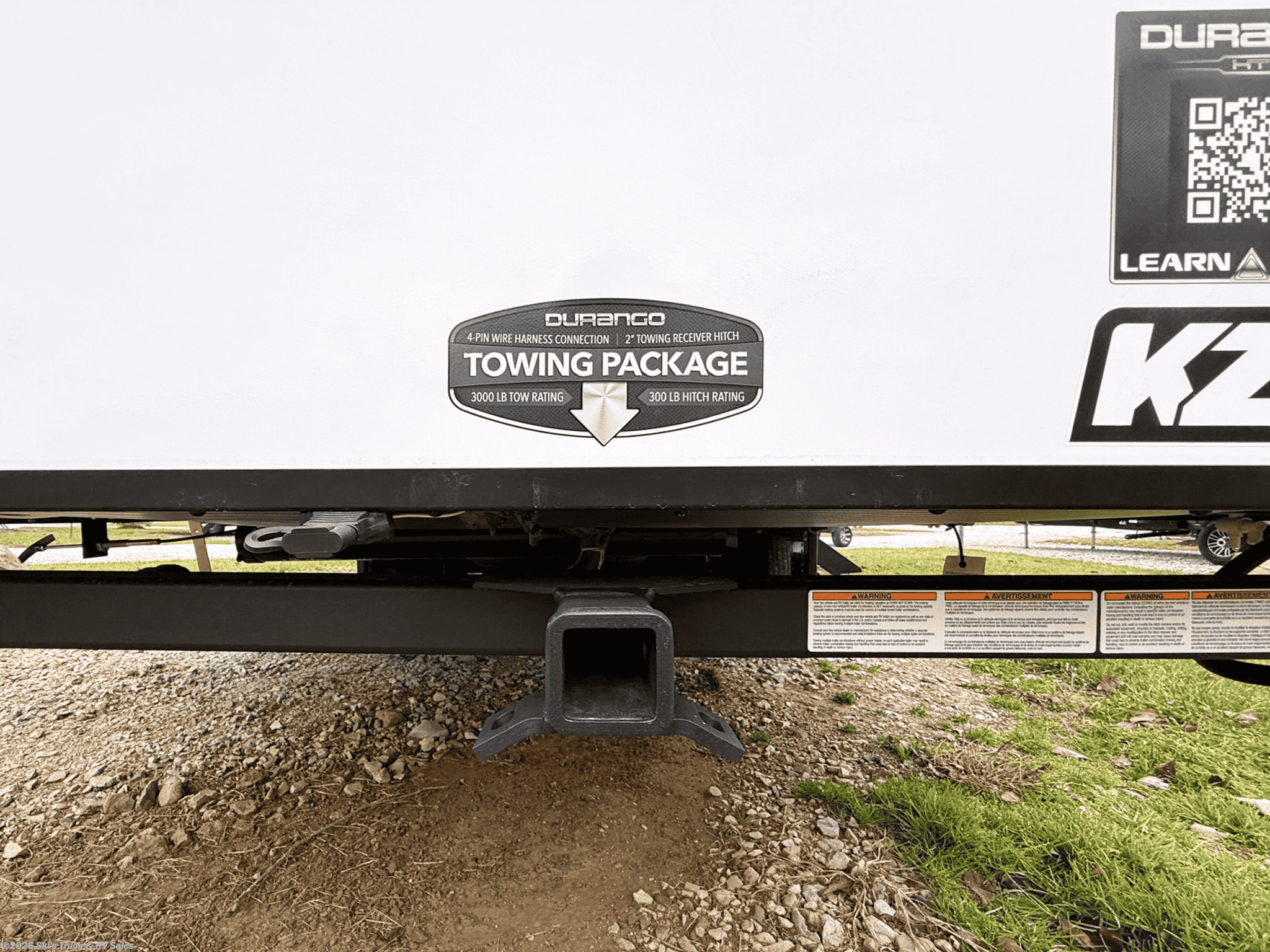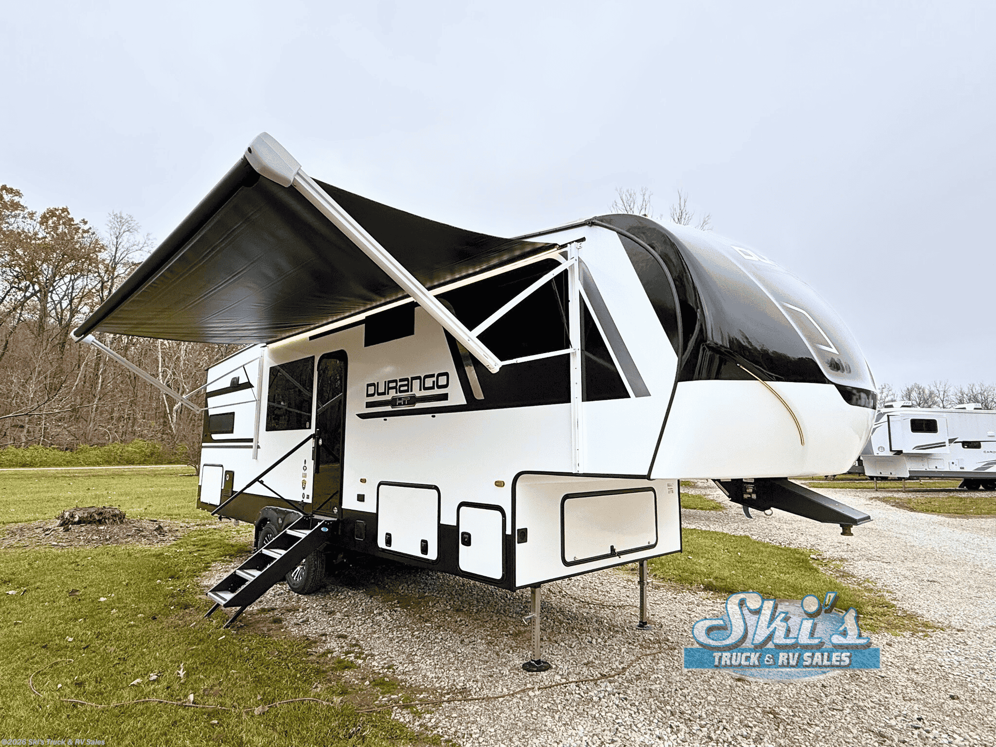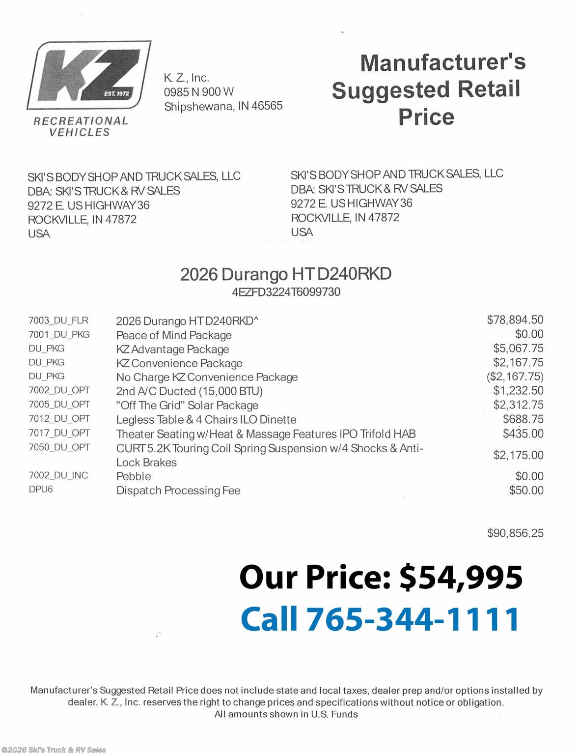 2026 KZ Durango D240RKD Half-Ton Fifth Wheel; 31 Foot; 2 Slides; Sleeps 2; Hitch Weight: 1490 Lbs.; Dry Weight: 8920 Lbs.; 50 Amp; Auto Leveling; 55 Gal. Fresh Water Cap.; 50 Gal. Black Water Cap.; 90 Gal. Gray Water Cap.; Two 30 Lbs. Propane Tanks; Two ACs: 15,000 / 15,000 BTUs; 12 C.F. (12V) Refrigerator; On Demand Water Heater; Microwave; 3-Burner Stove/Oven; Three TV Jacks; 50 In. TV; Sound Bar; USB; Speakers; One Fireplace; Pantry; Stainless Steel Sink; Free Standing Dinette; Theater Seats; Queen Bed; One Bathroom with Shower; Linen Closet; 19 Foot Power Awning with LED Lights; Solar Package; Backup Camera Prep.; Outside Kitchen with Grill; Outside Shower; Exterior Storage; Foldup Steps; Grab Handle; Roof Ladder; Rear Hitch; Leash Latch; Magnetic Door Holders; Key Alike System; Battery Disconnect; Black Tank Flush; Climate Package; Azdel Sidewalls; Screen Defender; Screenshot; Tinted Frameless Windows; Roller Shades; Goodyear Tires; Aluminum Wheels; Spare Tire; Tire Monitoring System; CURT Coil Suspension with Four Shocks and Anti-Lock Brakes; Two Year Limited Warranty; Financing Available; Super Half-Ton Fifth Wheel for the Price: $54,995. Call Skis Truck & RV Sales at 765-344-1111 or visit us at for more information.
