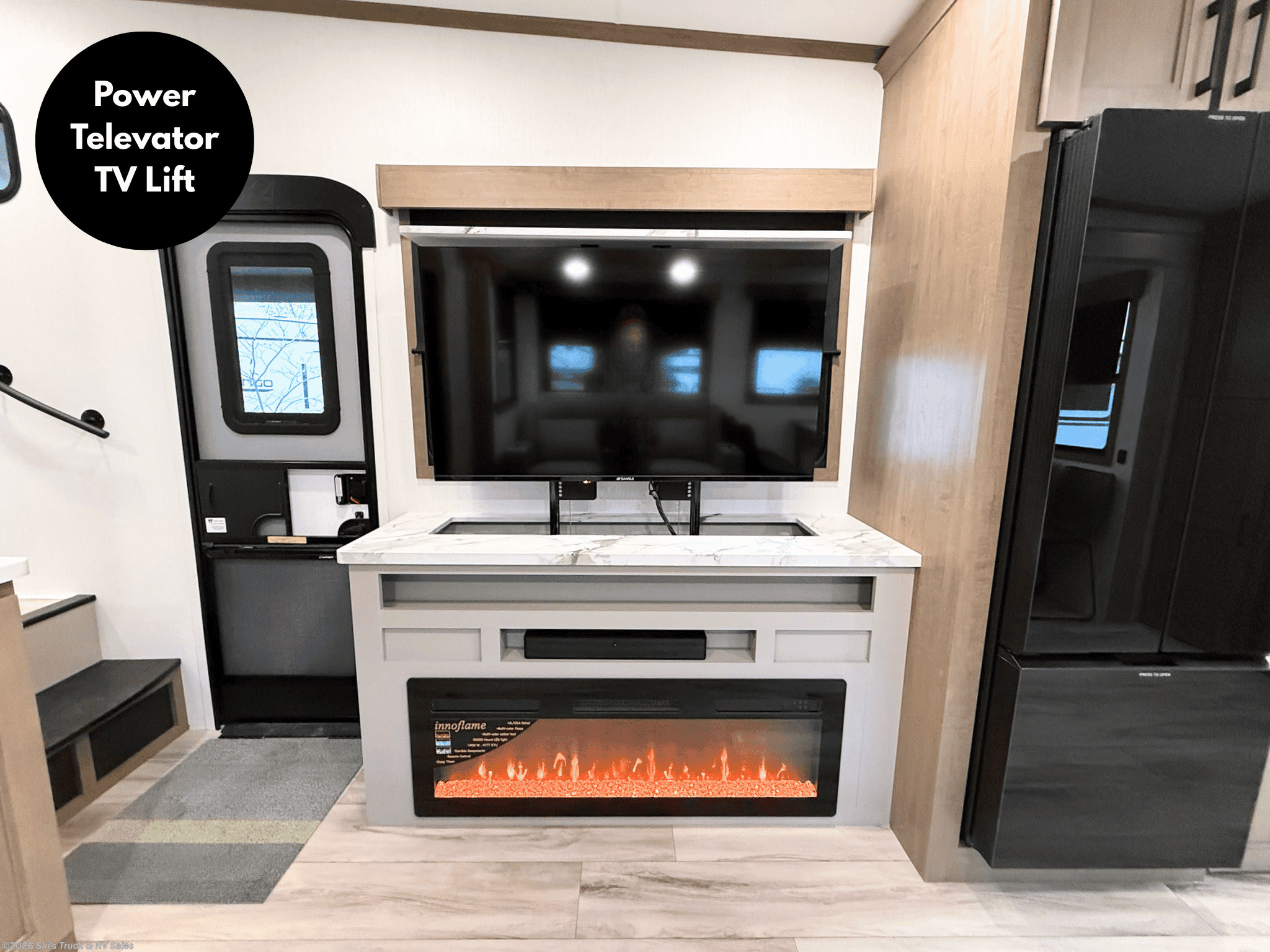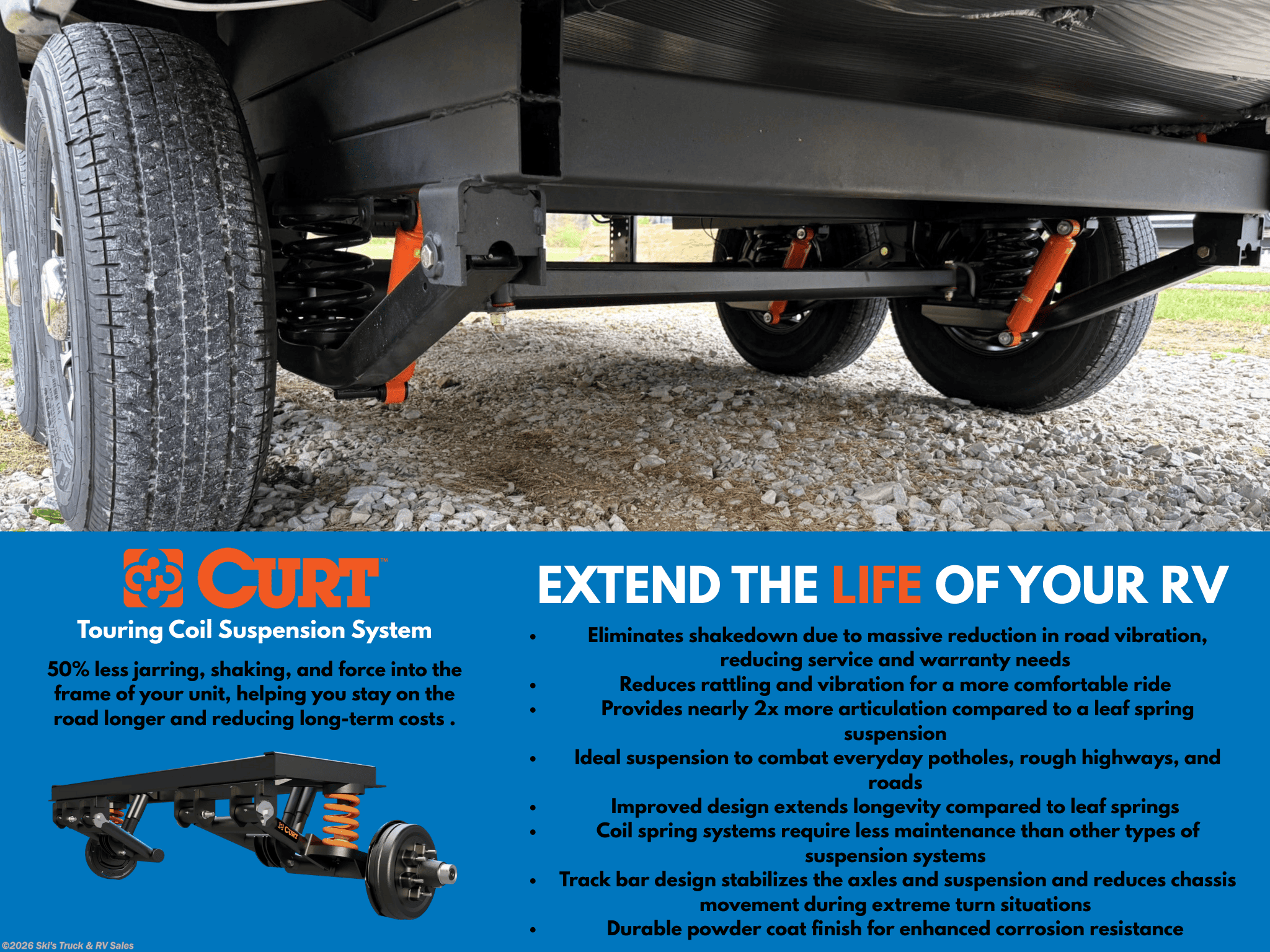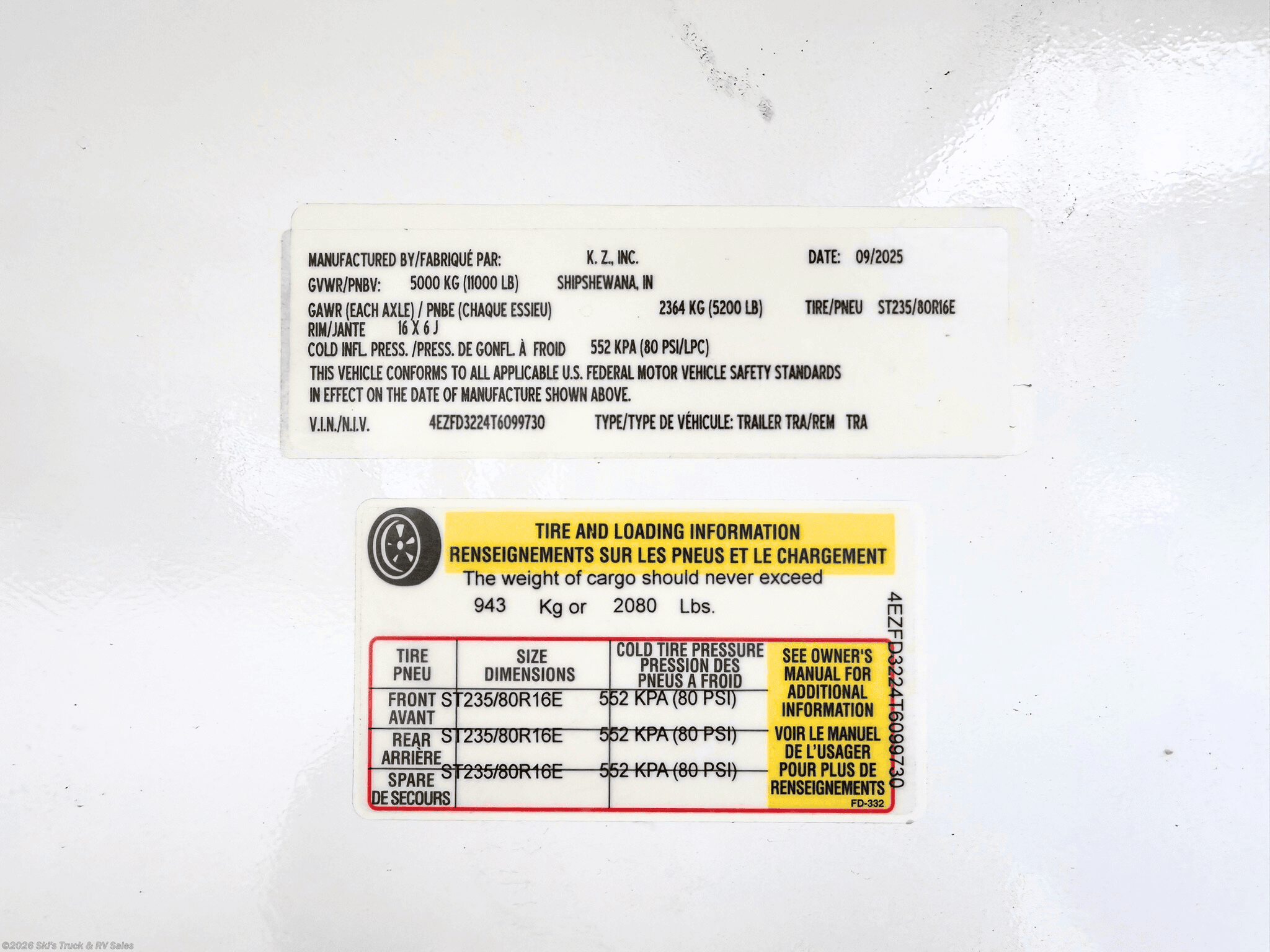 2026 KZ Durango D240RKD Half-Ton Fifth Wheel; 31 Foot; 2 Slides; Sleeps 2; Hitch Weight: 1490 Lbs.; Dry Weight: 8920 Lbs.; 50 Amp; Auto Leveling; 55 Gal. Fresh Water Cap.; 50 Gal. Black Water Cap.; 90 Gal. Gray Water Cap.; Two 30 Lbs. Propane Tanks; Two ACs: 15,000 / 15,000 BTUs; 12 C.F. (12V) Refrigerator; On Demand Water Heater; Microwave; 3-Burner Stove/Oven; Three TV Jacks; 50 In. TV; Sound Bar; USB; Speakers; One Fireplace; Pantry; Stainless Steel Sink; Free Standing Dinette; Theater Seats; Queen Bed; One Bathroom with Shower; Linen Closet; 19 Foot Power Awning with LED Lights; Solar Package; Backup Camera Prep.; Outside Kitchen with Grill; Outside Shower; Exterior Storage; Foldup Steps; Grab Handle; Roof Ladder; Rear Hitch; Leash Latch; Magnetic Door Holders; Key Alike System; Battery Disconnect; Black Tank Flush; Climate Package; Azdel Sidewalls; Screen Defender; Screenshot; Tinted Frameless Windows; Roller Shades; Goodyear Tires; Aluminum Wheels; Spare Tire; Tire Monitoring System; CURT Coil Suspension with Four Shocks and Anti-Lock Brakes; Two Year Limited Warranty; Financing Available; Super Half-Ton Fifth Wheel for the Price: $54,995. Call Skis Truck & RV Sales at 765-344-1111 or visit us at for more information.