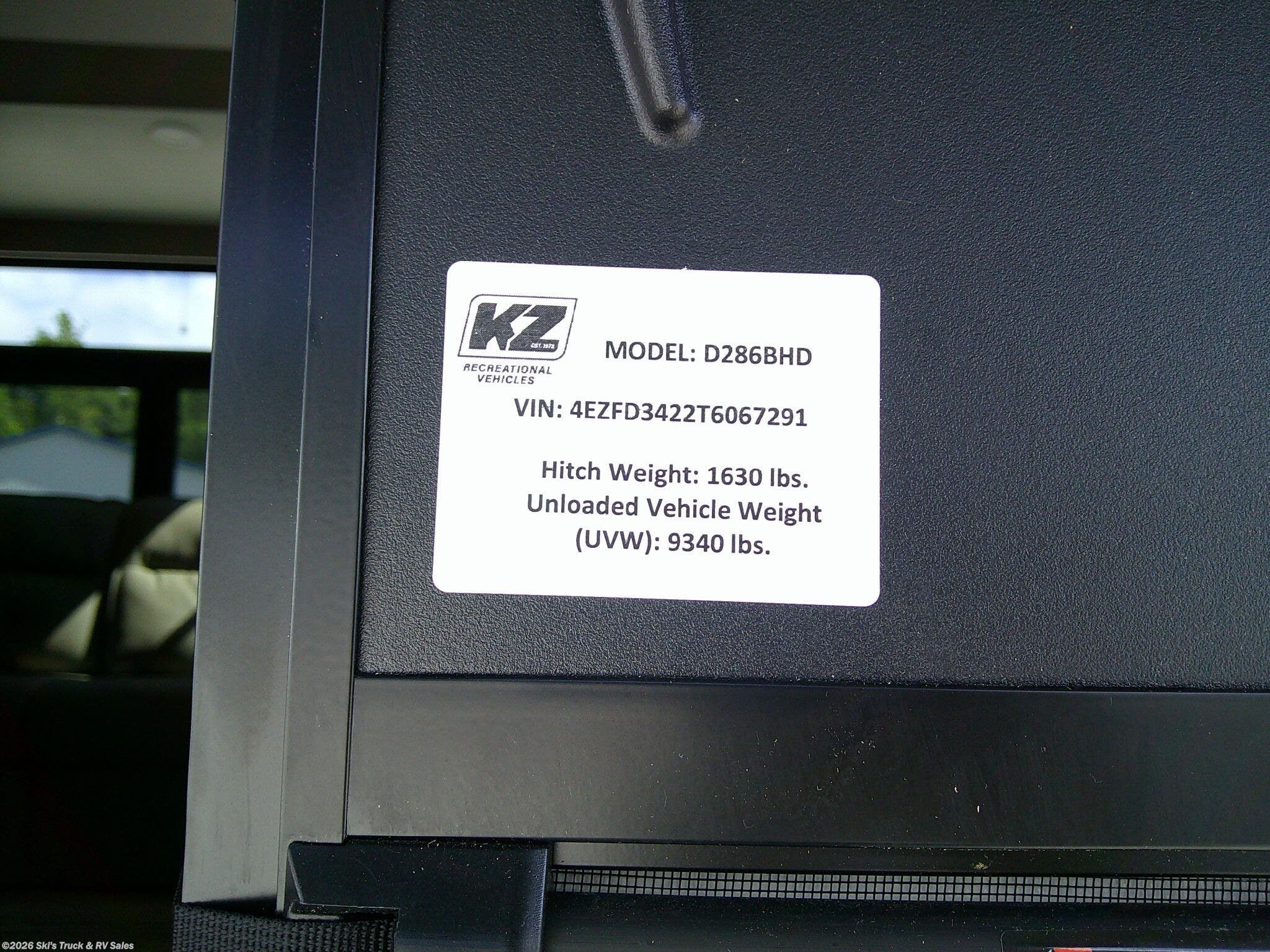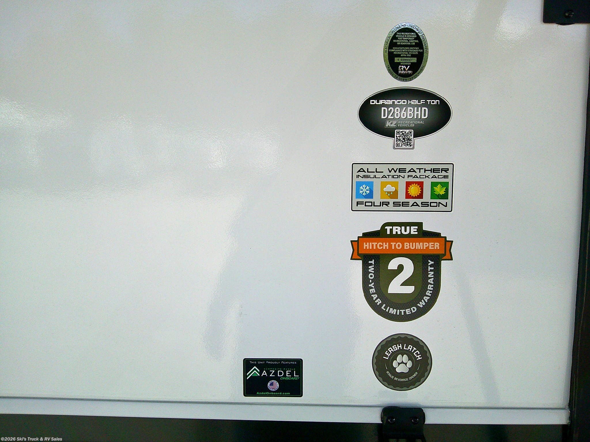 2026 KZ Durango D286BHD Half-Ton Fifth Wheel; *COMING SOON: THIS UNIT ON ORDER* 33 Foot; 2 Slides; Sleeps 8-10; Hitch Weight: 1630 Lbs.; Dry Weight: 9340 Lbs.; 50 Amp; Auto Leveling ; 55 Gal. Fresh Water Cap.; 50 Gal. Black Water Cap.; 90 Gal. Gray Water Cap.; Two 30 Lbs. Propane Tanks; Two ACs: 13,500/15,000 BTUs; 35,000 BTU Furnace; 12 C.F. (12V) Refrigerator; On Demand Water Heater; Microwave; 3-Burner Stove/Oven; Three TV Jacks; 40 In. TV; Sound Bar; Speakers; One Fireplace; Pantry; Stainless Steel Sink; U Shaped Dinette; Trifold Sofa; Queen Bed; Two Queen Bunks; One Bathroom with Shower; Porcelain Toilet; Washer/Dryer Prep.; Two Power Awnings with LED Lights: 17 Ft. / 11 Ft.; Solar Package (2000W Inverter); Backup Camera Prep.; Outside Kitchen with Griddle; Outside Shower; Exterior Storage; Foldup Steps; Grab Handle; Roof Ladder; Hitch; Leash Latch; Key Alike System; Magnetic Door Holders; Battery Disconnect; Black Tank Flush; Climate Package; Azdel Sidewalls; Screen Defender; Screenshot; Tinted Frameless Windows; Goodyear Tires; Aluminum Wheels; Spare Tire; Tire Monitoring System; CURT Coil Suspension with 4 Shocks/ABS; Two Year Limited Warranty; Financing Available. Amazing Half-Ton Fifth Wheel for the Price: $54,995. Call Skis Truck & RV Sales at 765-344-1111 or visit us at for more information.