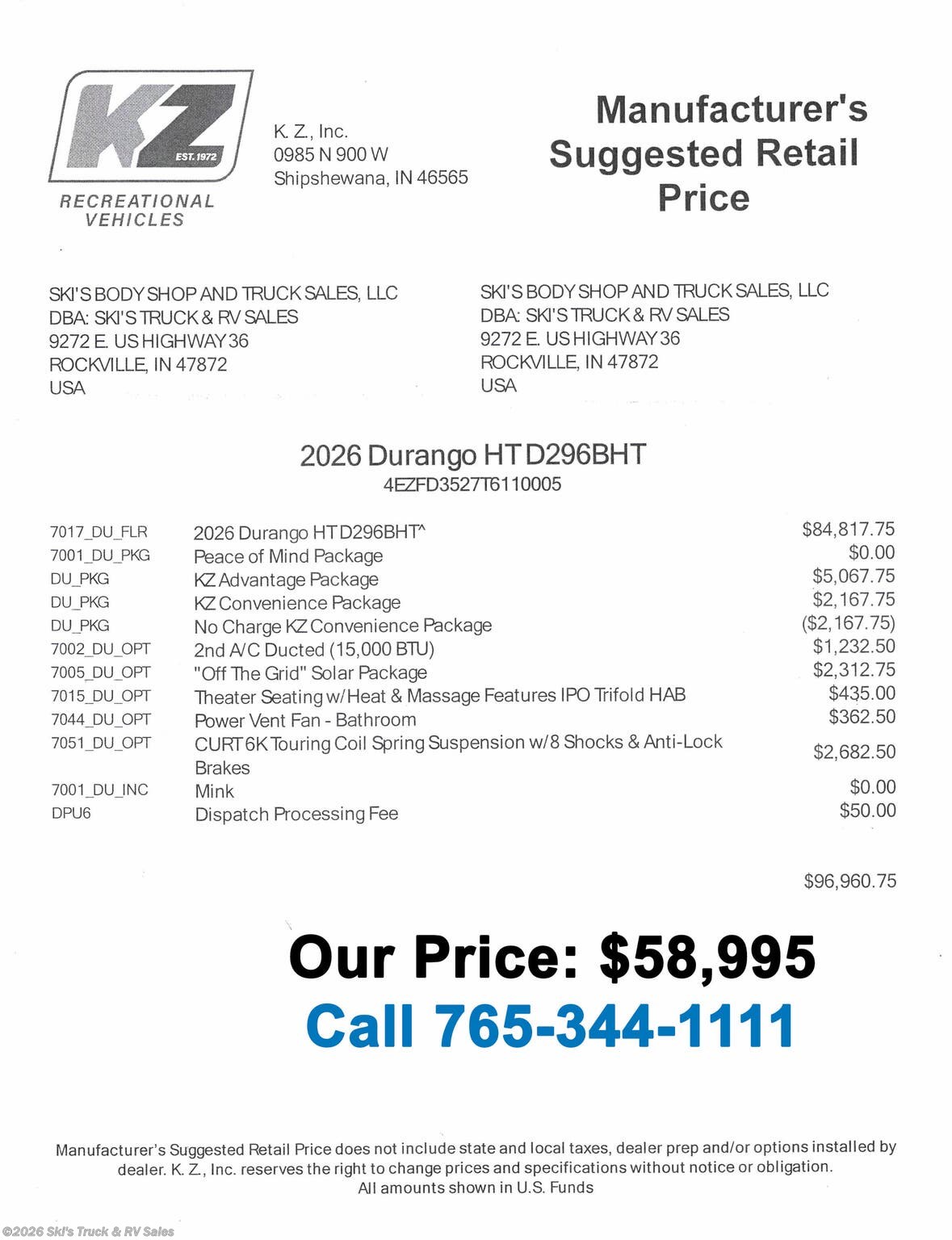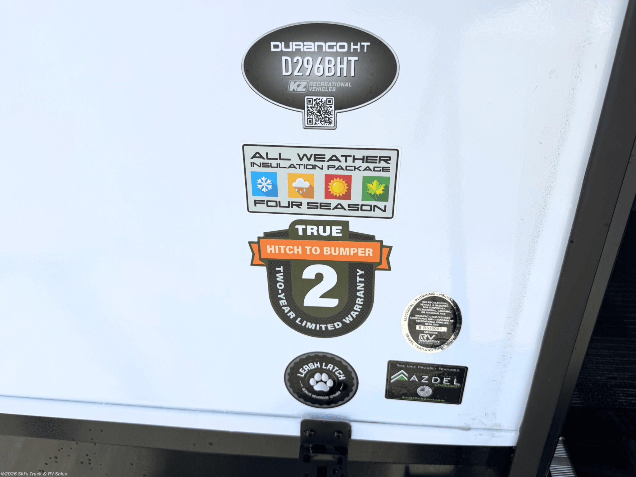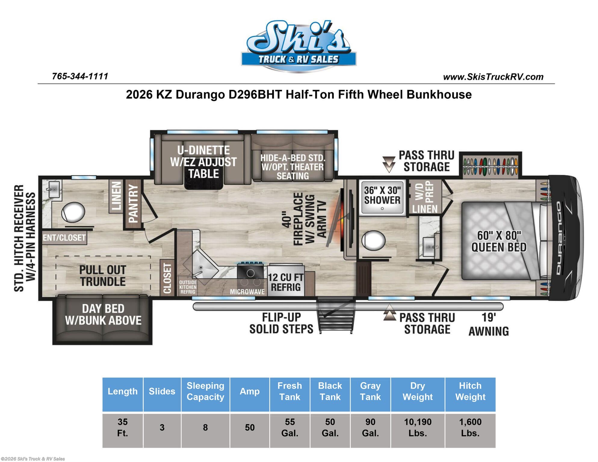 2026 KZ Durango D296BHT Half-Ton Fifth Wheel Bunkhouse; 35 Foot; 3 Slides; Sleeps 8 ; Hitch Weight: 1600 Lbs.; Dry Weight: 10,190 Lbs.; 50 Amp; Auto Leveling; 55 Gal. Fresh Water Cap.; 50 Gal. Black Water Cap.; 90 Gal. Gray Water Cap.; Two 30 Lbs. Propane Tanks; Two ACs: 15,000 / 15,000 BTUs; 35,000 BTU Furnace; 12 C.F. (12V) Refrigerator; On Demand Water Heater; Microwave; 3-Burner Stove/Oven; Three TV Jacks; 40 In. TV; Sound Bar; Speakers; One Fireplace; Pantry; Stainless Steel Sink; U Shaped Dinette; Theater Seats; Queen Bed; Single Bunks; Pull Out Trundle Bed; Washer/Dryer Prep.; 19 Foot Power Awning with LED Lights; Solar Package; Backup Camera Prep.; Outside Refrigerator; Outside Shower; Exterior Storage; Foldup Steps; Grab Handle; Roof Ladder; Hitch; Leash Latch; Key Alike System; Magnetic Door Holders; Climate Package; Frameless Tinted Windows; Azdel Sidewalls; Screen Defender; Screenshot; Roller Shades; Battery Disconnect; Black Tank Flush; Goodyear Tires; Aluminum Wheels; Spare Tire; Tire Monitoring System; CURT Coil Suspension with 8 Shocks and Anti-Lock Brakes; Two Year Limited Warranty; Financing Available; Great Fifth Wheel Bunkhouse for the Price: $58,995. Call Skis Truck & RV Sales at 765-344-1111 or visit us at for more information.