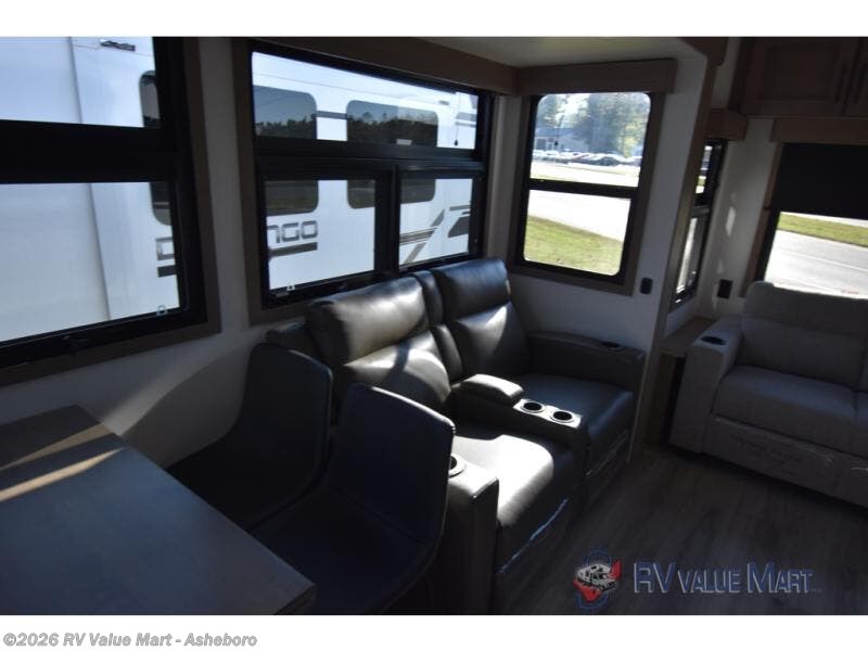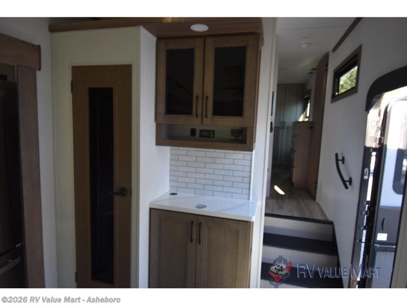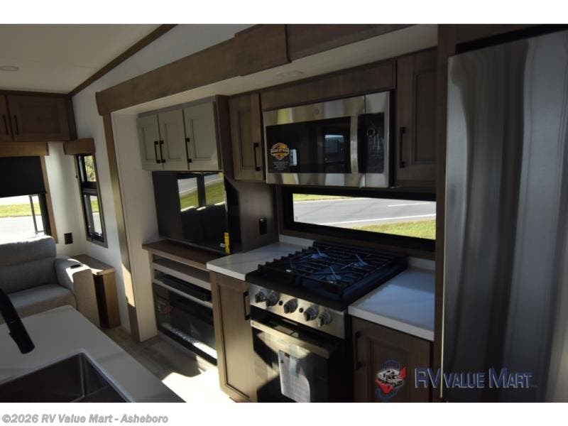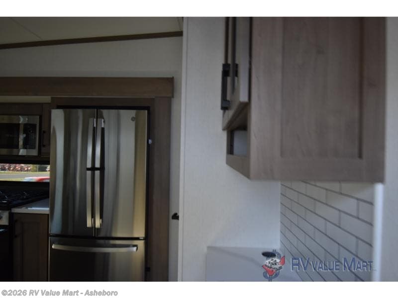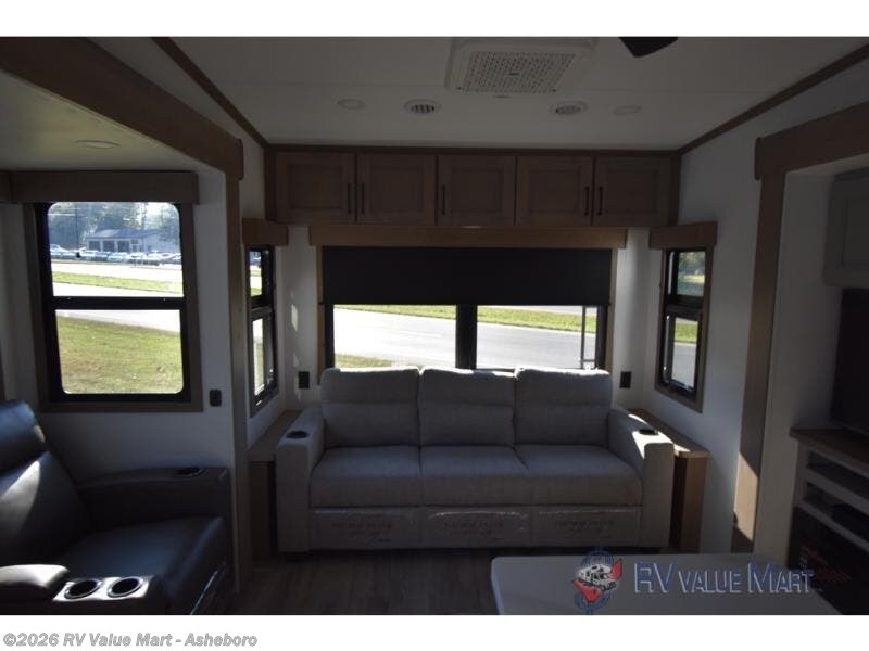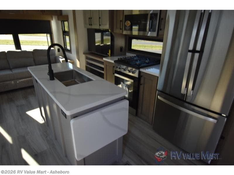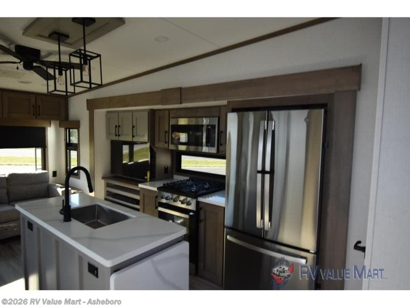 Start camping in luxury with this fifth wheel! The front private bedroom has a king bed slide which can be switched for an optional queen instead, a dresser, and a front wardrobe with washer and dryer prep. Start each morning feeling clean and fresh after showering in the 48" x 30" residential shower with a seat in the full bathroom. The kitchen has an island ideal for enjoying your morning coffee while reading the newspaper and socializing with the chef whipping up some scrambled eggs on the four burner range. The hutch can store your dishes, the pantry can store your canned goods, and the 18 cu. ft. refrigerator will keep your perishables fresh. If mother nature is raining on your parade then read a book on the rear hide-a-bed sofa or relax in the theater seating which has USB charging. And the entertainment center with a fireplace and 43" smart LED TV will keep you entertained!