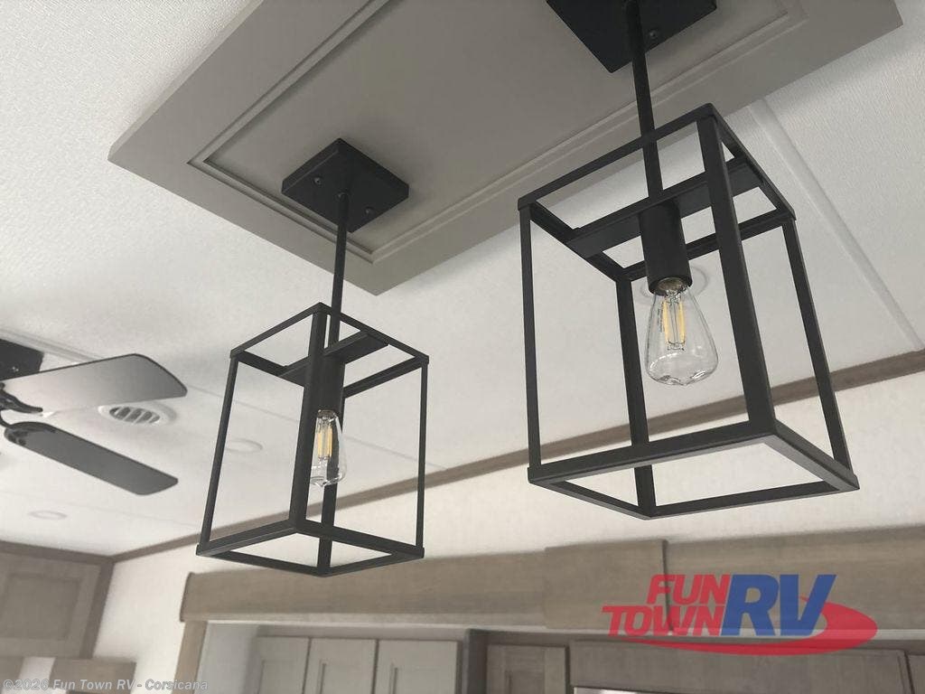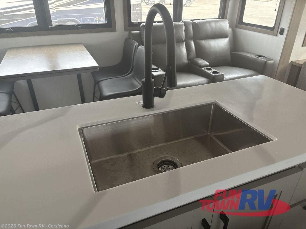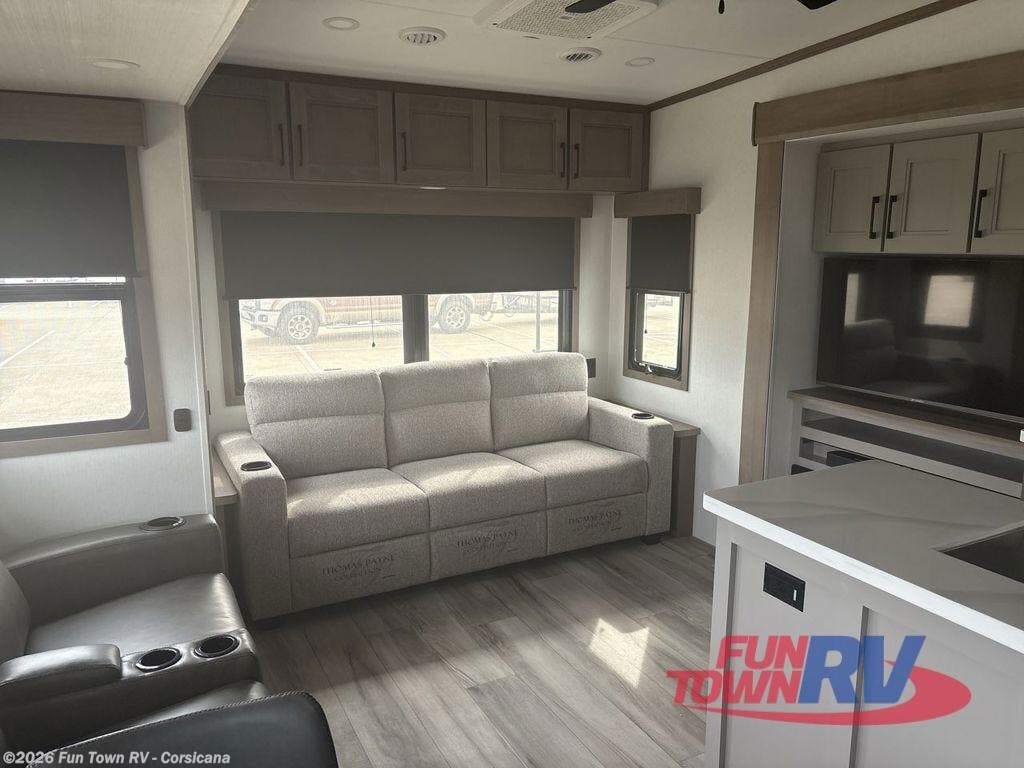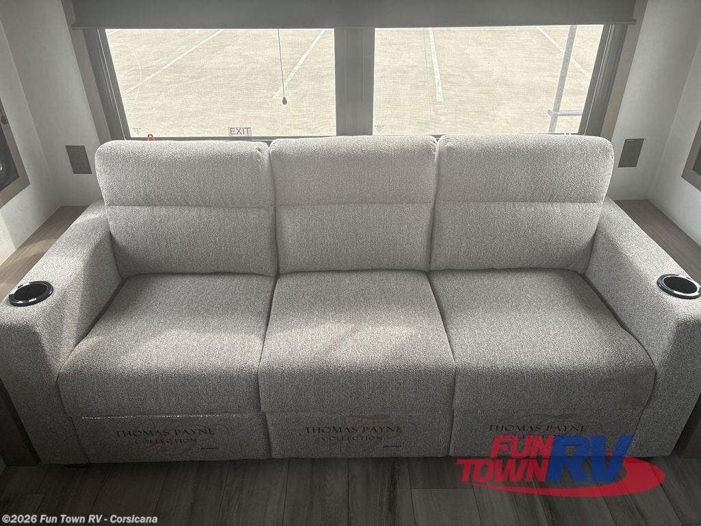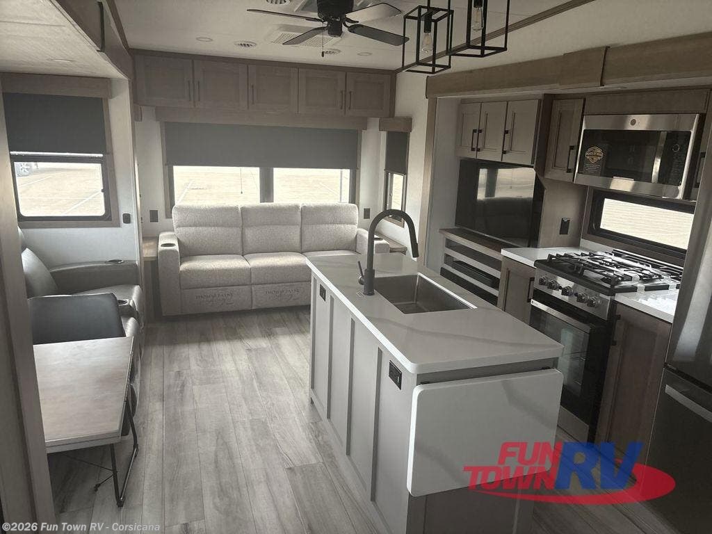 Start camping in luxury with this fifth wheel! The front private bedroom has a king bed slide which can be switched for an optional queen instead, a dresser, and a front wardrobe with washer and dryer prep. Start each morning feeling clean and fresh after showering in the 48" x 30" residential shower with a seat in the full bathroom. The kitchen has an island ideal for enjoying your morning coffee while reading the newspaper and socializing with the chef whipping up some scrambled eggs on the four burner range. The hutch can store your dishes, the pantry can store your canned goods, and the 18 cu. ft. refrigerator will keep your perishables fresh. If mother nature is raining on your parade then read a book on the rear hide-a-bed sofa or relax in the theater seating which has USB charging. And the entertainment center with a fireplace and 43" smart LED TV will keep you entertained!