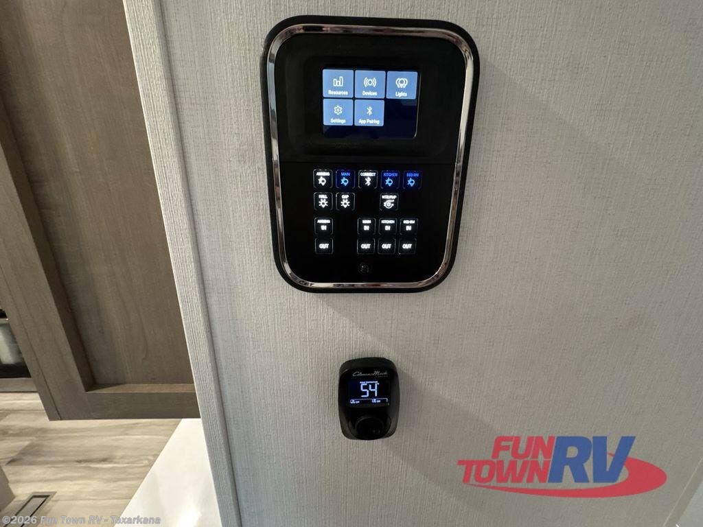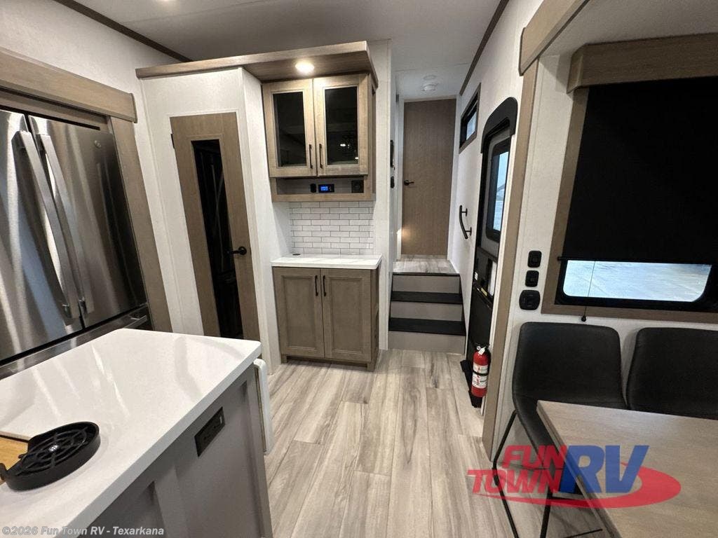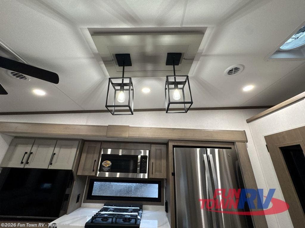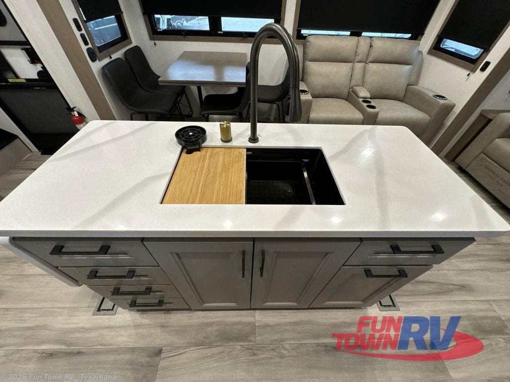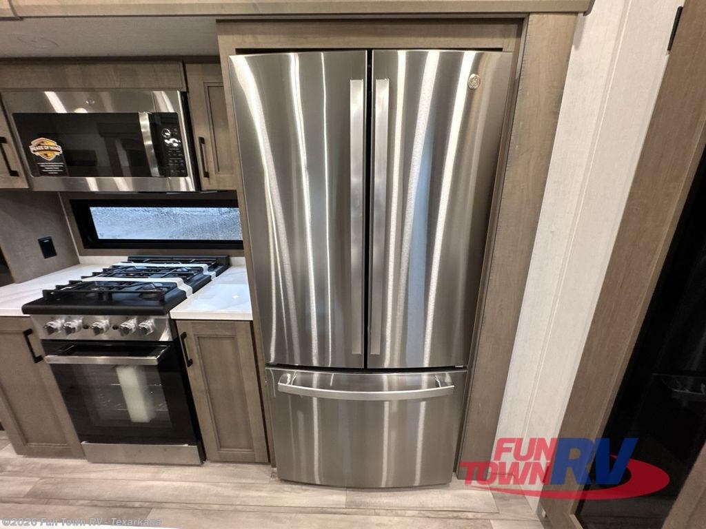 Start camping in luxury with this fifth wheel! The front private bedroom has a king bed slide which can be switched for an optional queen instead, a dresser, and a front wardrobe with washer and dryer prep. Start each morning feeling clean and fresh after showering in the 48" x 30" residential shower with a seat in the full bathroom. The kitchen has an island ideal for enjoying your morning coffee while reading the newspaper and socializing with the chef whipping up some scrambled eggs on the four burner range. The hutch can store your dishes, the pantry can store your canned goods, and the 18 cu. ft. refrigerator will keep your perishables fresh. If mother nature is raining on your parade then read a book on the rear hide-a-bed sofa or relax in the theater seating which has USB charging. And the entertainment center with a fireplace and 43" smart LED TV will keep you entertained!