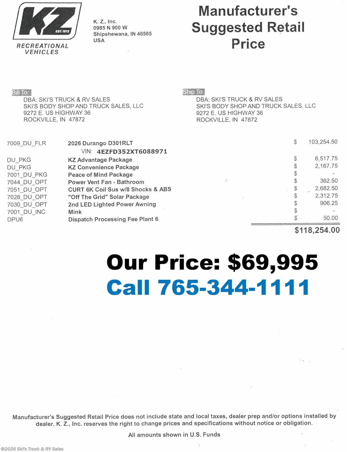 Request More Info on this 2026 K-Z Durango D301RLT Offered for sale by Ski's Truck & RV Sales
