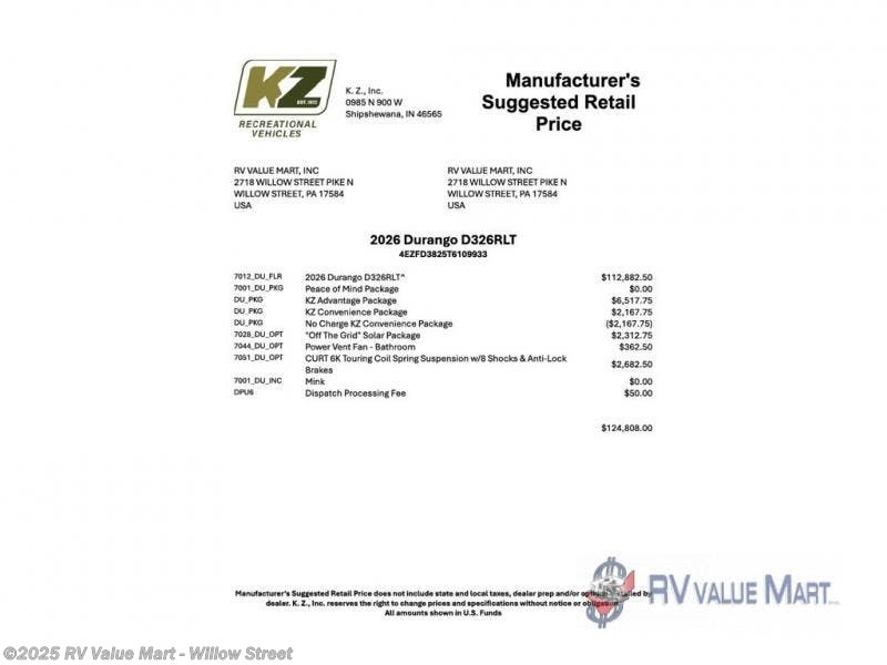Request More Info on this 2026 K-Z Durango D326RLT Offered for sale by RV Value Mart - Willow Street