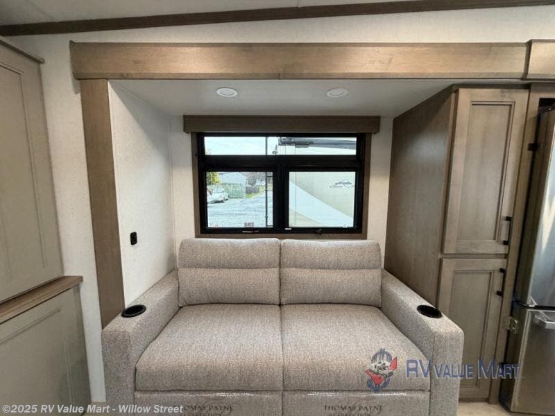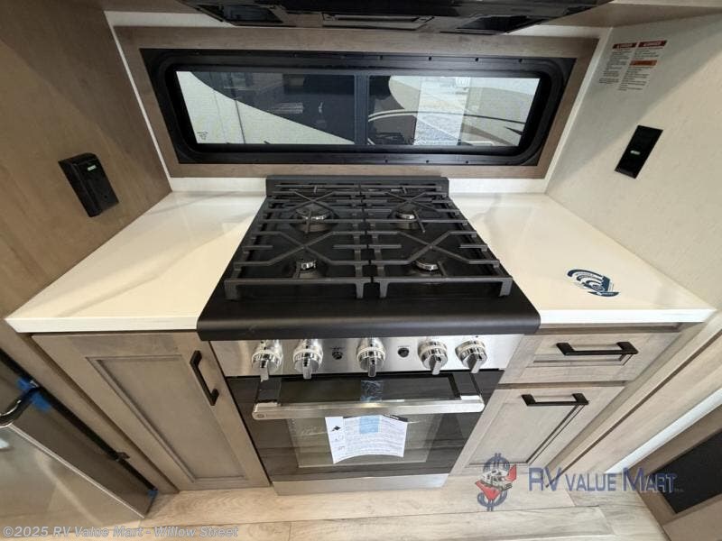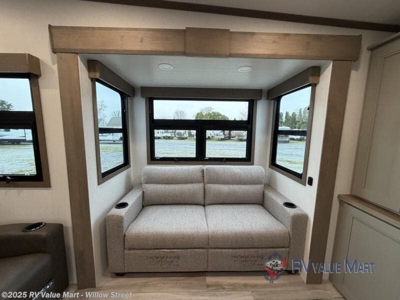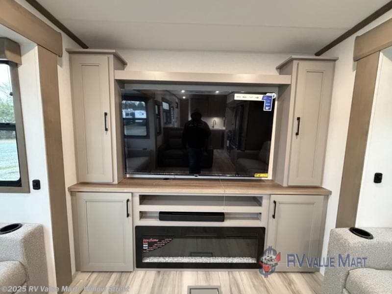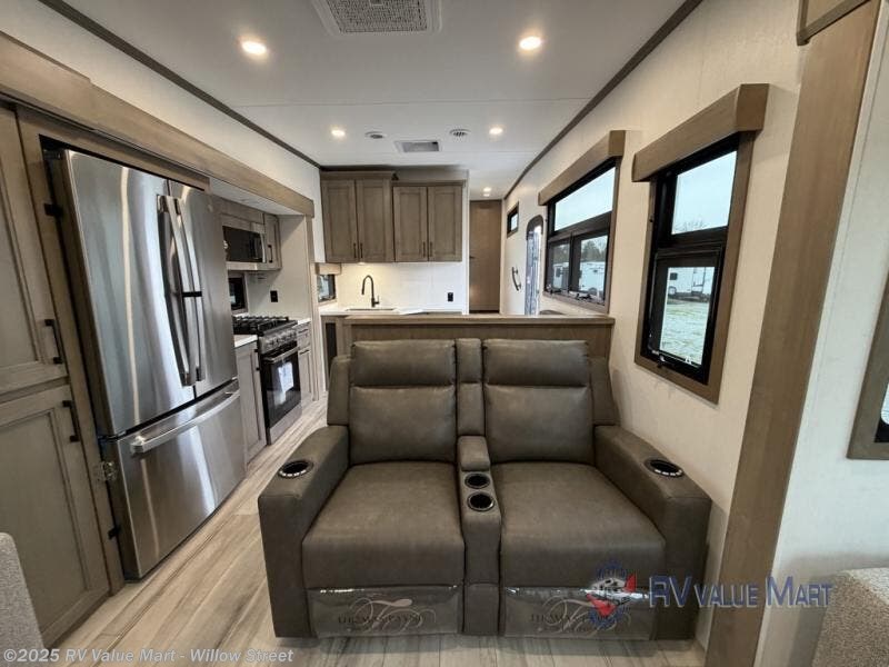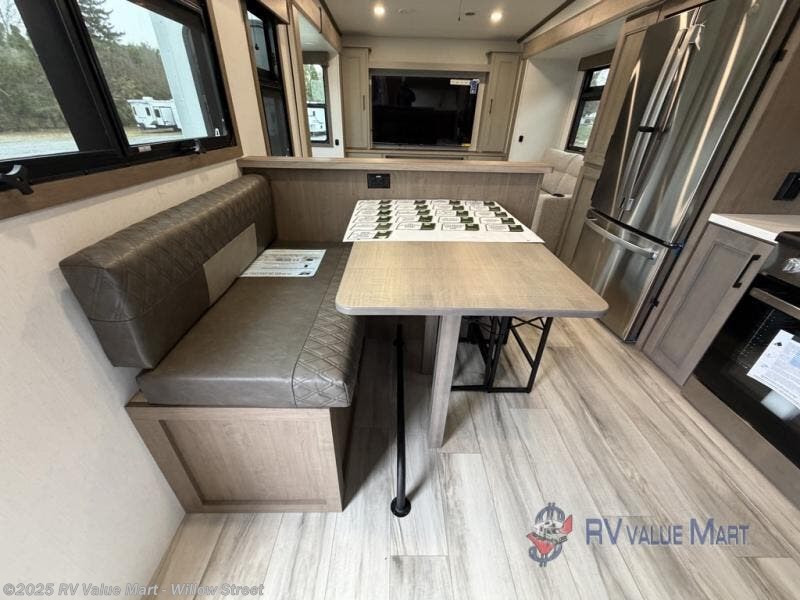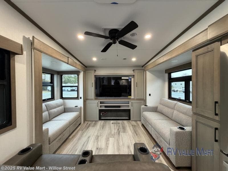 The rear living area of this fifth wheel will be the talk of the campground! It features a rear entertainment center with a 65" smart LED TV and a 48" fireplace, as well as opposing hide-a-bed sofa slides and theater seating with USB charging. The kitchen has everything you need to prepare your best meals including a 24" oven with the four burner range and booth seating with two chairs on the other side to enjoy your meals and play card games. Two can get ready at once in the full bathroom with the dual sink vanity and rinse the sand out of your hair with the 48" x 30" residential shower with a seat. The front private bedroom has a king bed slide across from a dresser and a front wardrobe with washer and dryer prep. There is even an outside griddle to cook some pancakes for a sunrise breakfast!