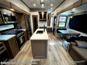 Experience the pinnacle of luxury fifth-wheel living! The front private bedroom has a king bed slide which can be switched for an optional queen instead, a dresser, and a front wardrobe with washer and dryer prep. Start feeling clean and fresh each morning after showering in the 48" x 30" residential shower with a seat in the full bathroom. The kitchen has an island that will make cooking time easy and allow you to mingle with the chef whipping up some scrambled eggs on the four-burner range. The hutch can store your dishes, the pantry can store your canned goods, and the 18 cu. ft. refrigerator will keep your perishables fresh. To experience a quiet time and relaxing time read a book on the rear hide-a-bed sofa or relax in the theater seating with USB charging. And the entertainment center with a fireplace and 50" smart LED TV will keep you entertained! Finally, this unit offers a flexible storage space ideal for keeping all organized and neat, and a patio deck, perfect for spending time outside connecting with nature.