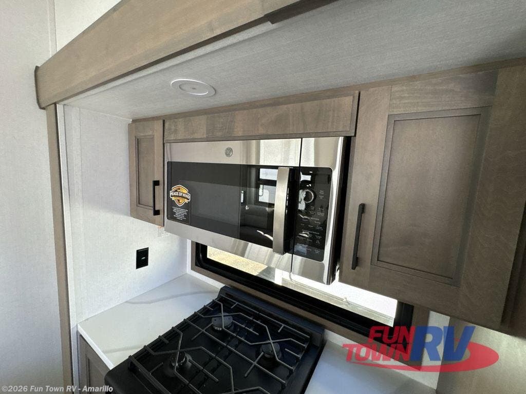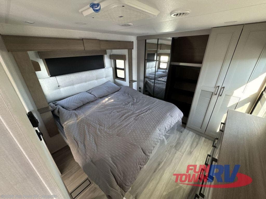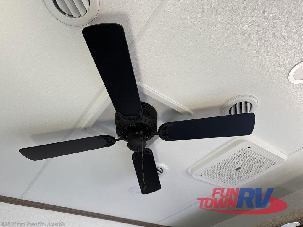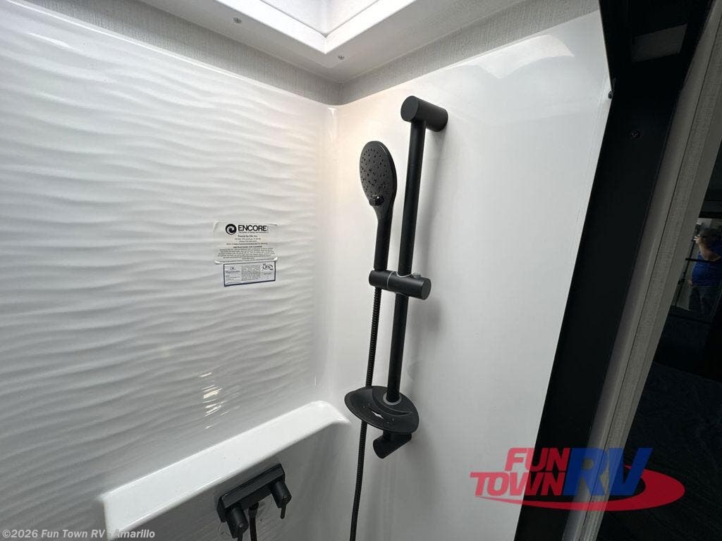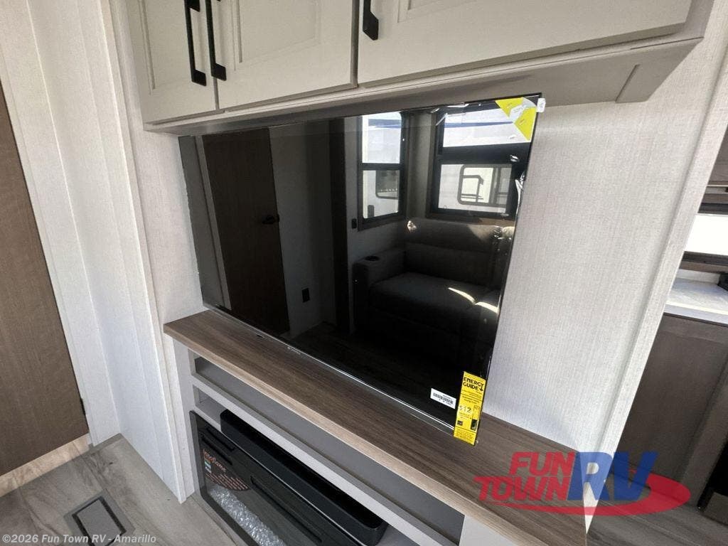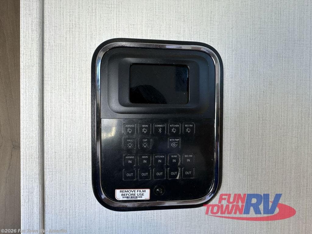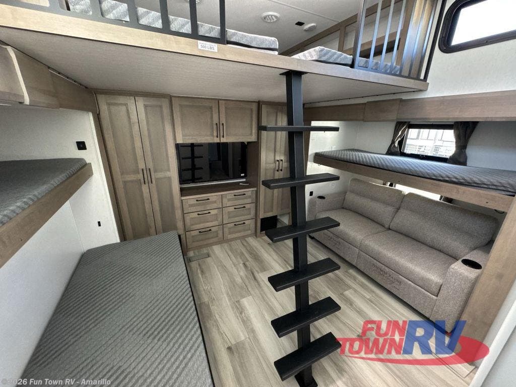 All of your friends and family can camp together in this fifth wheel! It features a rear private bunkhouse with a bunk above a hide-a-bed sofa, a full bathroom with a 30" x 36" shower, and an entertainment center with wardrobes on either side. There is also a folding bunk and a bunk over the outside kitchen. Across from the hide-a-bed sofa is an entertainment center with a 40" fireplace and a 43" smart TV to watch your favorite movies at night. The kitchen island will allow you to cook with ease and you can prepare your best meals with the four burner range with a 24" oven. The second bathroom has a residential shower with a seat and a linen closet to keep your towel close. Enjoy a good night's rest on the king bed slide in the front private bedroom which also has a dresser and a front wardrobe with washer and dryer prep!