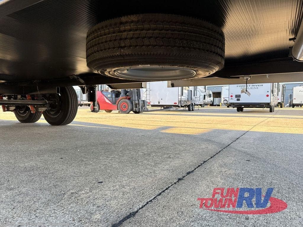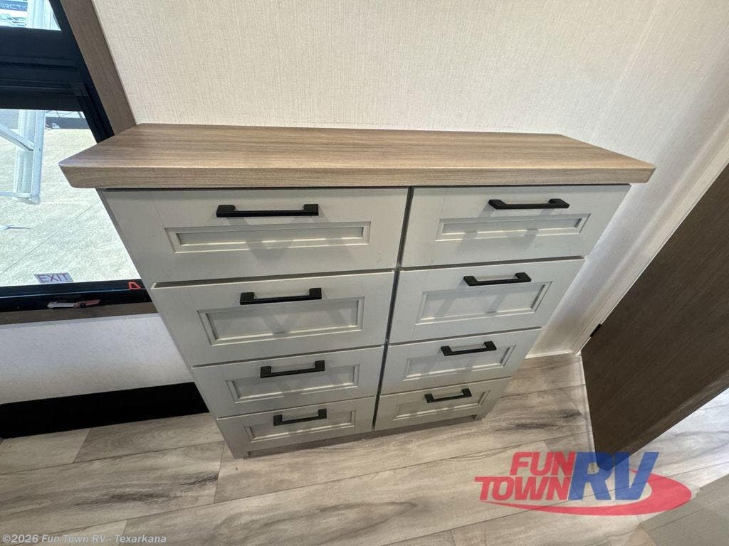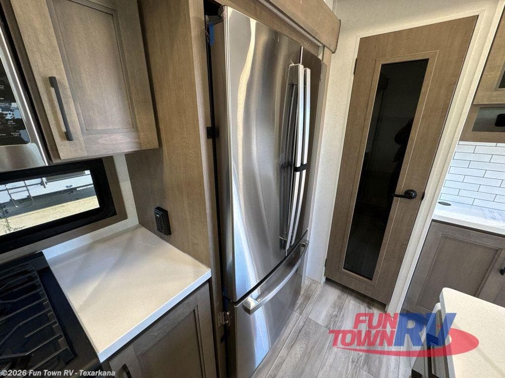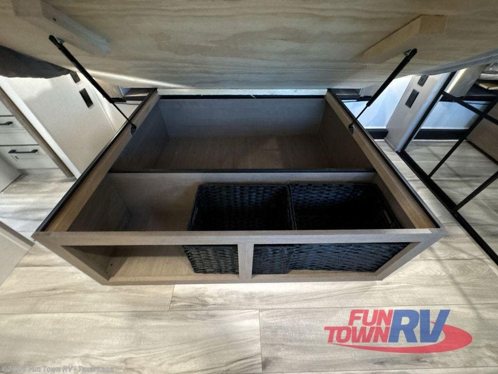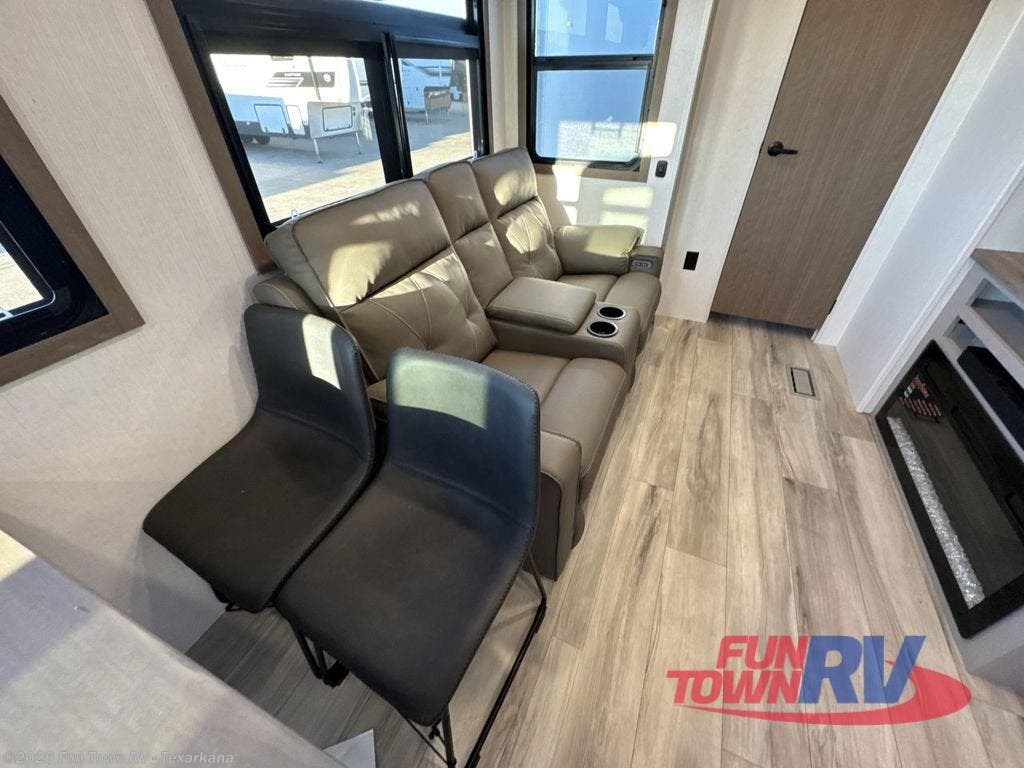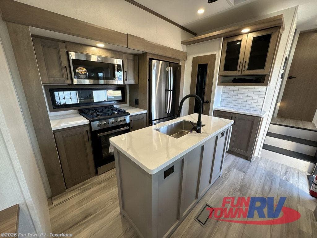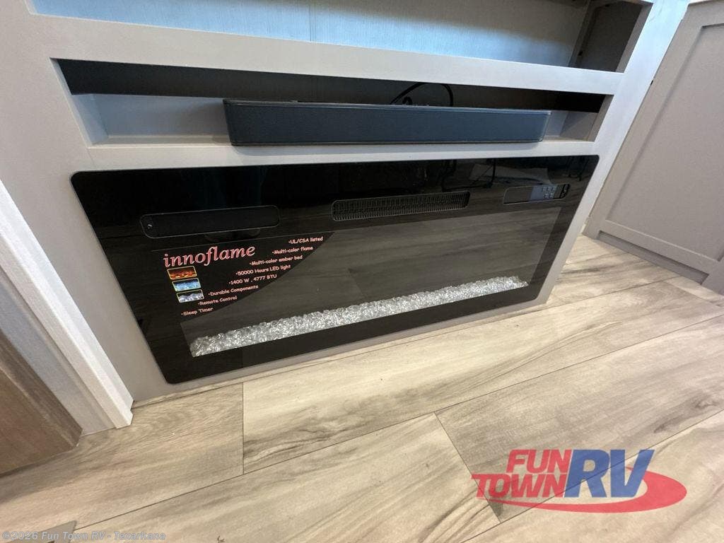 All of your friends and family can camp together in this fifth wheel! It features a rear private bunkhouse with a bunk above a hide-a-bed sofa, a full bathroom with a 30" x 36" shower, and an entertainment center with wardrobes on either side. There is also a folding bunk and a bunk over the outside kitchen. Across from the hide-a-bed sofa is an entertainment center with a 40" fireplace and a 43" smart TV to watch your favorite movies at night. The kitchen island will allow you to cook with ease and you can prepare your best meals with the four burner range with a 24" oven. The second bathroom has a residential shower with a seat and a linen closet to keep your towel close. Enjoy a good night's rest on the king bed slide in the front private bedroom which also has a dresser and a front wardrobe with washer and dryer prep!