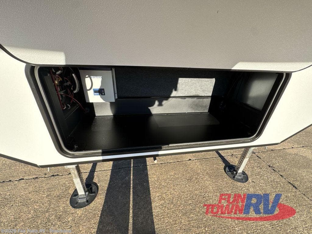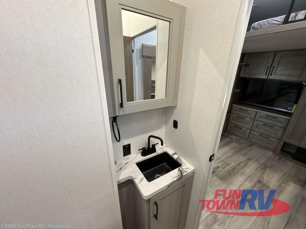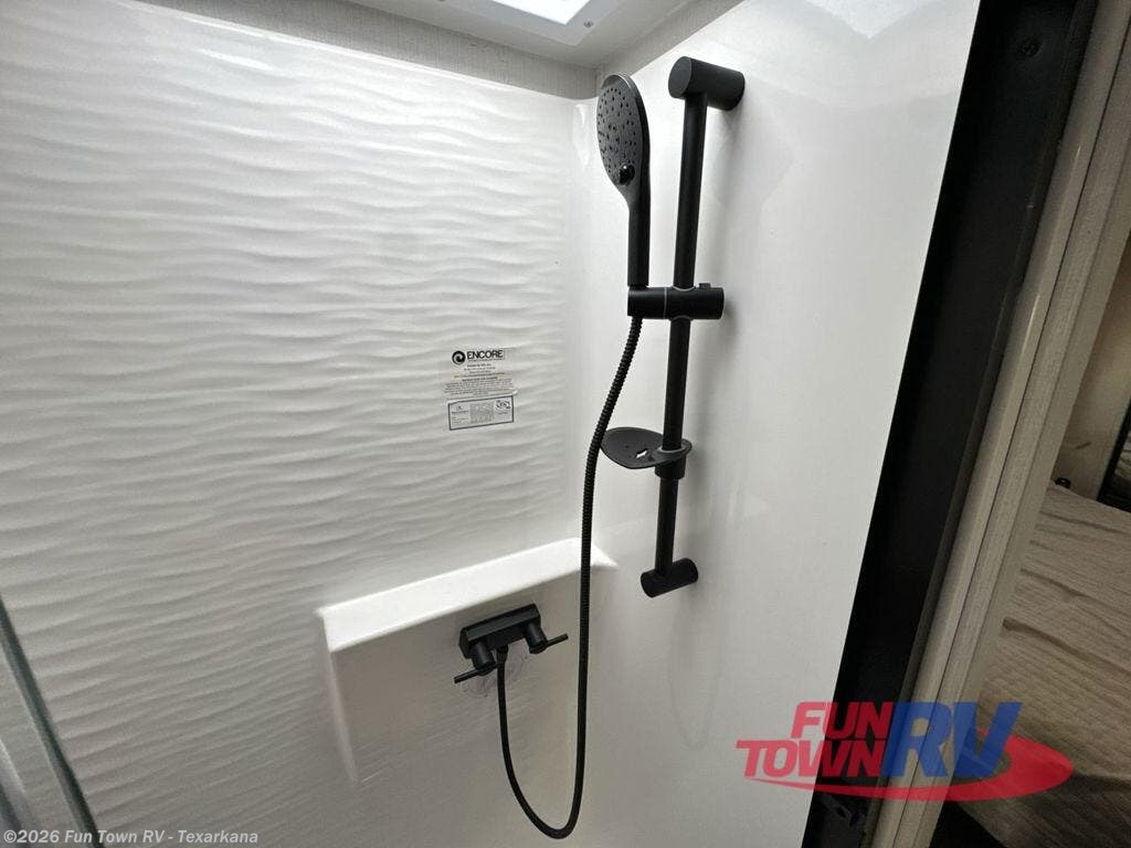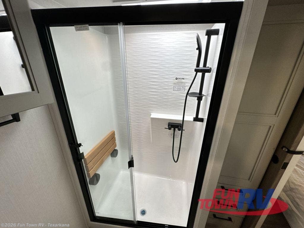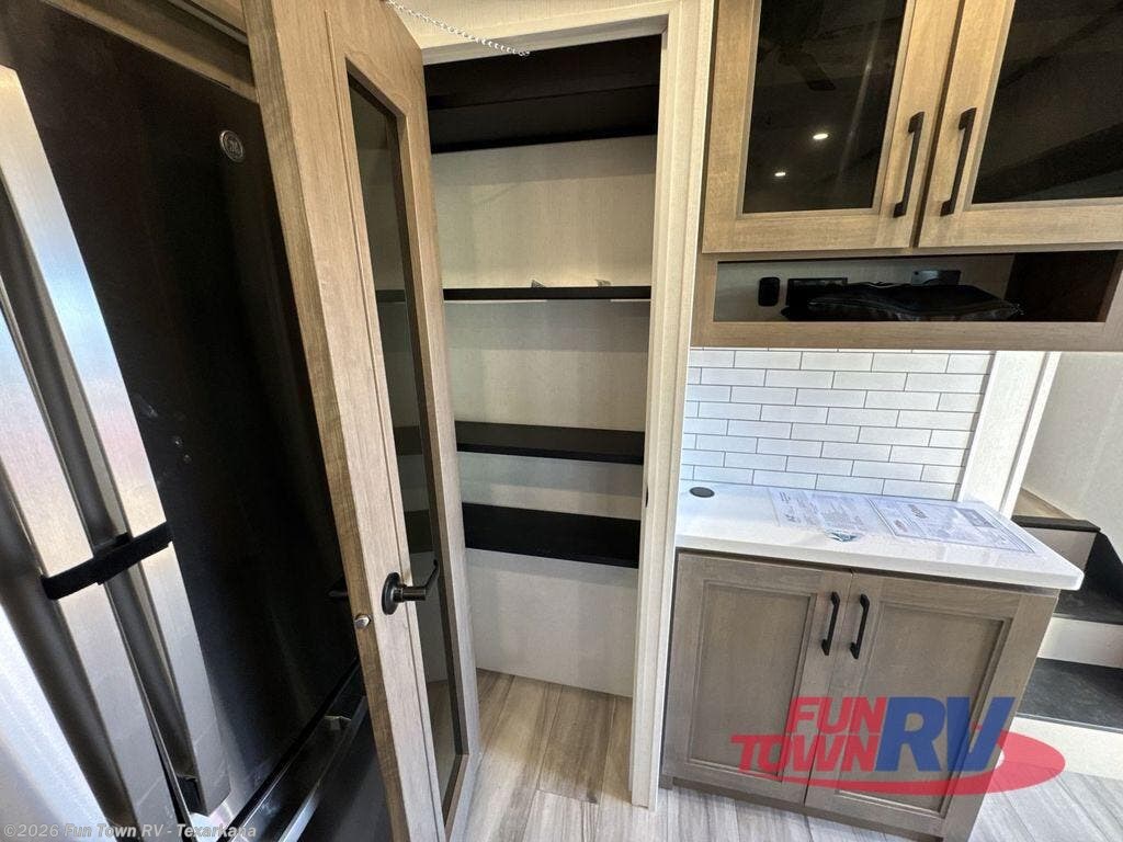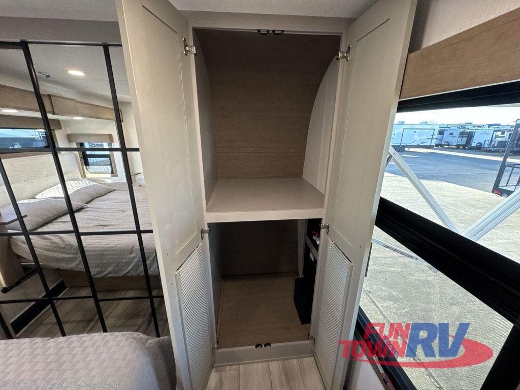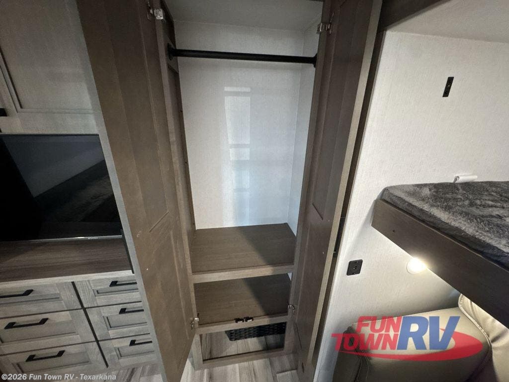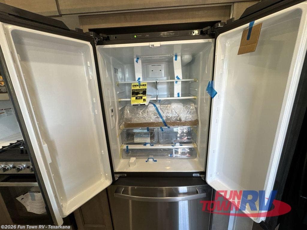 All of your friends and family can camp together in this fifth wheel! It features a rear private bunkhouse with a bunk above a hide-a-bed sofa, a full bathroom with a 30" x 36" shower, and an entertainment center with wardrobes on either side. There is also a folding bunk and a bunk over the outside kitchen. Across from the hide-a-bed sofa is an entertainment center with a 40" fireplace and a 43" smart TV to watch your favorite movies at night. The kitchen island will allow you to cook with ease and you can prepare your best meals with the four burner range with a 24" oven. The second bathroom has a residential shower with a seat and a linen closet to keep your towel close. Enjoy a good night's rest on the king bed slide in the front private bedroom which also has a dresser and a front wardrobe with washer and dryer prep!