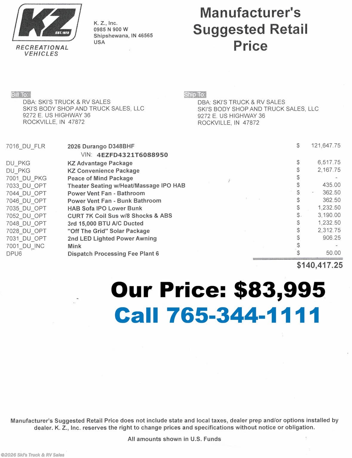 Request More Info on this 2026 K-Z Durango D348BHF Offered for sale by Ski's Truck & RV Sales