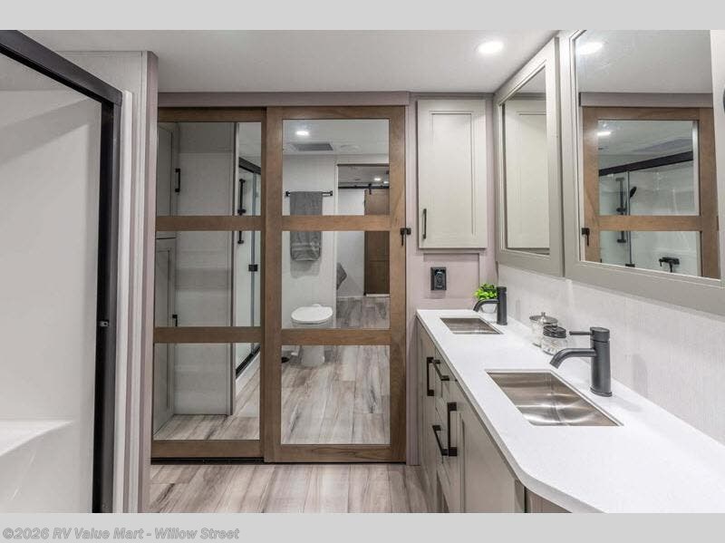 With a bath and a half, everyone will stay clean in this fifth wheel! The front full bathroom has a dual sink vanity for two to get ready at once, a 48" x 30" shower with a seat, and a front closet for your clothes. You can enter into the master suite from the bathroom and relax on the electric tilt king bed slide, store your things in the underbed drawers, and watch a movie in bed with the Smart LED TV. The half bathroom is directly off of the kitchen, and this room includes washer and dryer prep if you choose to add these appliances. You can prepare dinner at the four burner cooktop with a 24" oven and kitchen island, which also has a dishwasher for easy clean ups. Eat your meals at the sliding table/desk and then let your stomach settle while relaxing on the rear hide-a-bed sofa or theater seating across from the entertainment center with 40" fireplace!