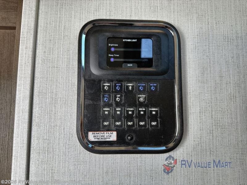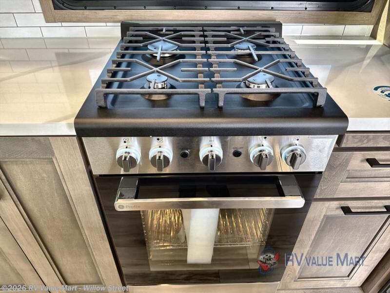At the front of this unit, the main bedroom offers a comfortable 70" x 80" electric tilt king bed for a restful night’s sleep, complete with drawers beneath for extra storage. A large front closet and a dresser provide even more space for clothing and essentials, and a 32" Smart LED TV lets you enjoy your favorite series right from bed. Down the hall, the bathroom and laundry center can be accessed from both the bedroom and main hallway for added convenience. The bathroom features a 48" x 30" residential shower with a built-in seat, along with dual sinks to make busy mornings easier. Moving to the rear, the spacious living and kitchen area opens up with dual opposing slides. One slide houses the entertainment center with a 40" fireplace and swing-arm TV, while beside it you’ll find generous countertop space, a 24" oven with four-burner range, a 30" convection microwave with air fryer, and a 26-cu. ft. refrigerator giving you everything you need to cook like a pro. A pantry and a coffee bar with wine storage add convenience for both quiet mornings and entertaining guests. At the center, the kitchen island offers even more prep space and includes a stainless steel dishwasher. The opposite slide features theater seating and a versatile sliding table/desk perfect for lounging, dining, or getting work done, and the rear hide-a-bed sofa provides additional seating during the day and converts into a comfortable sleeping space for guests at night.