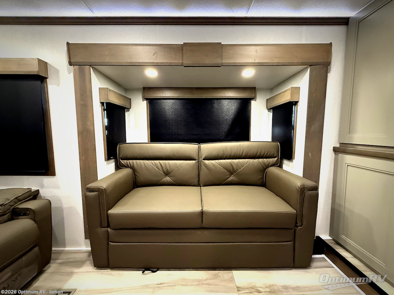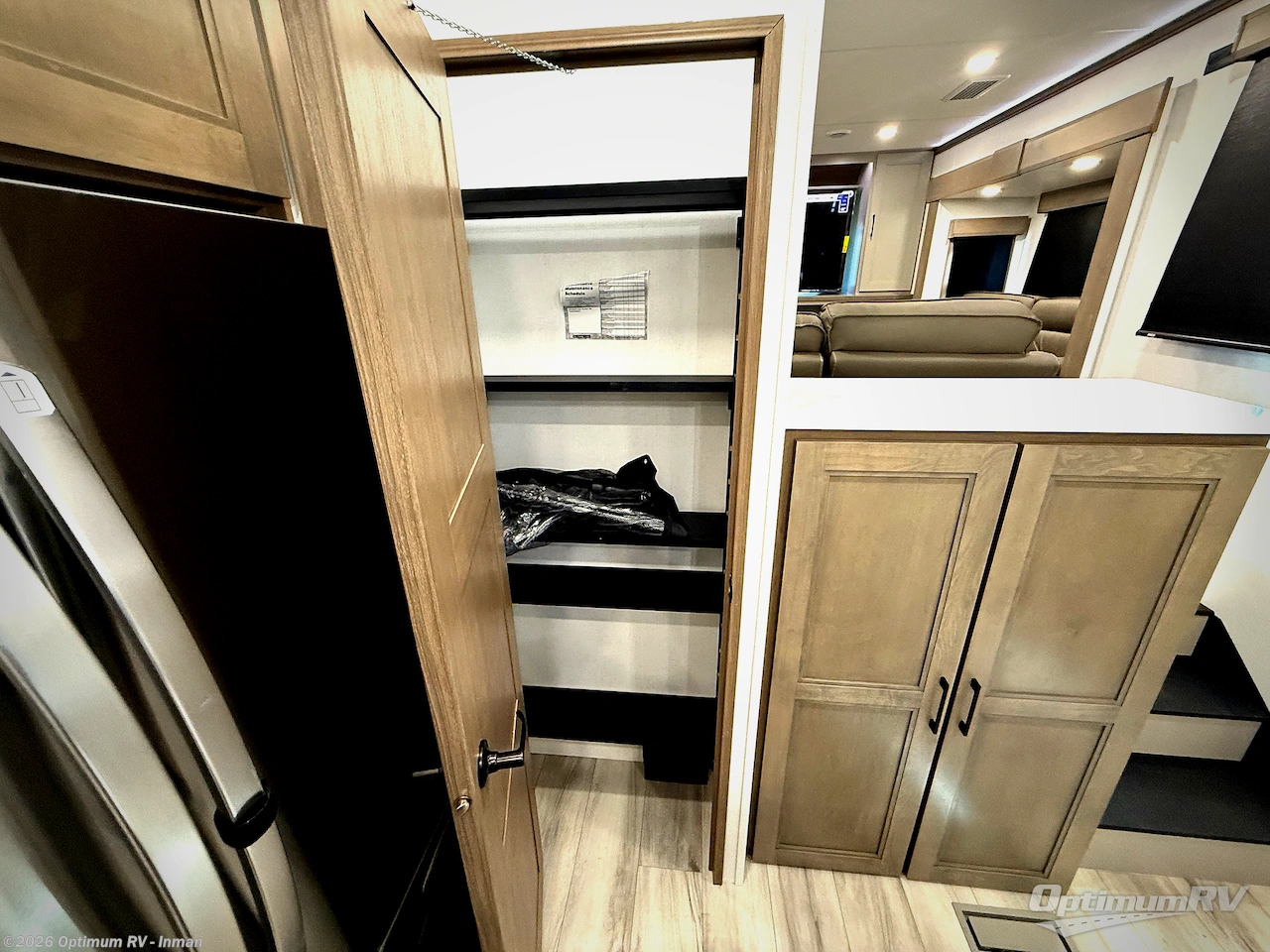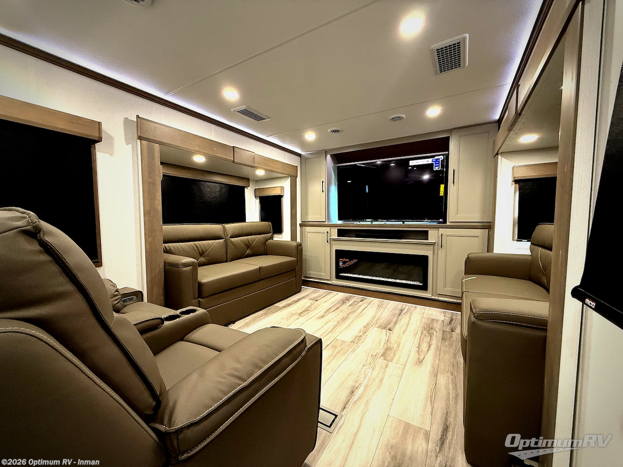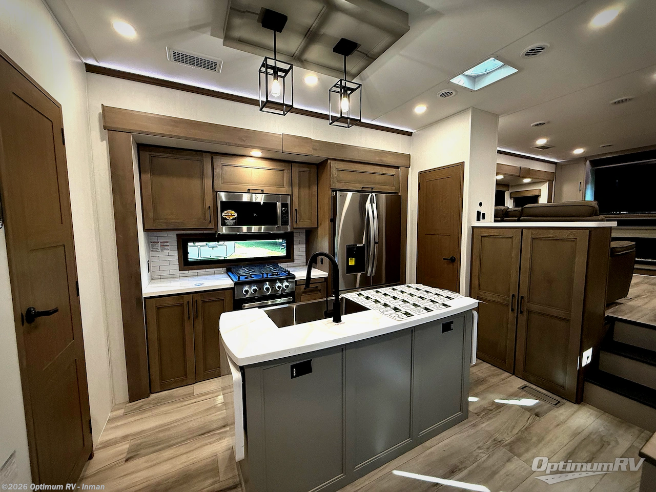 Fall in love with this unit's kitchen with residential appliances, a farmhouse stainless steel sink, a dishwasher, pantry, 26 cu refrigerator, and a sliding table/desk with chairs. Spend cozy entertainment nights watching the 65" LED TV with a fireplace below, a theater seating with USB ports, and two hide-a-bed sofa slides that widen this area so everyone can stretch out and relax. At night, retire to your private bedroom with a king electric tilt bed with drawers underneath, a 32" Smart LED TV, and, a closet, perfect for easy organization. Also, the full rear bathroom provides a residential shower with a seat plus linen storage, washer and dryer prep, and two sinks for more convenience. This model is also fitted with an exterior pass-through storage ideal for storing your things.