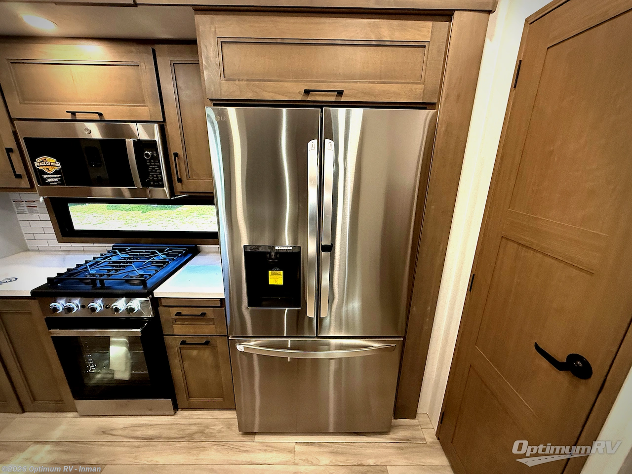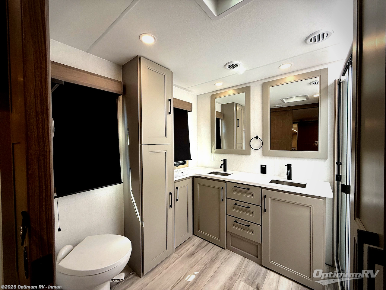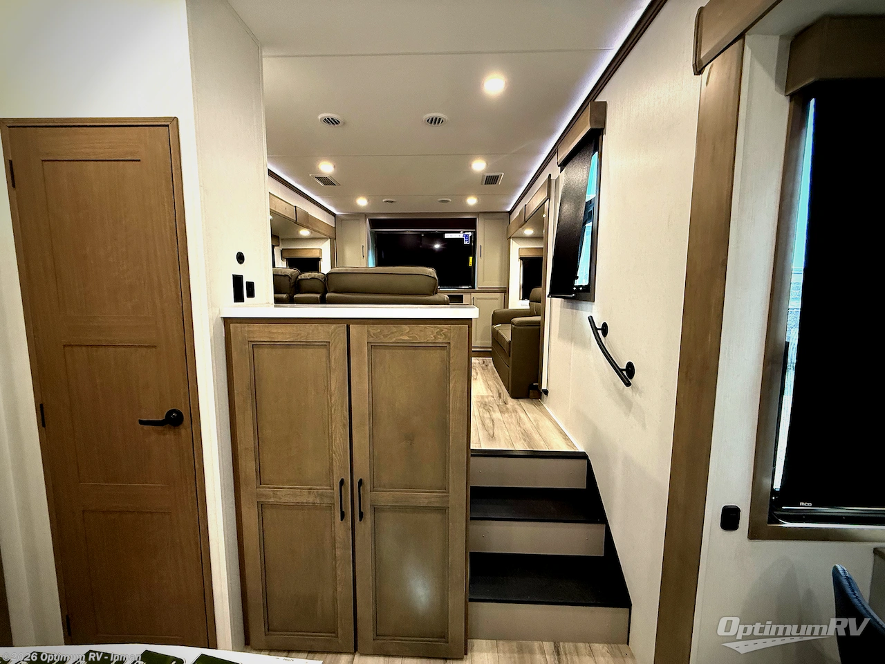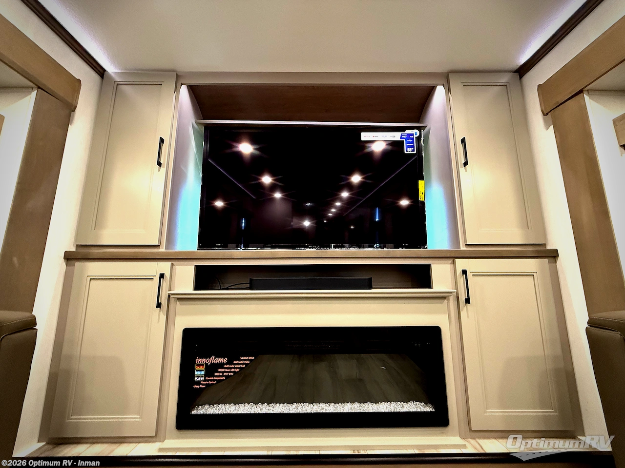 Fall in love with this unit's kitchen with residential appliances, a farmhouse stainless steel sink, a dishwasher, pantry, 26 cu refrigerator, and a sliding table/desk with chairs. Spend cozy entertainment nights watching the 65" LED TV with a fireplace below, a theater seating with USB ports, and two hide-a-bed sofa slides that widen this area so everyone can stretch out and relax. At night, retire to your private bedroom with a king electric tilt bed with drawers underneath, a 32" Smart LED TV, and, a closet, perfect for easy organization. Also, the full rear bathroom provides a residential shower with a seat plus linen storage, washer and dryer prep, and two sinks for more convenience. This model is also fitted with an exterior pass-through storage ideal for storing your things.