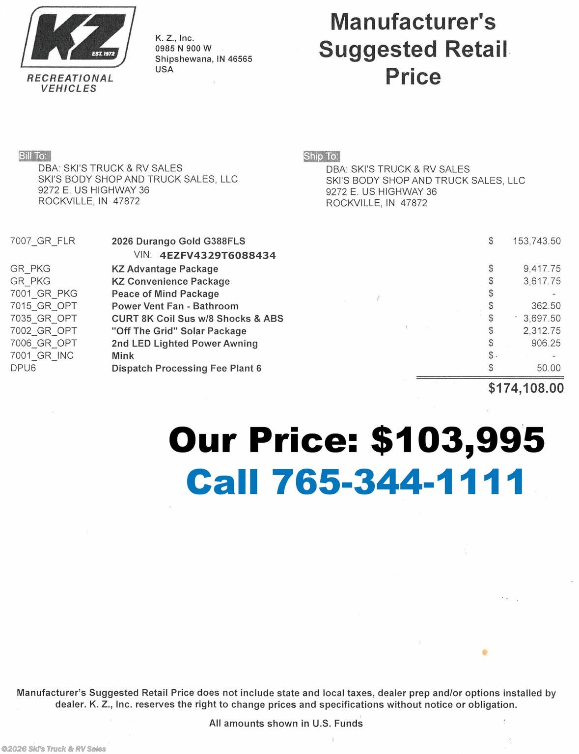 Request More Info on this 2026 K-Z Durango Gold G388FLS Offered for sale by Ski's Truck & RV Sales