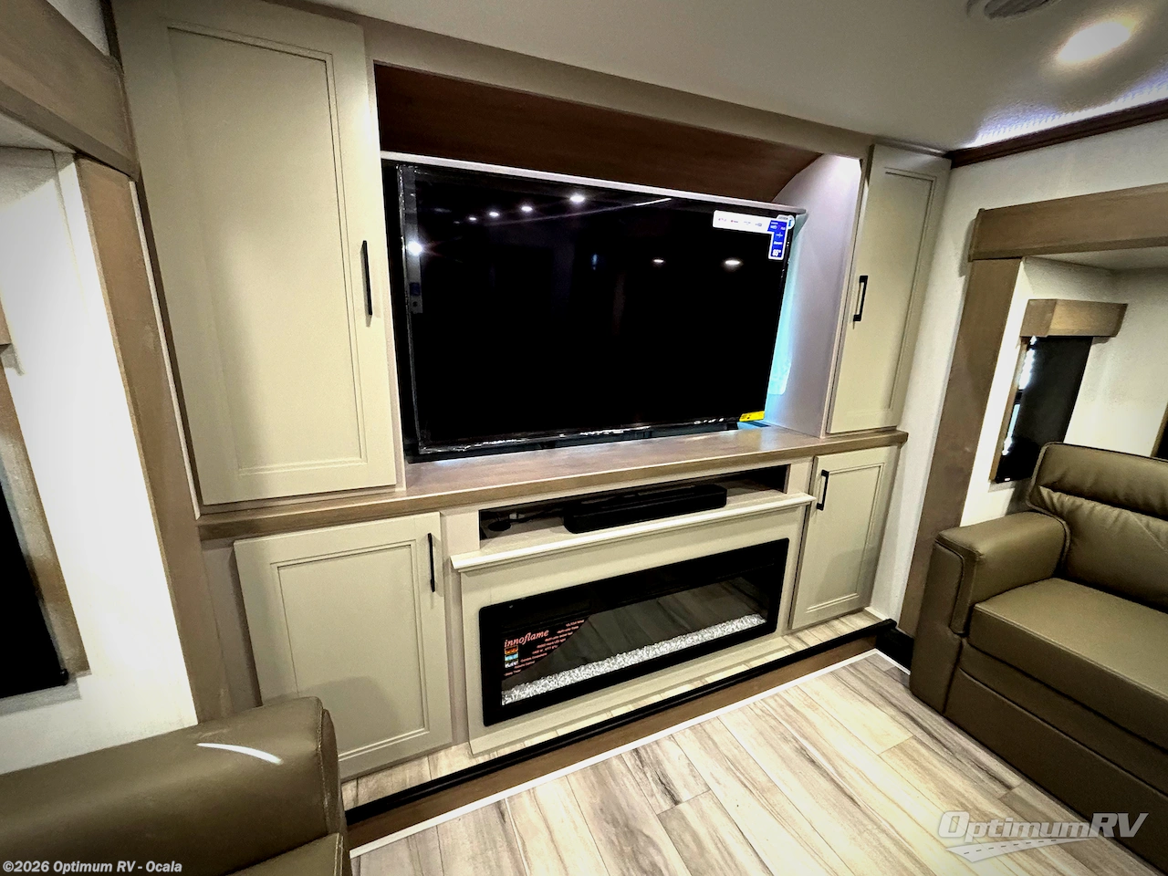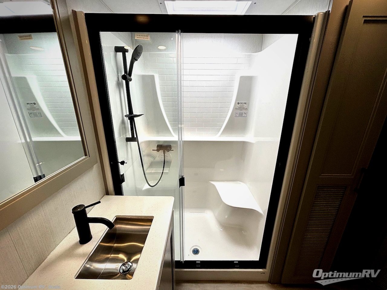 Fall in love with this unit's kitchen with residential appliances, a farmhouse stainless steel sink, a dishwasher, pantry, 26 cu refrigerator, and a sliding table/desk with chairs. Spend cozy entertainment nights watching the 65" LED TV with a fireplace below, a theater seating with USB ports, and two hide-a-bed sofa slides that widen this area so everyone can stretch out and relax. At night, retire to your private bedroom with a king electric tilt bed with drawers underneath, a 32" Smart LED TV, and, a closet, perfect for easy organization. Also, the full rear bathroom provides a residential shower with a seat plus linen storage, washer and dryer prep, and two sinks for more convenience. This model is also fitted with an exterior pass-through storage ideal for storing your things.