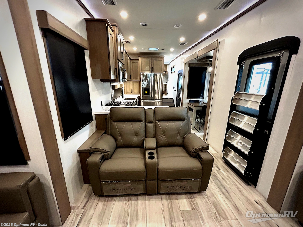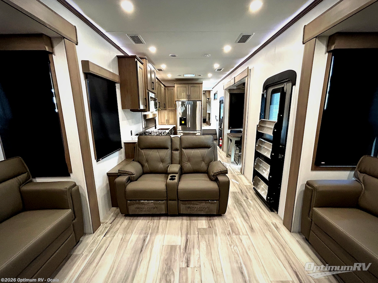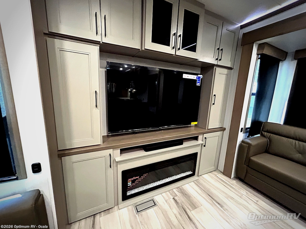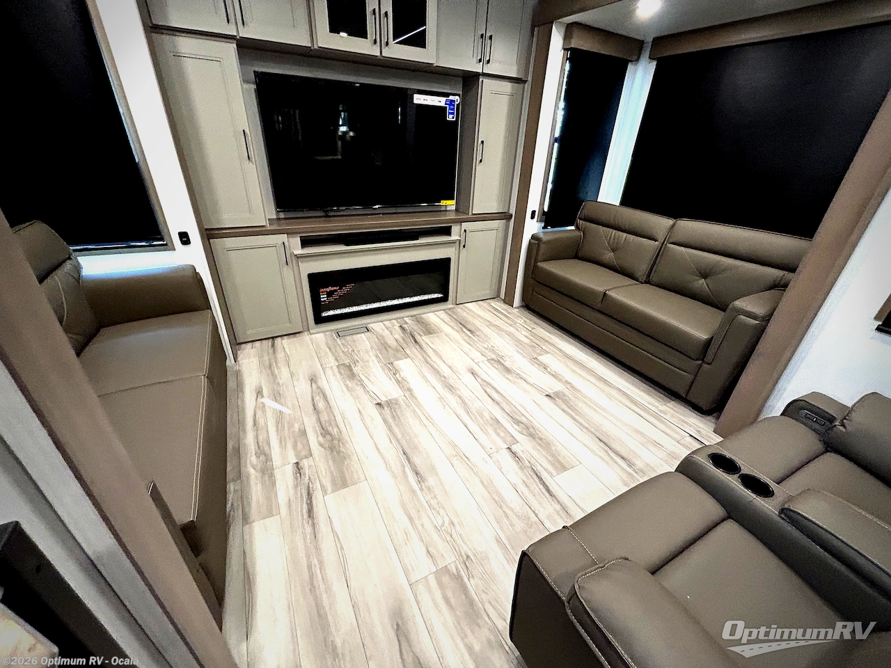 Experience the pinnacle of luxury fifth-wheel living! Retreat to the serene bedroom, featuring an electric tilt king bed with drawers under the bed, a spacious wardrobe, and washer/dryer prep. Enjoy entertainment on the 39” Smart LED TV and ample storage in the dresser. The gourmet kitchen is equipped with a pantry, 26 cu. refrigerator, convection microwave, and sliding table/desk for effortless dining and work-from-home convenience. The living room is a haven of relaxation, boasting a stunning 65” Smart LED TV, warm fireplace, theater seating, and double hide-a-bed sofas ideal for hosting guests with ease. Unwind in style in the full bathroom, featuring a dual sink vanity and ample storage. Also, enjoy the convenience of two entry/two exit doors. This fifth wheel is a masterpiece of comfort, style, and functionality, perfect for full-time living.