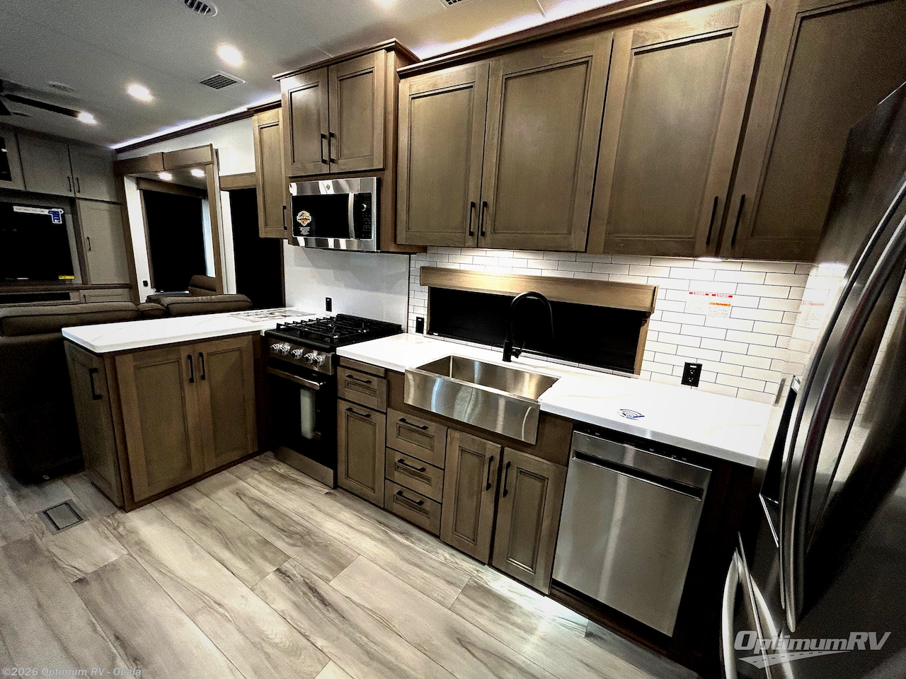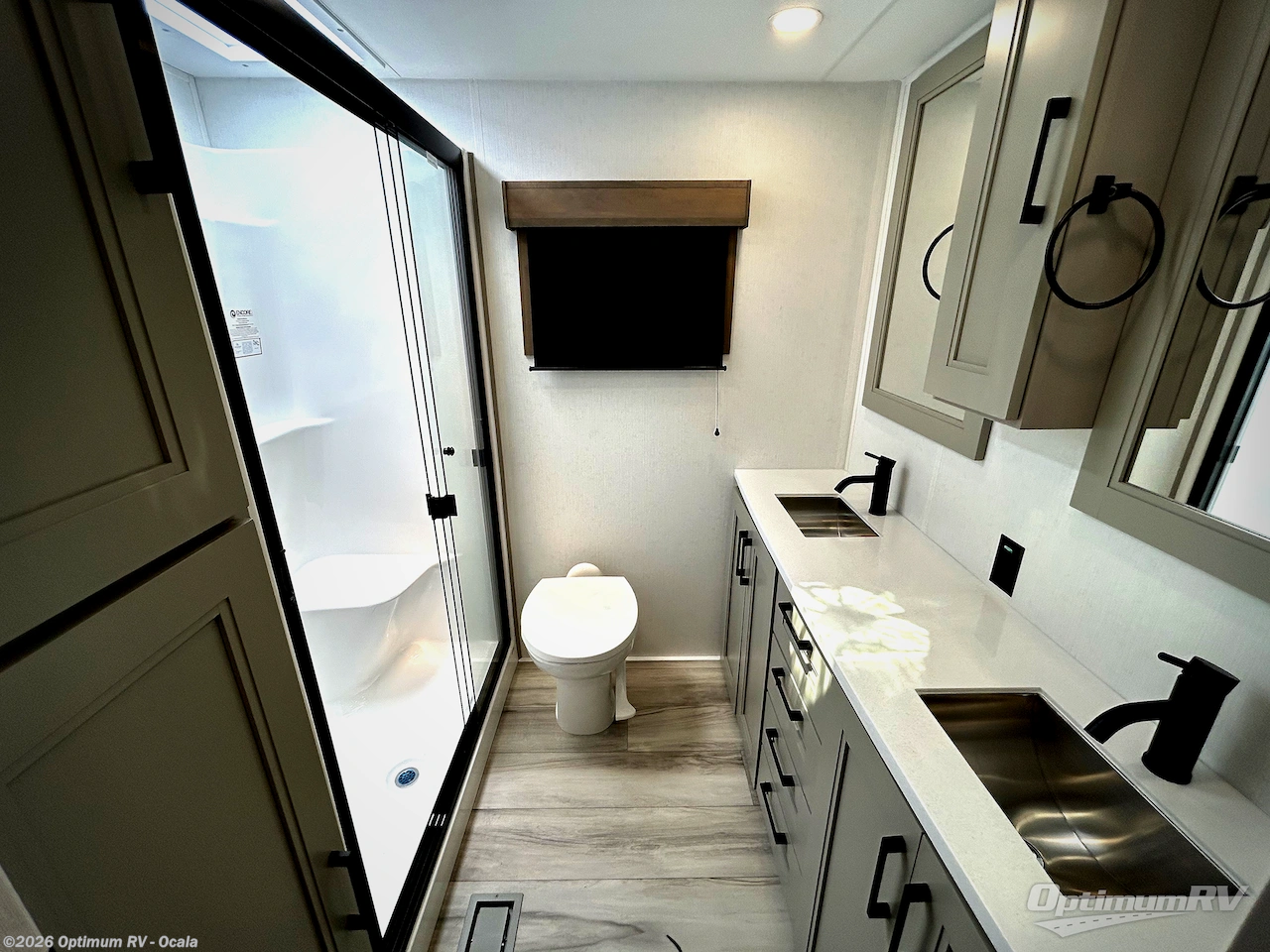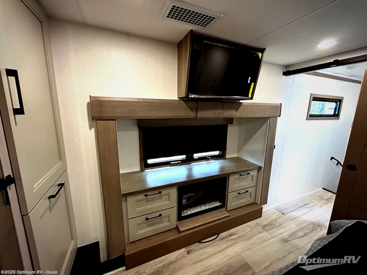Experience the pinnacle of luxury fifth-wheel living! Retreat to the serene bedroom, featuring an electric tilt king bed with drawers under the bed, a spacious wardrobe, and washer/dryer prep. Enjoy entertainment on the 39” Smart LED TV and ample storage in the dresser. The gourmet kitchen is equipped with a pantry, 26 cu. refrigerator, convection microwave, and sliding table/desk for effortless dining and work-from-home convenience. The living room is a haven of relaxation, boasting a stunning 65” Smart LED TV, warm fireplace, theater seating, and double hide-a-bed sofas ideal for hosting guests with ease. Unwind in style in the full bathroom, featuring a dual sink vanity and ample storage. Also, enjoy the convenience of two entry/two exit doors. This fifth wheel is a masterpiece of comfort, style, and functionality, perfect for full-time living.