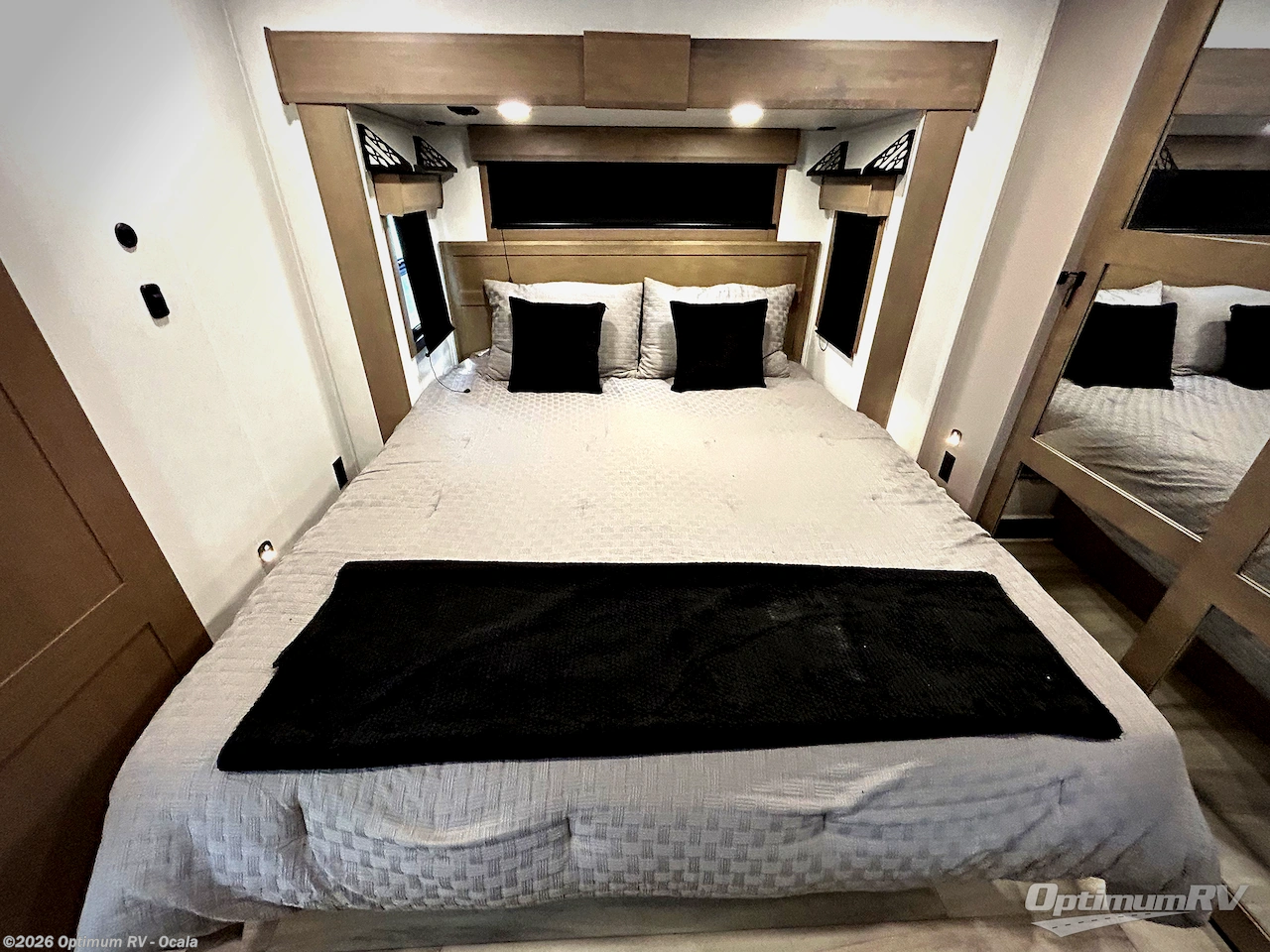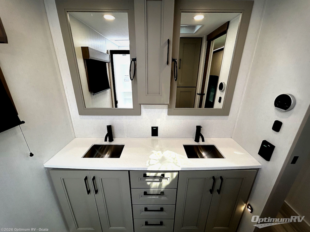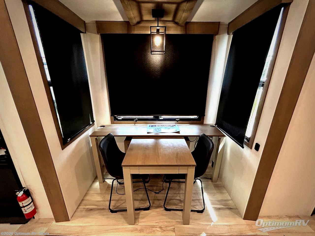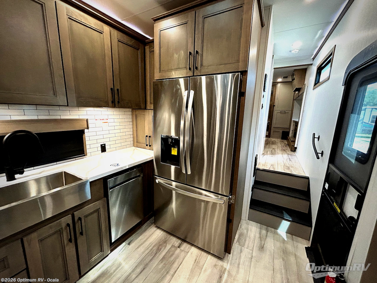 Experience the pinnacle of luxury fifth-wheel living! Retreat to the serene bedroom, featuring an electric tilt king bed with drawers under the bed, a spacious wardrobe, and washer/dryer prep. Enjoy entertainment on the 39” Smart LED TV and ample storage in the dresser. The gourmet kitchen is equipped with a pantry, 26 cu. refrigerator, convection microwave, and sliding table/desk for effortless dining and work-from-home convenience. The living room is a haven of relaxation, boasting a stunning 65” Smart LED TV, warm fireplace, theater seating, and double hide-a-bed sofas ideal for hosting guests with ease. Unwind in style in the full bathroom, featuring a dual sink vanity and ample storage. Also, enjoy the convenience of two entry/two exit doors. This fifth wheel is a masterpiece of comfort, style, and functionality, perfect for full-time living.