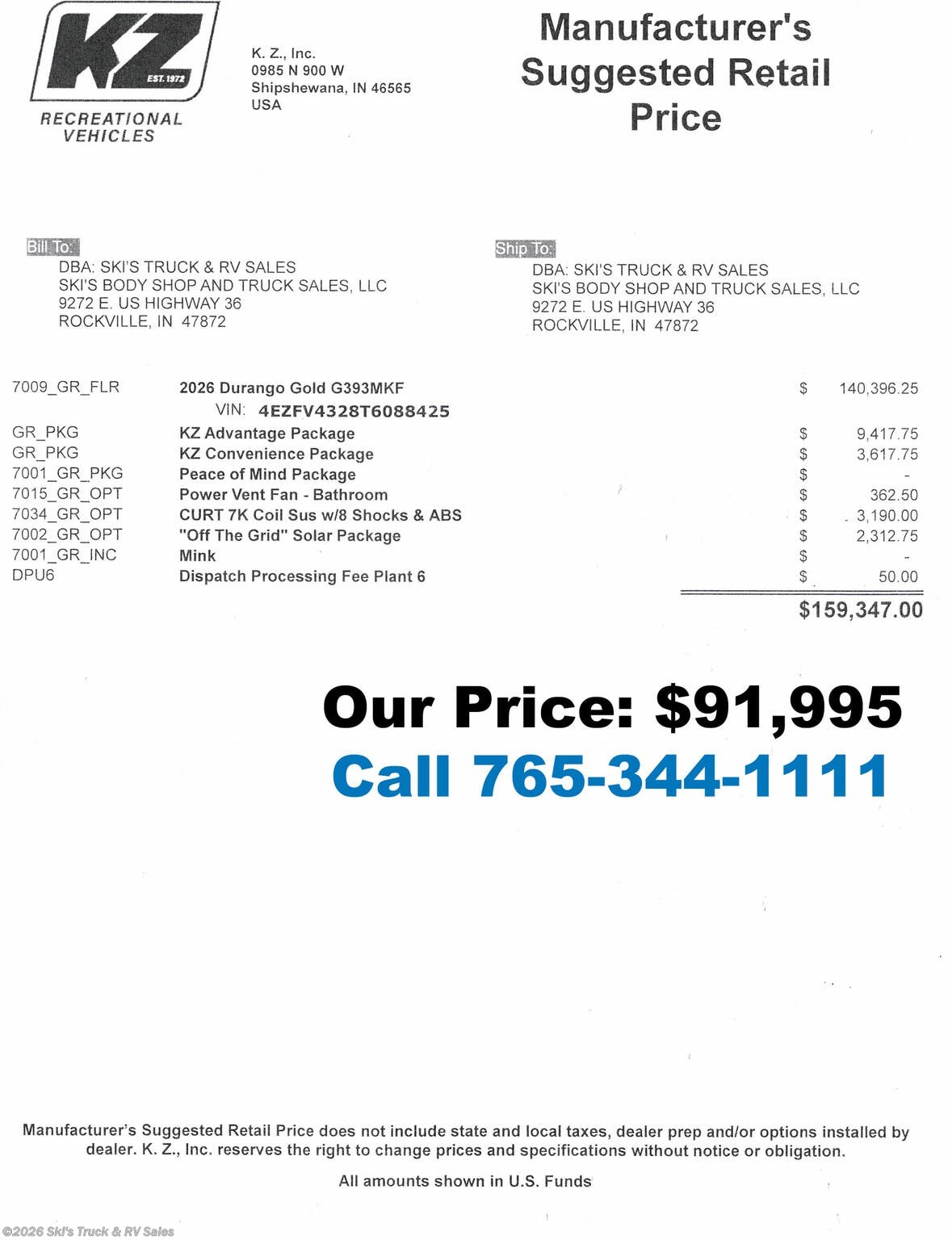 Request More Info on this 2026 K-Z Durango Gold G393MKF Offered for sale by Ski's Truck & RV Sales