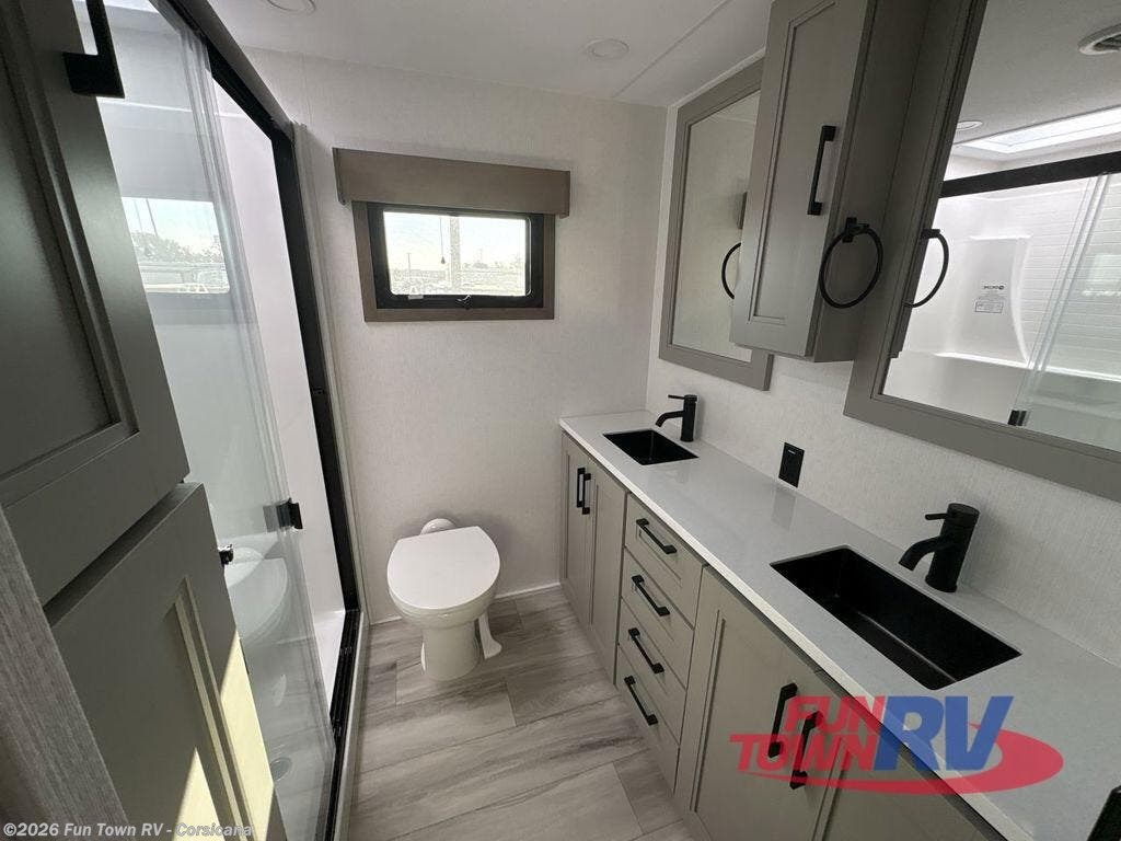 Experience the pinnacle of luxury fifth-wheel living! Retreat to the serene bedroom, featuring an electric tilt king bed with drawers under the bed, a spacious wardrobe, and washer/dryer prep. Enjoy entertainment on the 39” Smart LED TV and ample storage in the dresser. The gourmet kitchen is equipped with a pantry, 26 cu. refrigerator, convection microwave, and sliding table/desk for effortless dining and work-from-home convenience. The living room is a haven of relaxation, boasting a stunning 65” Smart LED TV, warm fireplace, theater seating, and double hide-a-bed sofas ideal for hosting guests with ease. Unwind in style in the full bathroom, featuring a dual sink vanity and ample storage. Also, enjoy the convenience of two entry/two exit doors. This fifth wheel is a masterpiece of comfort, style, and functionality, perfect for full-time living.