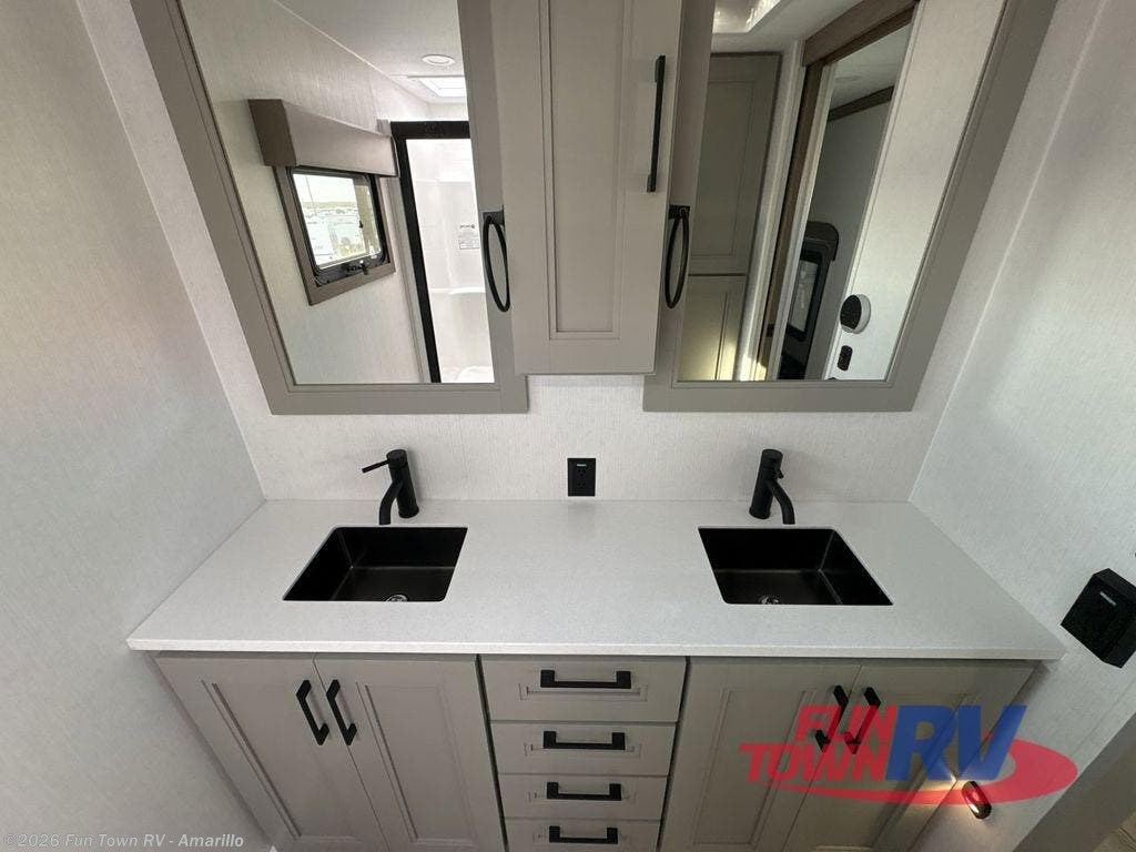 Experience the pinnacle of luxury fifth-wheel living! Retreat to the serene bedroom, featuring an electric tilt king bed with drawers under the bed, a spacious wardrobe, and washer/dryer prep. Enjoy entertainment on the 39” Smart LED TV and ample storage in the dresser. The gourmet kitchen is equipped with a pantry, 26 cu. refrigerator, convection microwave, and sliding table/desk for effortless dining and work-from-home convenience. The living room is a haven of relaxation, boasting a stunning 65” Smart LED TV, warm fireplace, theater seating, and double hide-a-bed sofas ideal for hosting guests with ease. Unwind in style in the full bathroom, featuring a dual sink vanity and ample storage. Also, enjoy the convenience of two entry/two exit doors. This fifth wheel is a masterpiece of comfort, style, and functionality, perfect for full-time living.