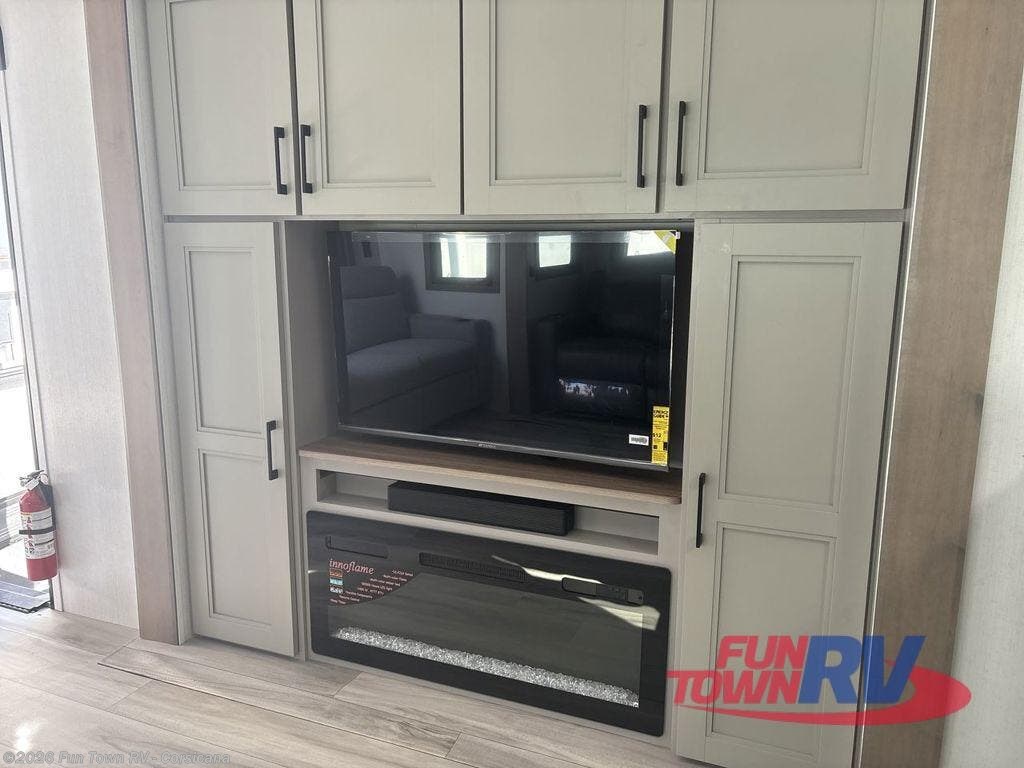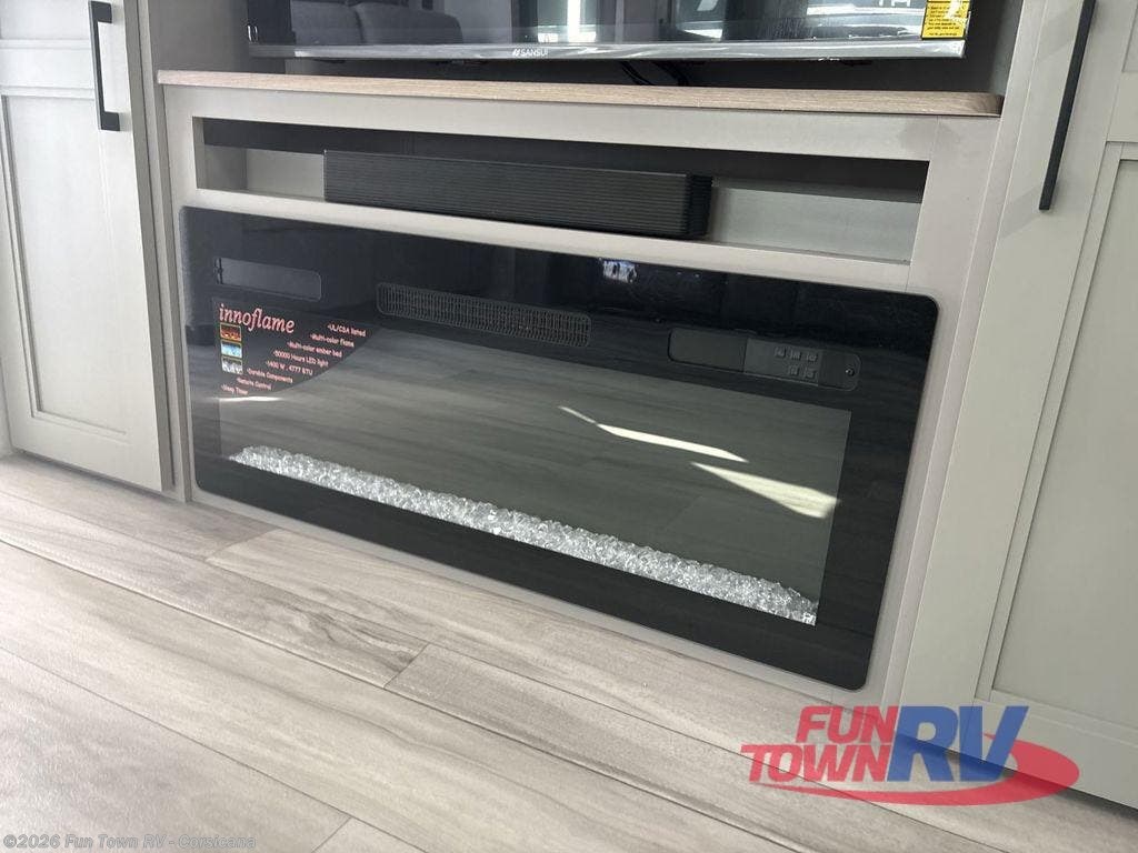 Escape the hustle and bustle of city life for weekends in this cozy fifth wheel. The dual opposing slides in the main living area will create an open floorplan, and you can choose an optional 40" fireplace here for a more at-home feel. There is also an entertainment center and a 43" Smart LED TV for movie night and a dinette with EZ adjust table to dine at. If the weather is nice, head outdoors to relax under the 14' power awning while the chef of your group cooks on the outside kitchen with a smart TV. The rear kitchen inside features tons of counter space, an 12 cu. ft. refrigerator, a drop-in cooktop, and a 24" microwave. And don't overlook the front private bedroom with its slide out wardrobe, a closet with washer and dryer prep, and a queen bed!