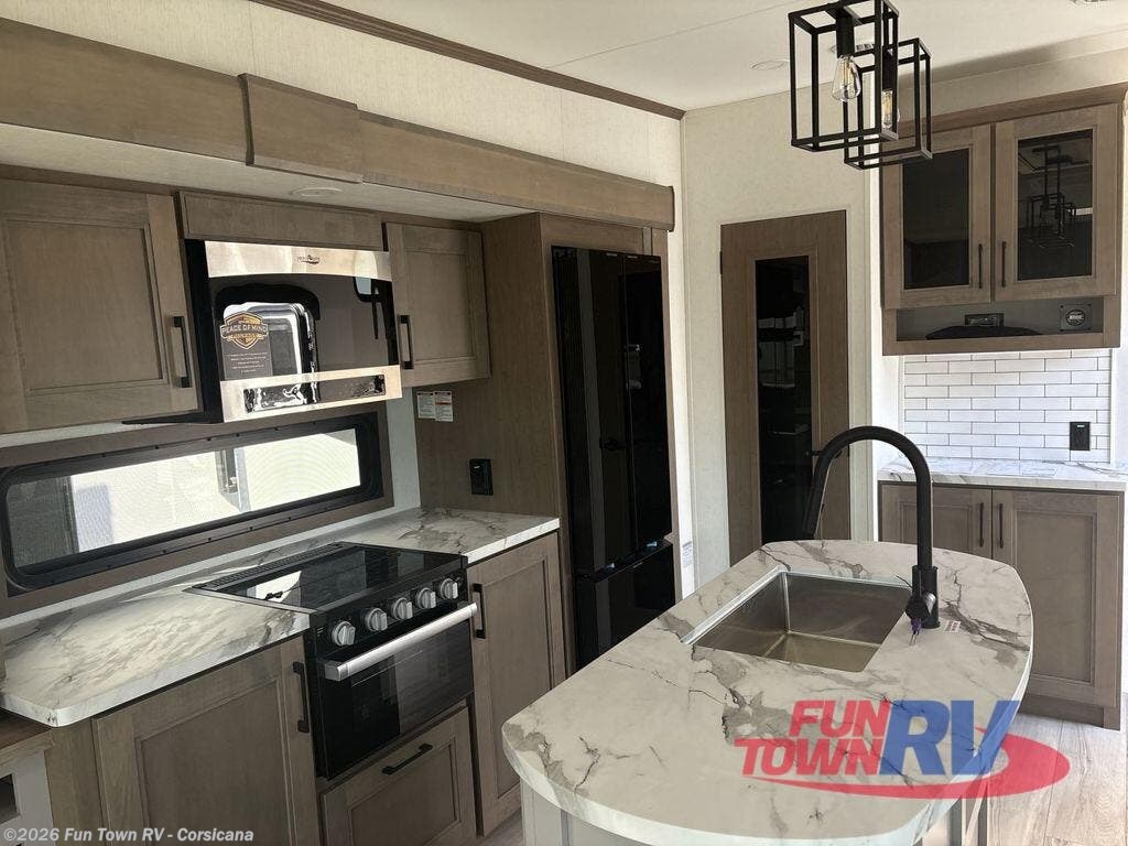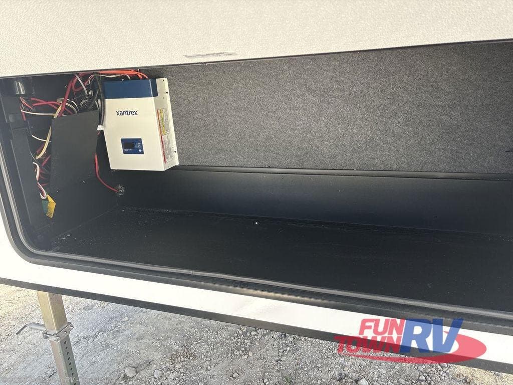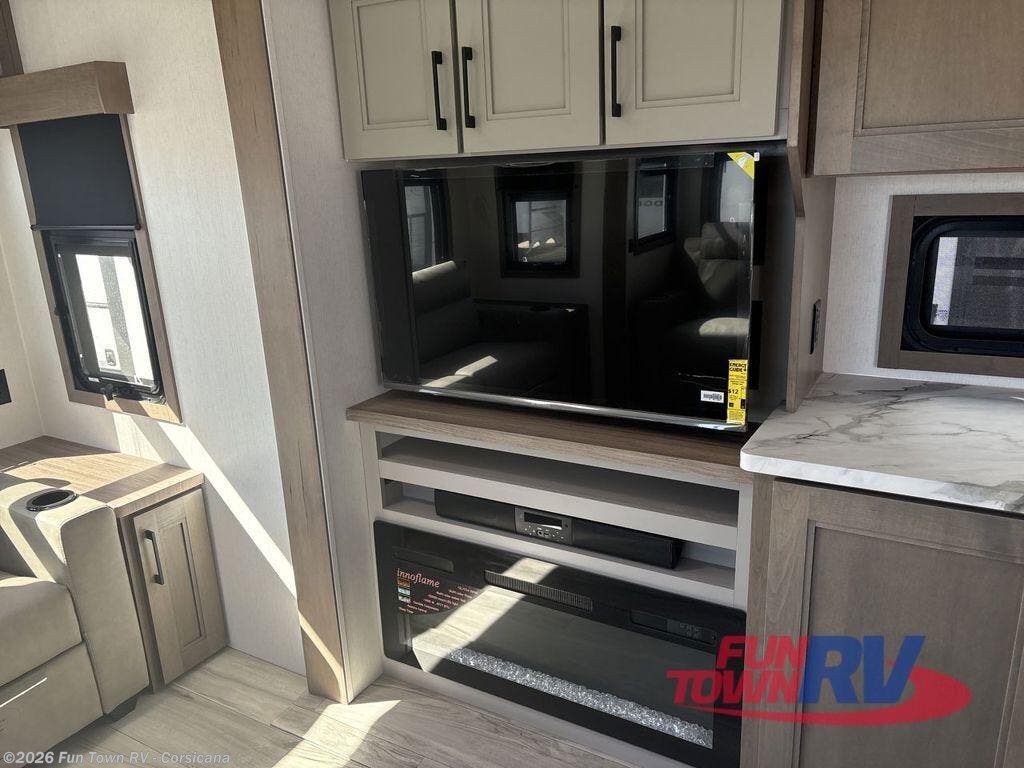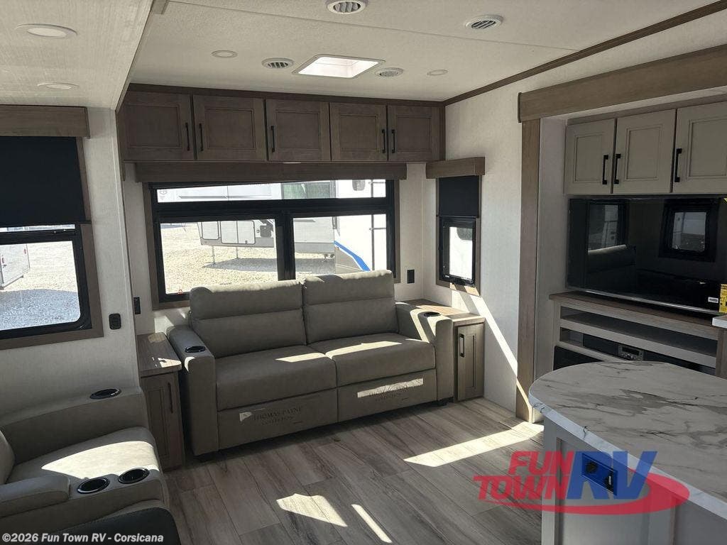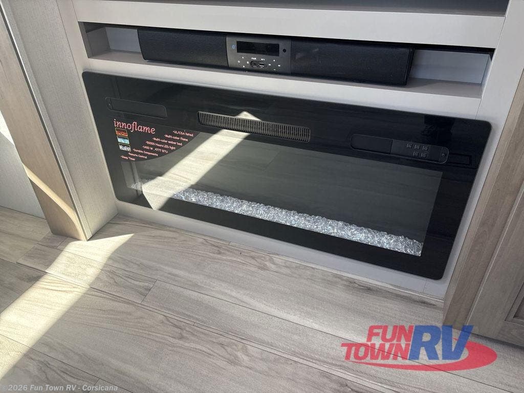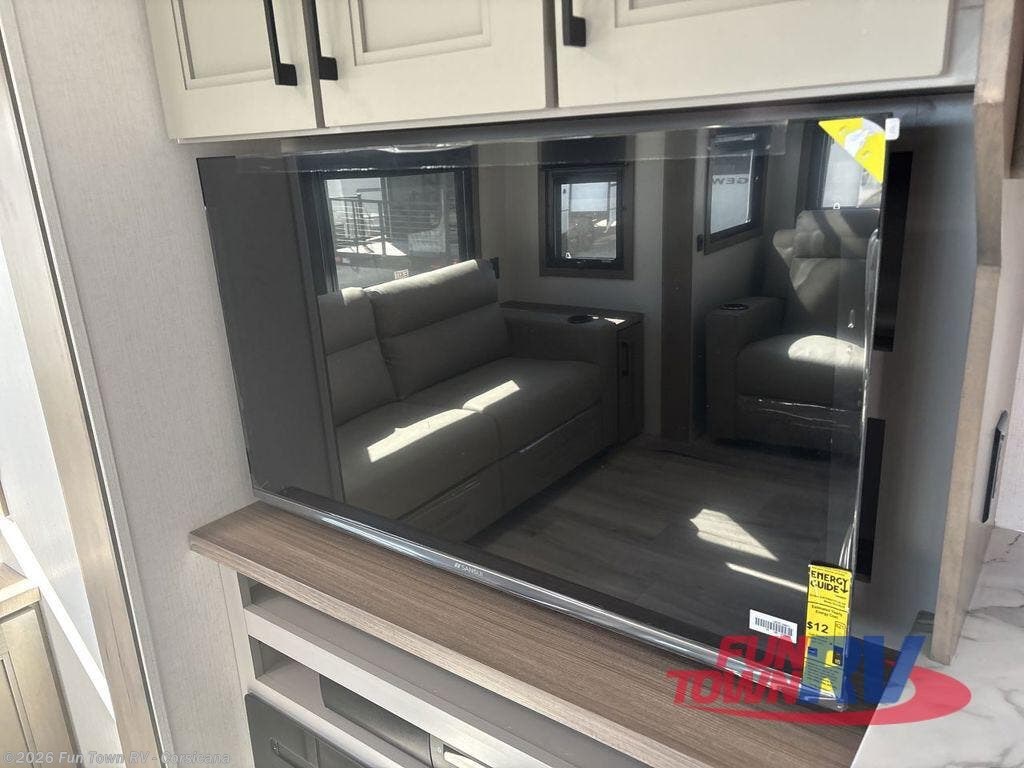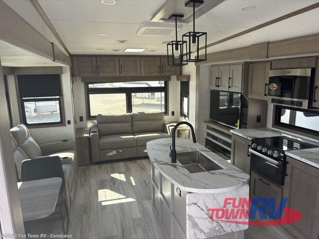 This fifth wheel will feel just like home with its kitchen island, theater seating, and front private bedroom! If you have any overnight guests, they can sleep on the rear hide-a-bed sofa. There is also a dinette with EZ adjust table for dining space, an entertainment center with a 43" Smart LED TV and an optional 40" fireplace. You will love the extra features that have been added, like the hutch in the kitchen for extra counter and storage space, the shower skylight in the spacious full bath, and the slide out wardrobe in the front bedroom!