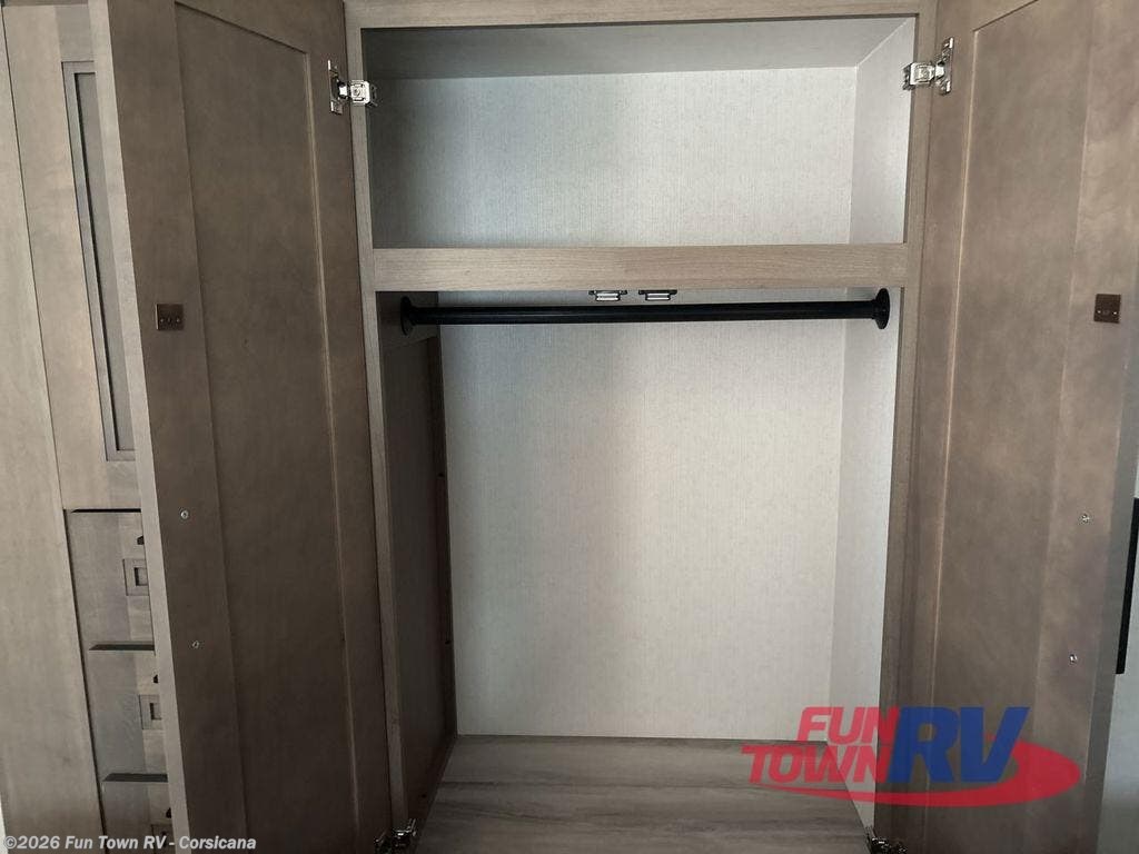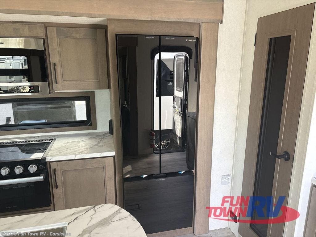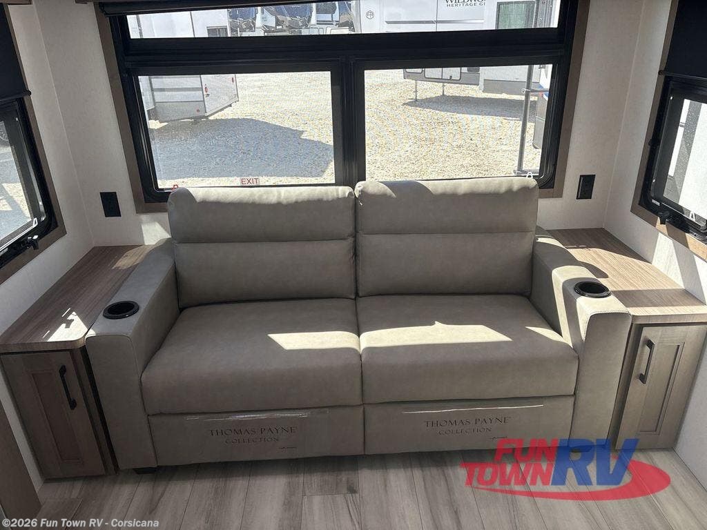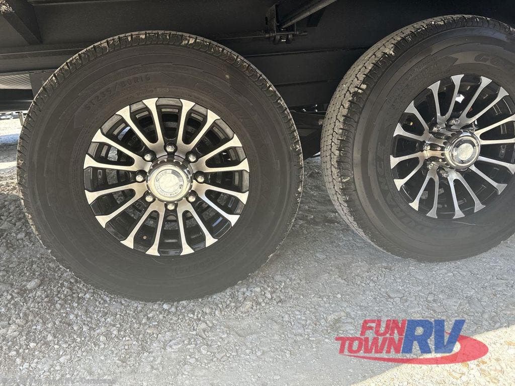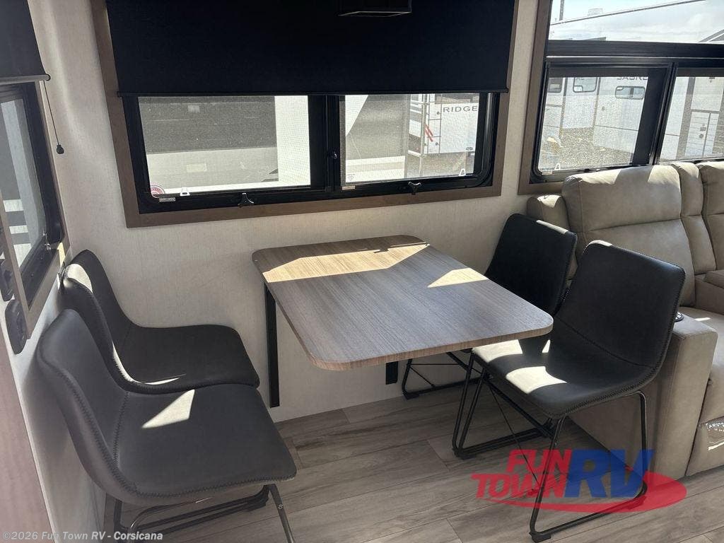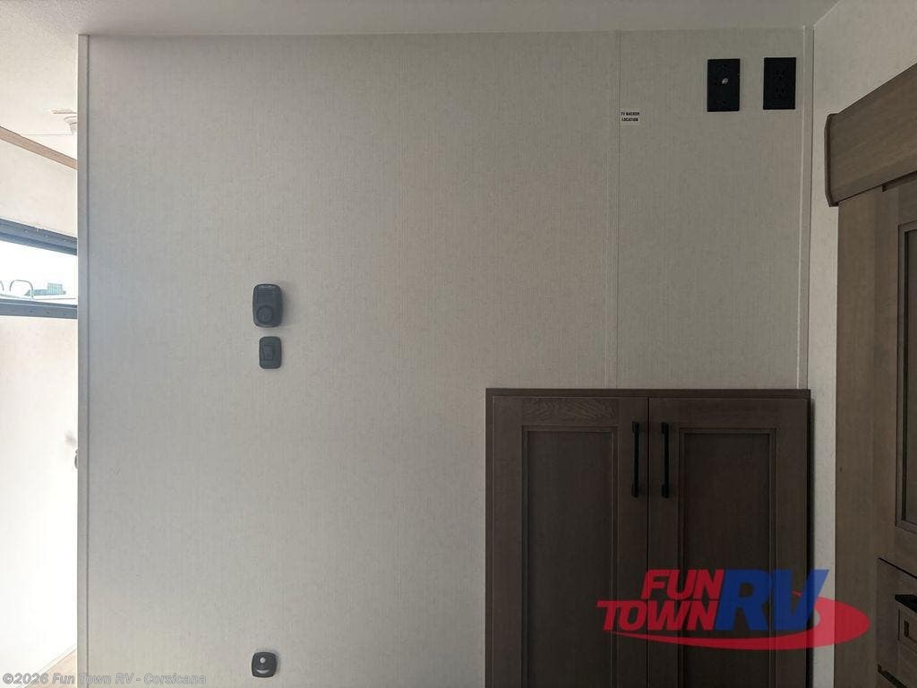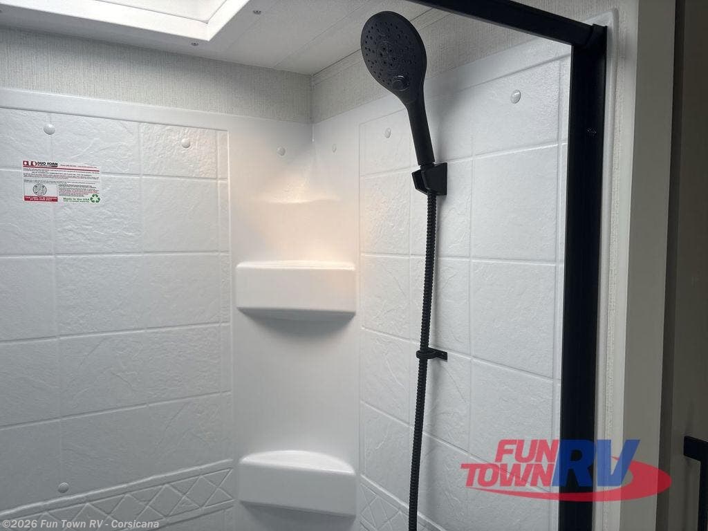 This fifth wheel will feel just like home with its kitchen island, theater seating, and front private bedroom! If you have any overnight guests, they can sleep on the rear hide-a-bed sofa. There is also a dinette with EZ adjust table for dining space, an entertainment center with a 43" Smart LED TV and an optional 40" fireplace. You will love the extra features that have been added, like the hutch in the kitchen for extra counter and storage space, the shower skylight in the spacious full bath, and the slide out wardrobe in the front bedroom!