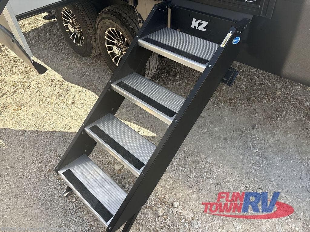 Each Durango Half-Ton fifth wheel by KZ provides lightweight towing with interior luxuries galore! Controlling the functions of your unit will be a breeze with the KZ Engage powered by OneControl that includes new integrated buttons & screen to control awnings, lights, tanks, and more. There are so many exterior conveniences to make each trip enjoyable, like the heated water convenience center, and the flip-up main entry steps! Durable construction includes Tufflex PVC roofing, Pex® in-floor heated waterlines & kitchen gray pipes, and a reinforced heavy-duty fiberglass front cap. The interior will feel more like a residential home with new blancher maple & morel fog cabinets, seamless countertops, a spacious shower, a redesigned front bedroom, and smart storage spaces! You can also customize your fifth wheel to fit your needs with available options, such as, generator prep, wireless backup camera prep, a 32" exterior TV with bracket, and so much more!