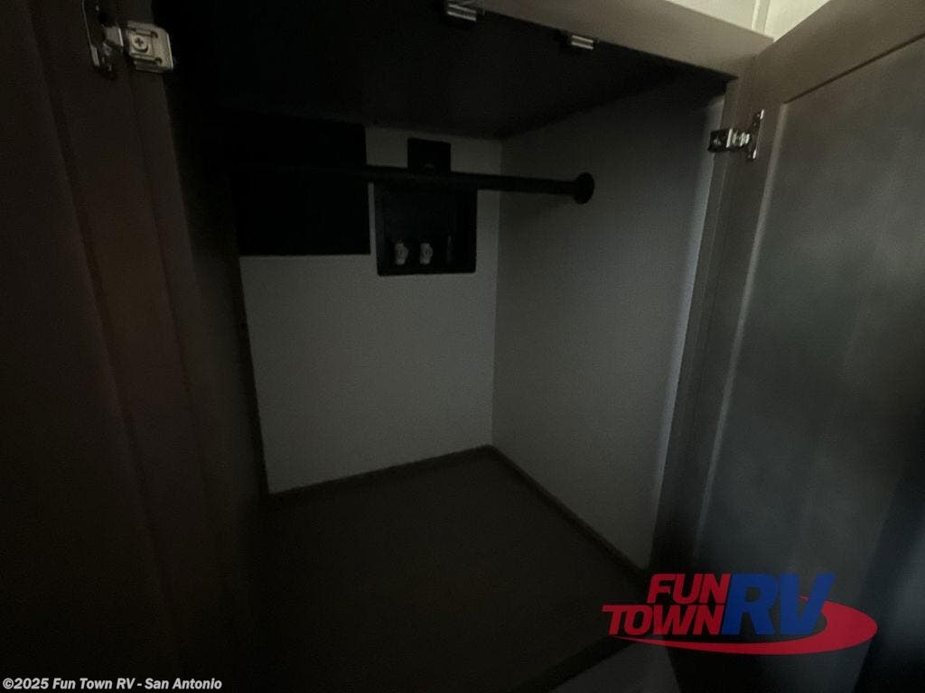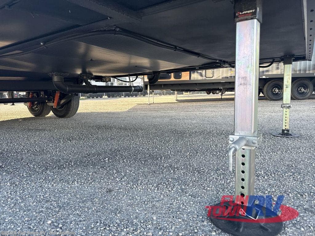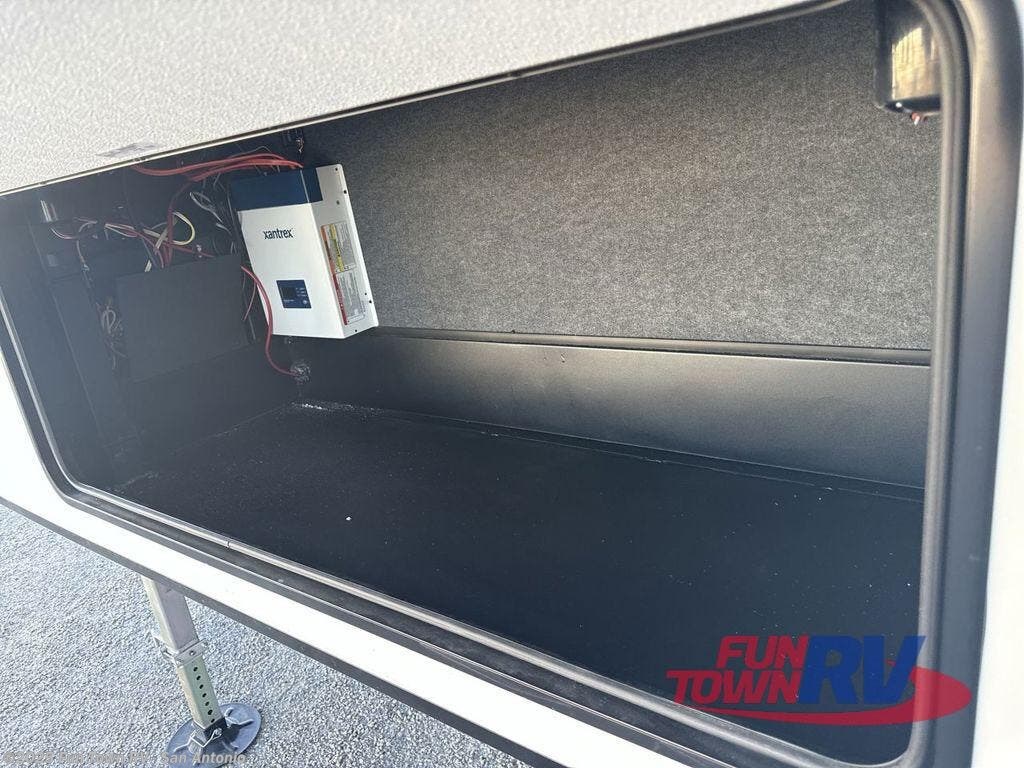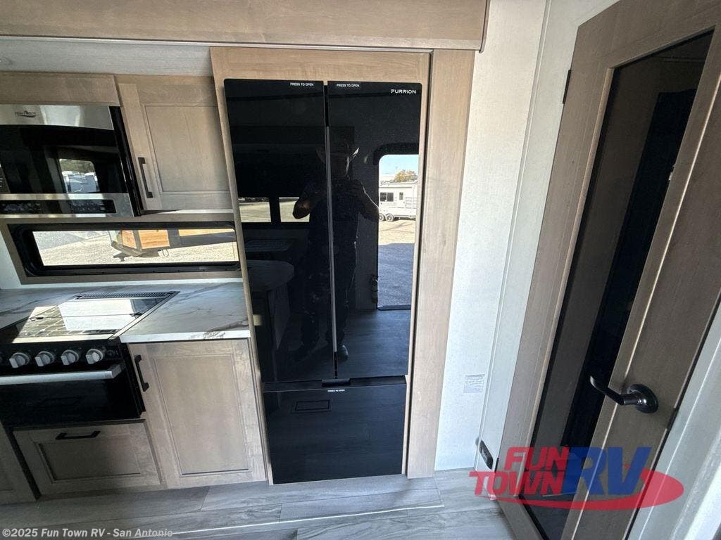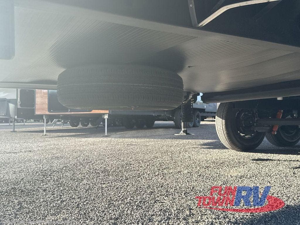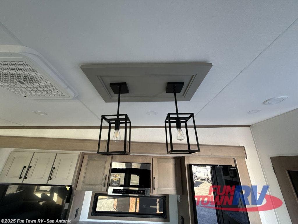 This fifth wheel will feel just like home with its kitchen island, theater seating, and front private bedroom! If you have any overnight guests, they can sleep on the rear hide-a-bed sofa. There is also a dinette with EZ adjust table for dining space, an entertainment center with a 43" Smart LED TV and an optional 40" fireplace. You will love the extra features that have been added, like the hutch in the kitchen for extra counter and storage space, the shower skylight in the spacious full bath, and the slide out wardrobe in the front bedroom!