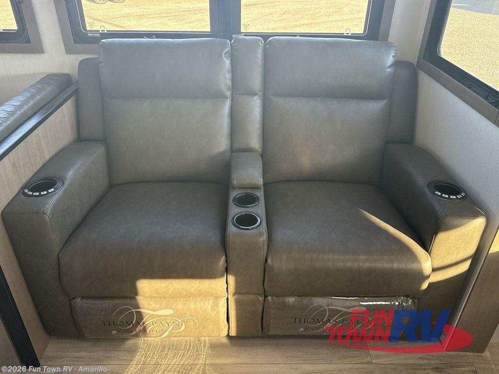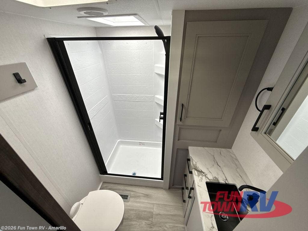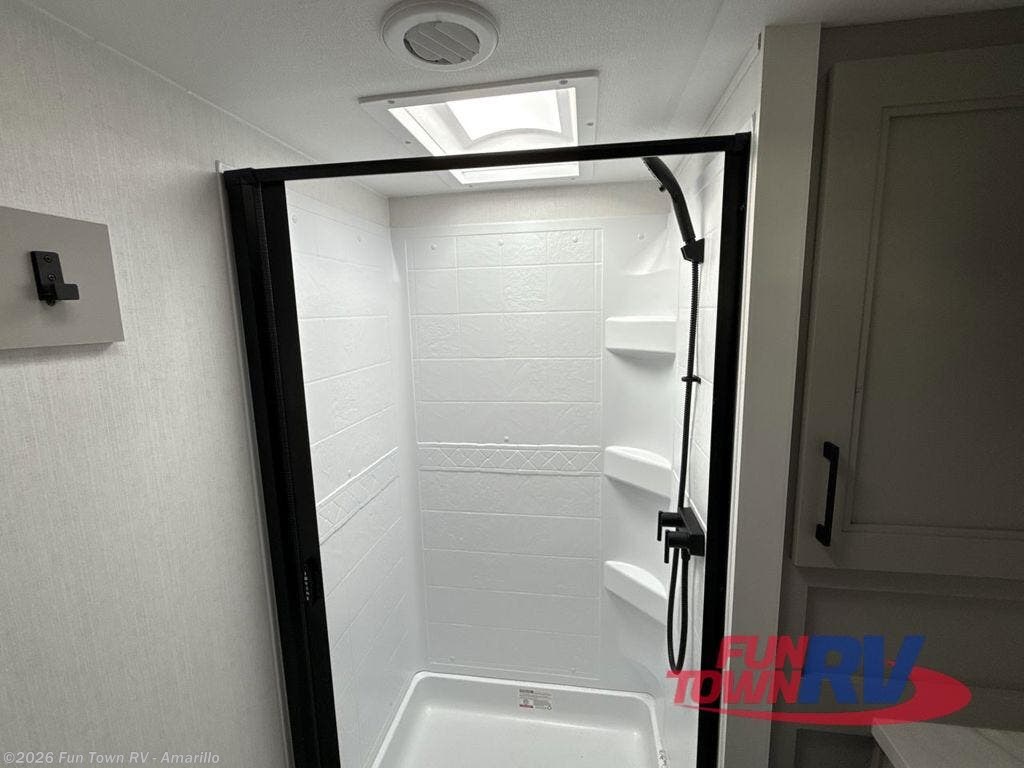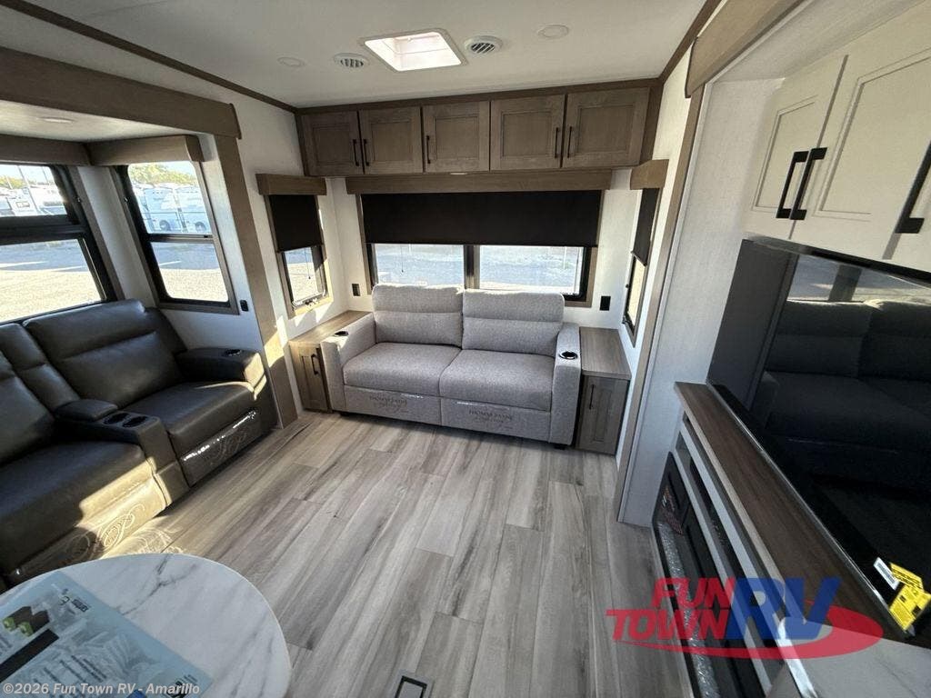 This fifth wheel will feel just like home with its kitchen island, theater seating, and front private bedroom! If you have any overnight guests, they can sleep on the rear hide-a-bed sofa. There is also a dinette with EZ adjust table for dining space, an entertainment center with a 43" Smart LED TV and an optional 40" fireplace. You will love the extra features that have been added, like the hutch in the kitchen for extra counter and storage space, the shower skylight in the spacious full bath, and the slide out wardrobe in the front bedroom!