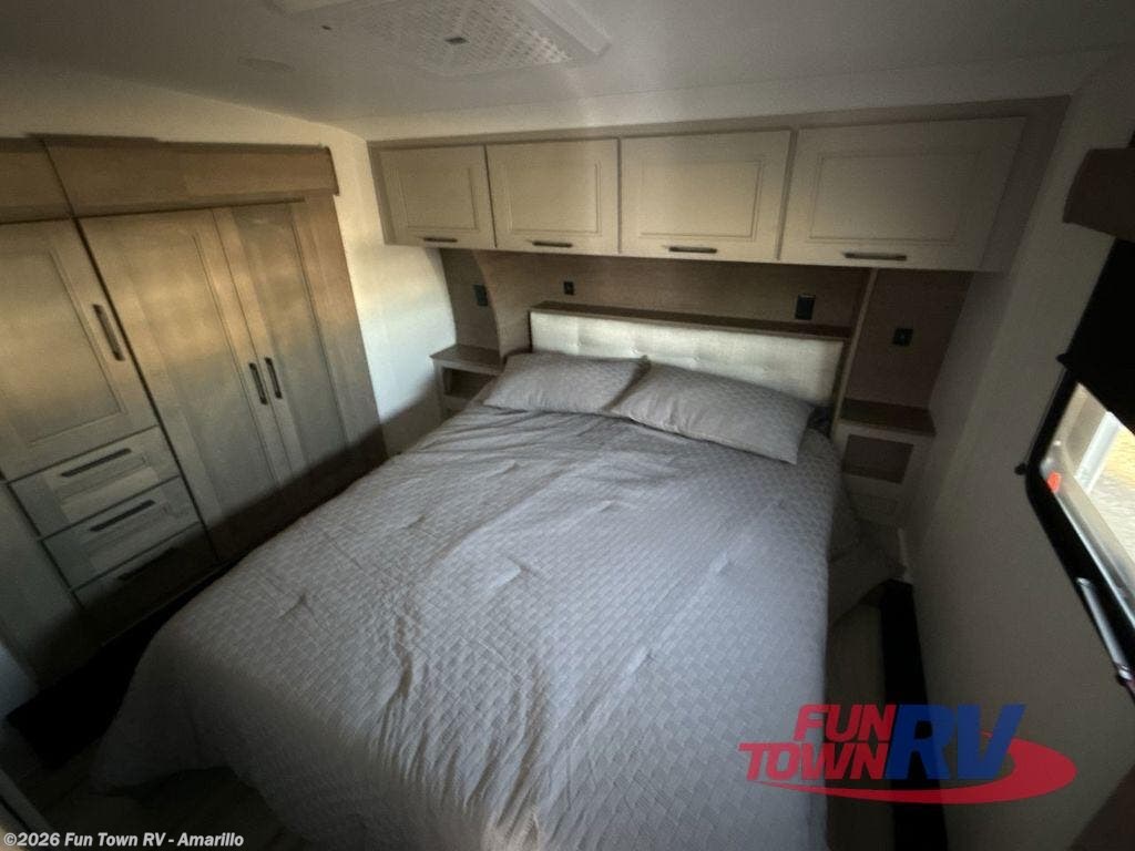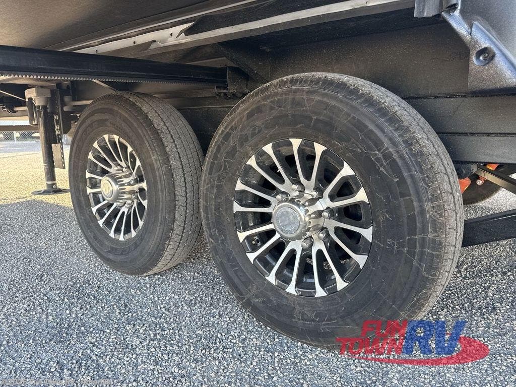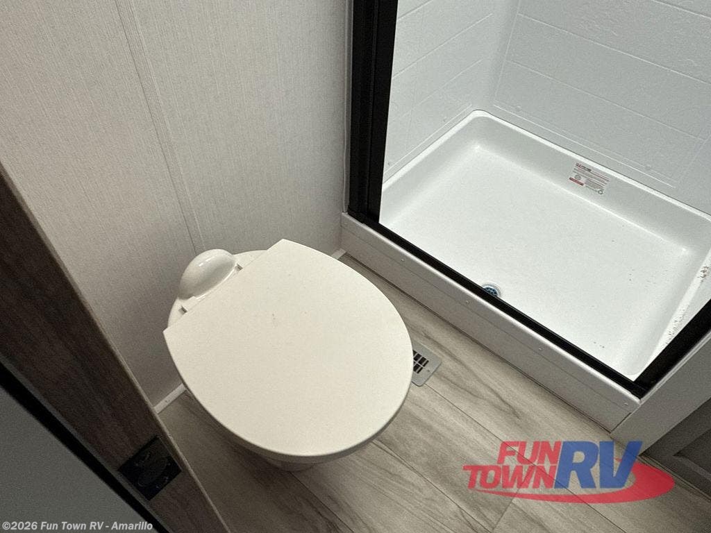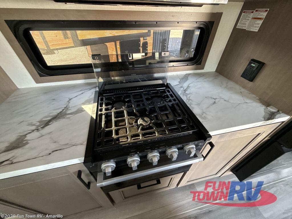 This fifth wheel will feel just like home with its kitchen island, theater seating, and front private bedroom! If you have any overnight guests, they can sleep on the rear hide-a-bed sofa. There is also a dinette with EZ adjust table for dining space, an entertainment center with a 43" Smart LED TV and an optional 40" fireplace. You will love the extra features that have been added, like the hutch in the kitchen for extra counter and storage space, the shower skylight in the spacious full bath, and the slide out wardrobe in the front bedroom!