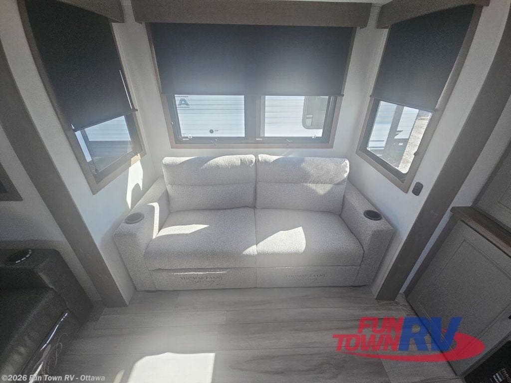 Head to your favorite state park in this spacious fifth wheel. You crew will love to visit in the rear living area that includes two hide-a-bed sofas, theater seating with USB ports, plus an entertainment center with a 65" TV! This area can double as your guests' bedroom at night, while you take the front private bedroom with a queen bed and a slide out wardrobe. In the morning, the little ones can enjoy their breakfast at the legless table, stools, and a bench, or take their plate outdoors to sit under the 19' power awning. There is also a spacious 12 cu. ft. refrigerator for food storage you are sure to appreciate!