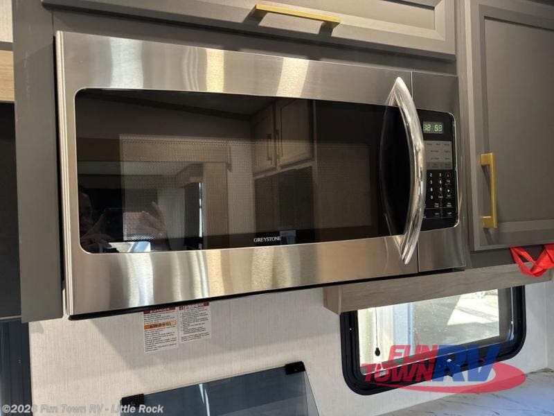 When you want to get away from it all, hitch up this spacious fifth wheel and head out! Once you arrive at the campground, you can make lunch in the rear kitchen that includes ample counter space, a 21" oven and 30" microwave, plus a pantry and French door refrigerator for food storage. Your crew can relax at the L-dinette with an EZ adjust table or on the theater seating across from the fireplace and Smart LED TV. And if you're needing additional sleeping space, just choose the optional hide-a-bed sofa in place of the theater seating! The dual entry bath features a spacious 42" x 30" residential shower, convenient towel hooks and a large slide out that is shared with the front master bedroom. You'll sleep soundly on the king bed here, and you can keep your things organized in the dresser and front closet. There is also washer and dryer prep if you want to add those appliances!