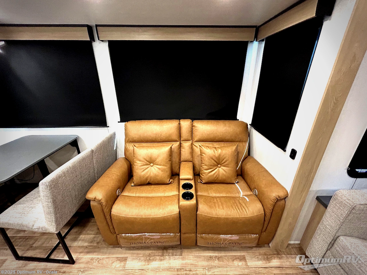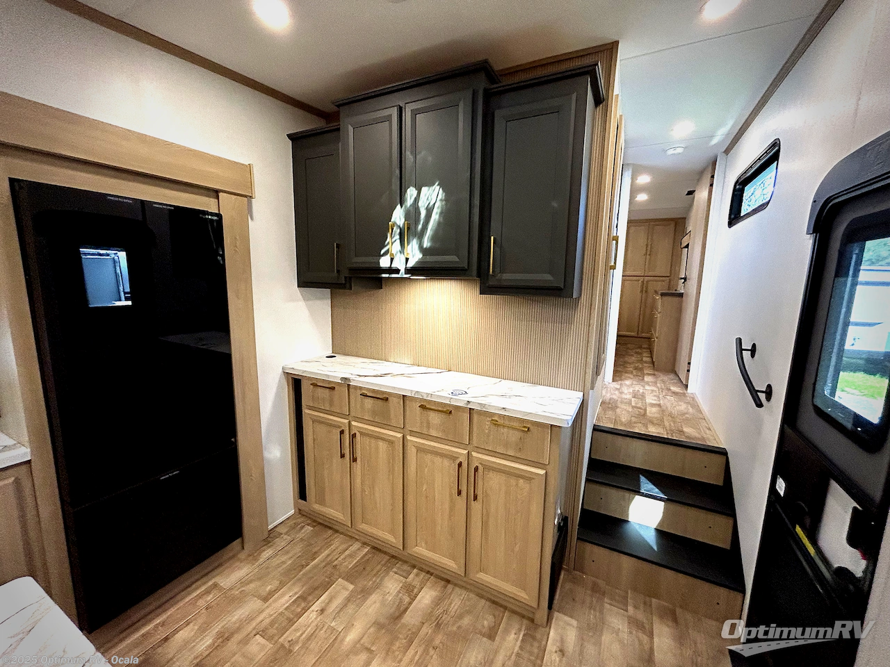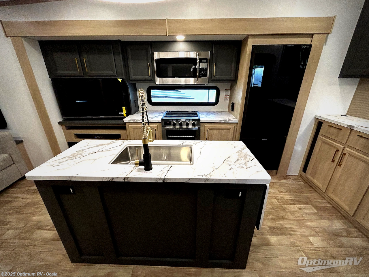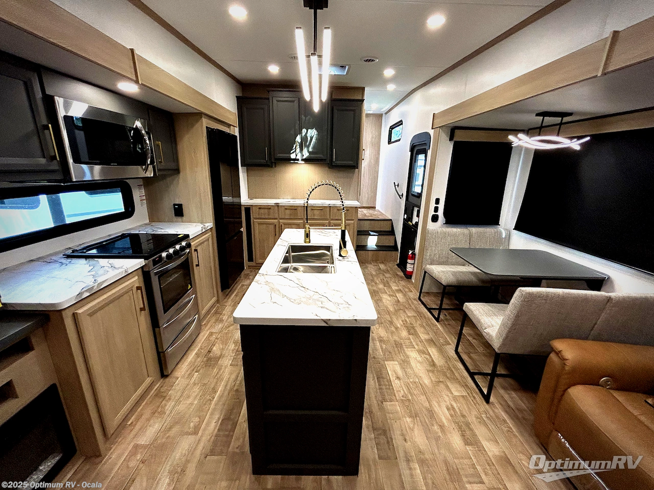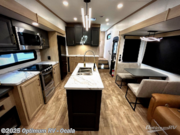 You will love the amount of interior space in this fifth wheel with triple slides, including dual opposing slides in the combined kitchen and rear living area. The chef of your group will appreciate the kitchen island for more prep space, along with a hutch/pantry for additional storage. A table with four chairs provides a place to dine together, and there is theater seating across from the Smart LED TV for movie night. If you have any guests, they can sleep on the rear hide-a-bed sofa, while you take the king bed in the front master bedroom. You'll also find a front closet here with washer and dryer prep, a dresser, and a large slide that is shared with the dual entry bath.