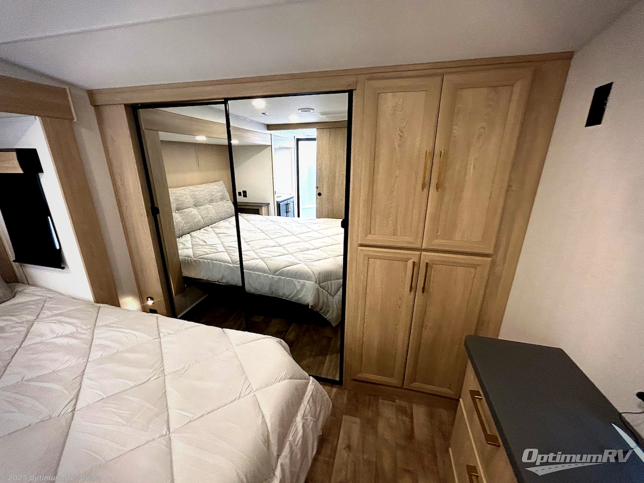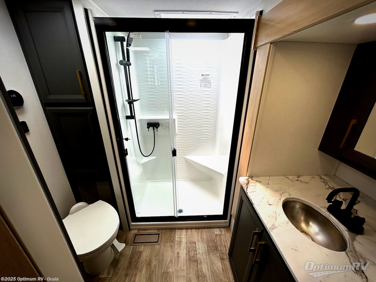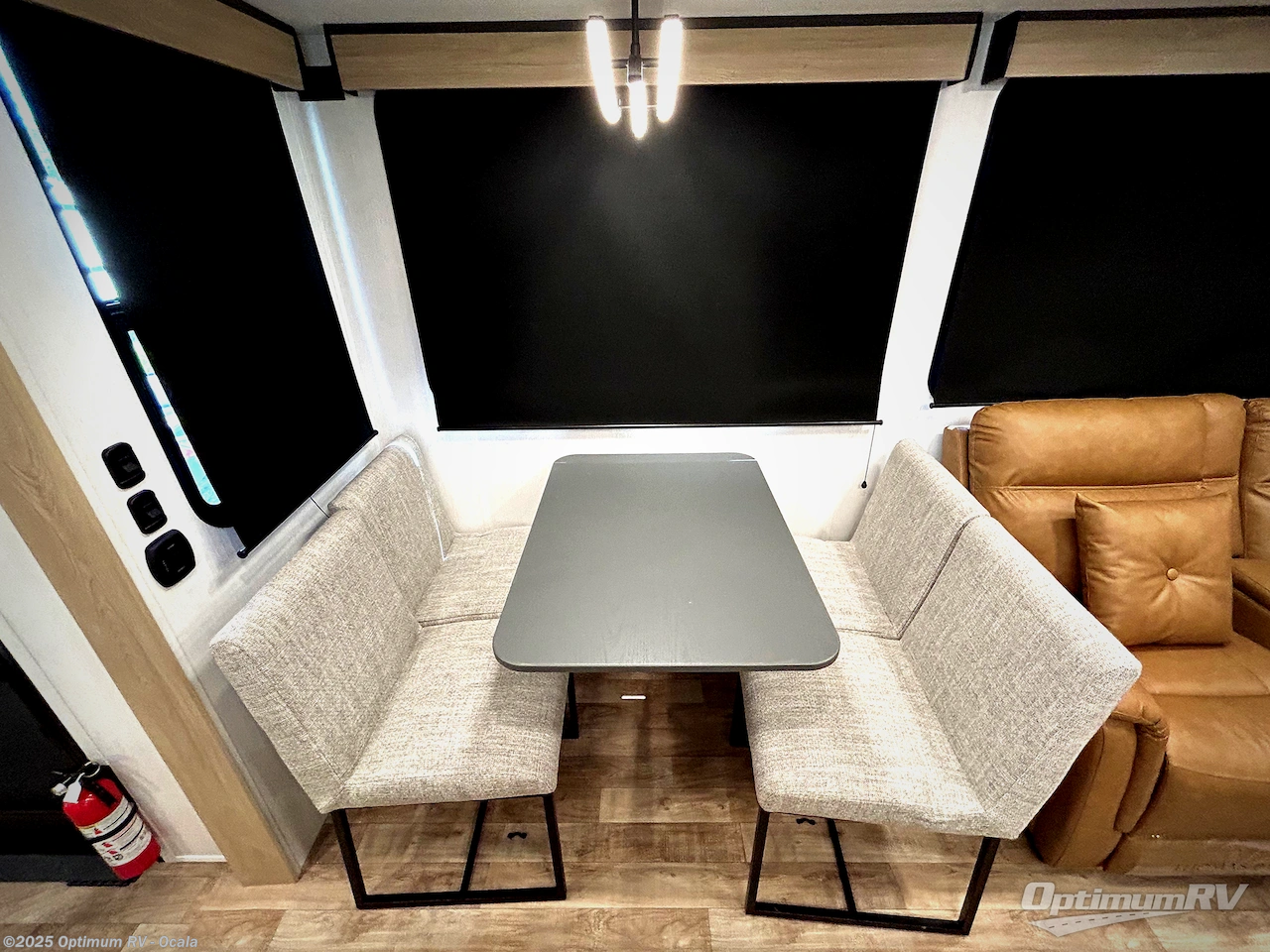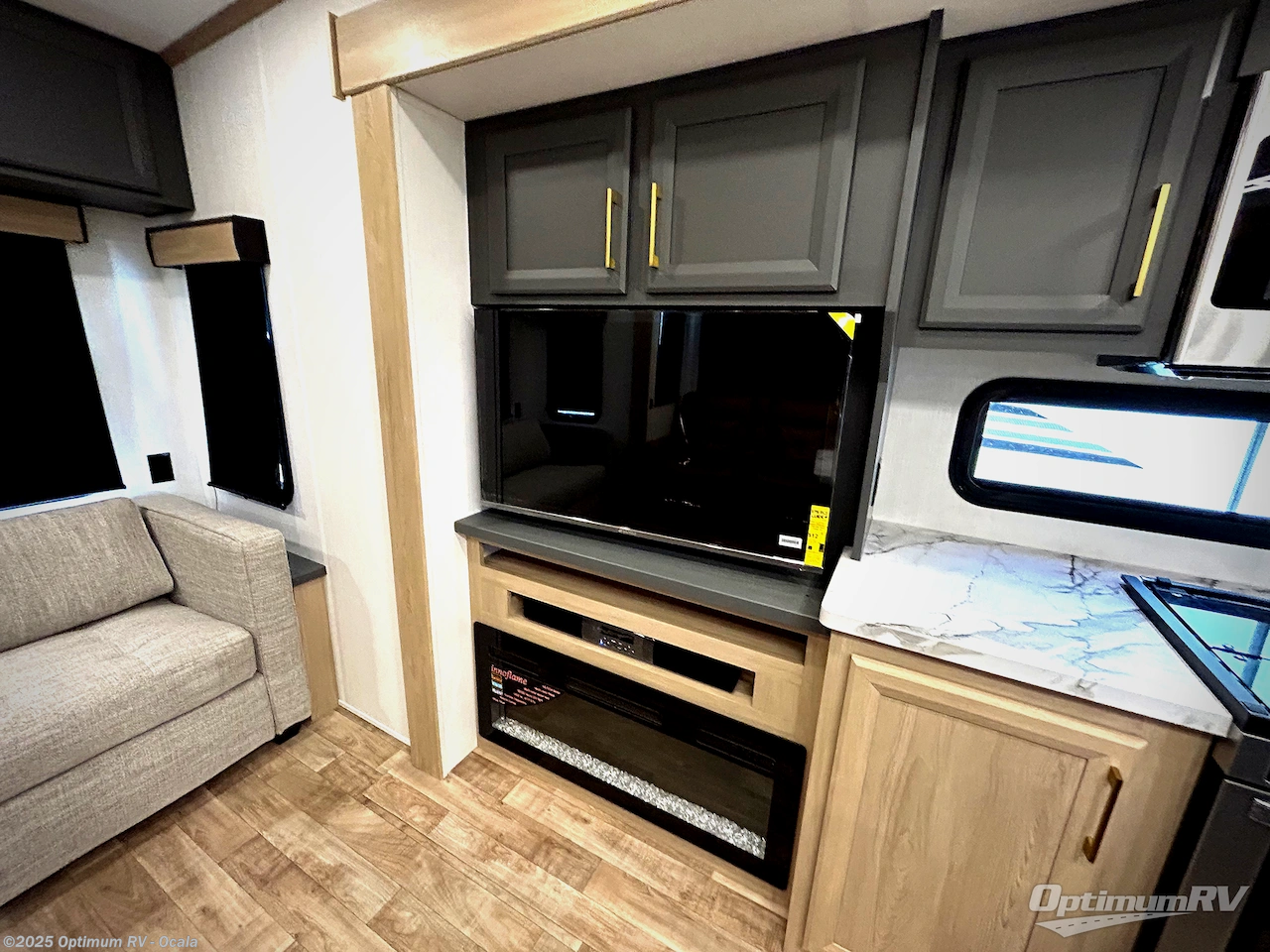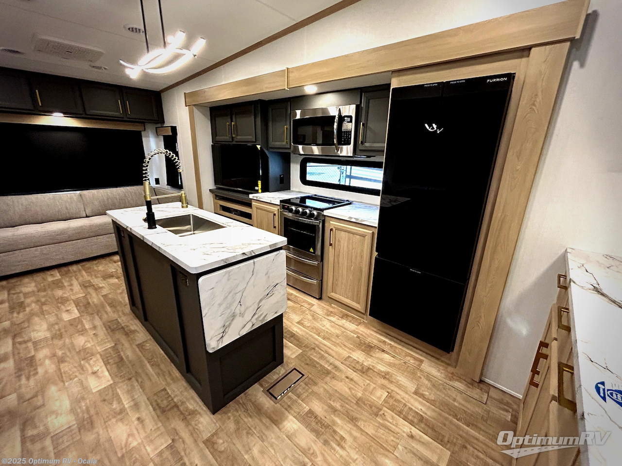 You will love the amount of interior space in this fifth wheel with triple slides, including dual opposing slides in the combined kitchen and rear living area. The chef of your group will appreciate the kitchen island for more prep space, along with a hutch/pantry for additional storage. A table with four chairs provides a place to dine together, and there is theater seating across from the Smart LED TV for movie night. If you have any guests, they can sleep on the rear hide-a-bed sofa, while you take the king bed in the front master bedroom. You'll also find a front closet here with washer and dryer prep, a dresser, and a large slide that is shared with the dual entry bath.