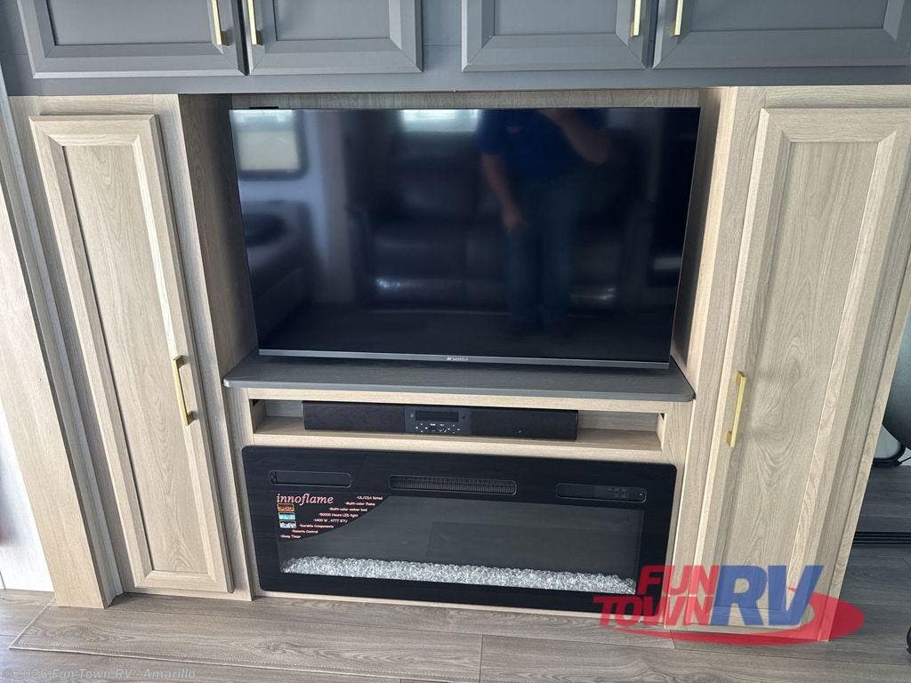 This fifth wheel’s rear kitchen is a culinary paradise, boasting large countertop space for effortless meal preparation, a three-burner range and oven for versatile cooking, a microwave for swift heating, and a pantry for ample food storage. Additionally, the French door refrigerator provides ample storage for fresh ingredients and beverages. Adjacent to the kitchen, a sleek legless table with four chairs provides an elegant and flexible dining space. The living room is a refined retreat featuring theater seating, a hide-a-bed sofa, and a fireplace paired with a TV creates a cozy ambiance. The full bathroom is a sanctuary of comfort, offering a well-appointed space for personal care and hygiene. Finally, the front bedroom, an elegant oasis, features a king bed for luxurious rest, a spacious wardrobe for clothing storage, and a dresser for added organization.