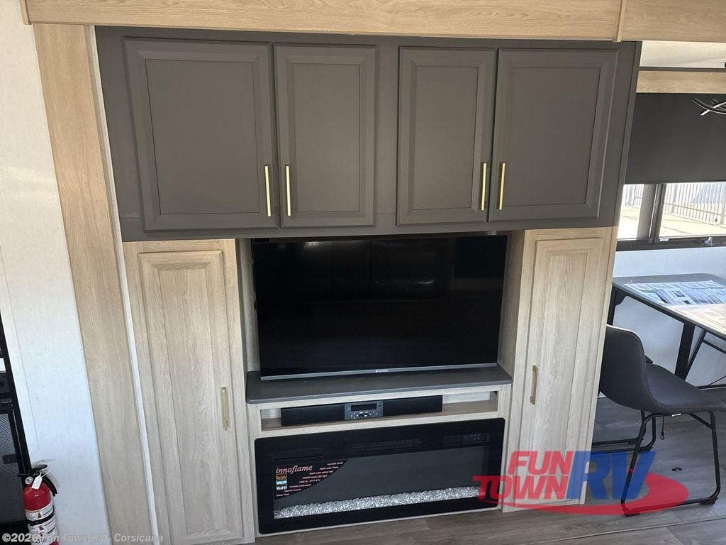 This fifth wheel’s rear kitchen is a culinary paradise, boasting large countertop space for effortless meal preparation, a three-burner range and oven for versatile cooking, a microwave for swift heating, and a pantry for ample food storage. Additionally, the French door refrigerator provides ample storage for fresh ingredients and beverages. Adjacent to the kitchen, a sleek legless table with four chairs provides an elegant and flexible dining space. The living room is a refined retreat featuring theater seating, a hide-a-bed sofa, and a fireplace paired with a TV creates a cozy ambiance. The full bathroom is a sanctuary of comfort, offering a well-appointed space for personal care and hygiene. Finally, the front bedroom, an elegant oasis, features a king bed for luxurious rest, a spacious wardrobe for clothing storage, and a dresser for added organization.