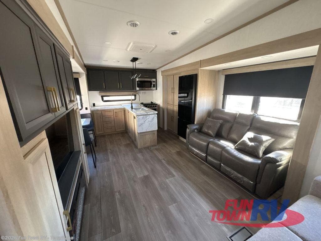 This fifth wheel’s rear kitchen is a culinary paradise, boasting large countertop space for effortless meal preparation, a three-burner range and oven for versatile cooking, a microwave for swift heating, and a pantry for ample food storage. Additionally, the French door refrigerator provides ample storage for fresh ingredients and beverages. Adjacent to the kitchen, a sleek legless table with four chairs provides an elegant and flexible dining space. The living room is a refined retreat featuring theater seating, a hide-a-bed sofa, and a fireplace paired with a TV creates a cozy ambiance. The full bathroom is a sanctuary of comfort, offering a well-appointed space for personal care and hygiene. Finally, the front bedroom, an elegant oasis, features a king bed for luxurious rest, a spacious wardrobe for clothing storage, and a dresser for added organization.