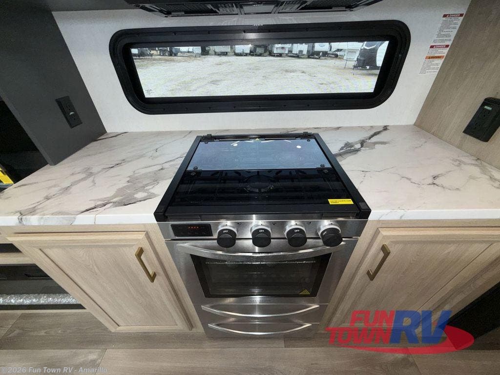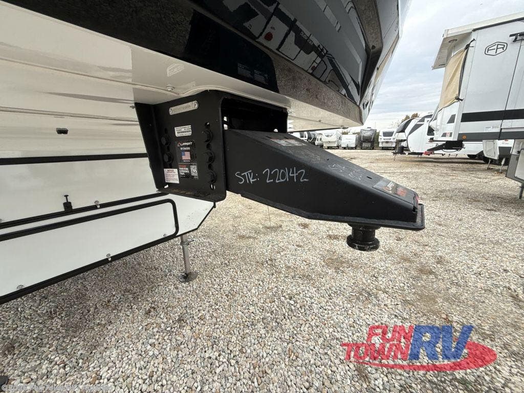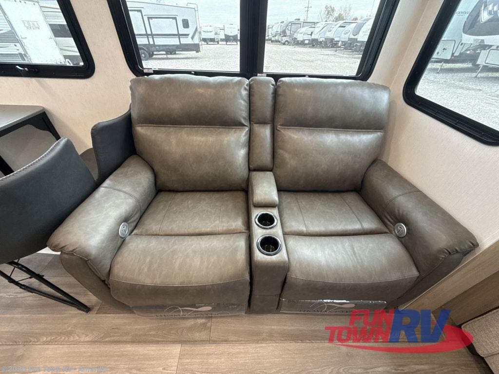 Friends and family will love camping with you since they'll have their own space in the middle bunkhouse. There is a sofa with a bunk above, a closet, plus a desk/entertainment center if you choose to use this space as an office. The front master bedroom features a large slide that is shared with the dual entry bath, along with a king bed, a dresser, plus a large front closet with washer and dryer prep. If you have any other guests, they can sleep on the sofa in the rear living room. There is also a legless table with four chairs here, and theater seating in direct view of the fireplace and Smart LED TV. A kitchen island and hutch/pantry provide extra counter and storage space, and the French door refrigerator will keep all your perishables fresh! After dinner, head outdoors to enjoy the two power awnings with LED lights!