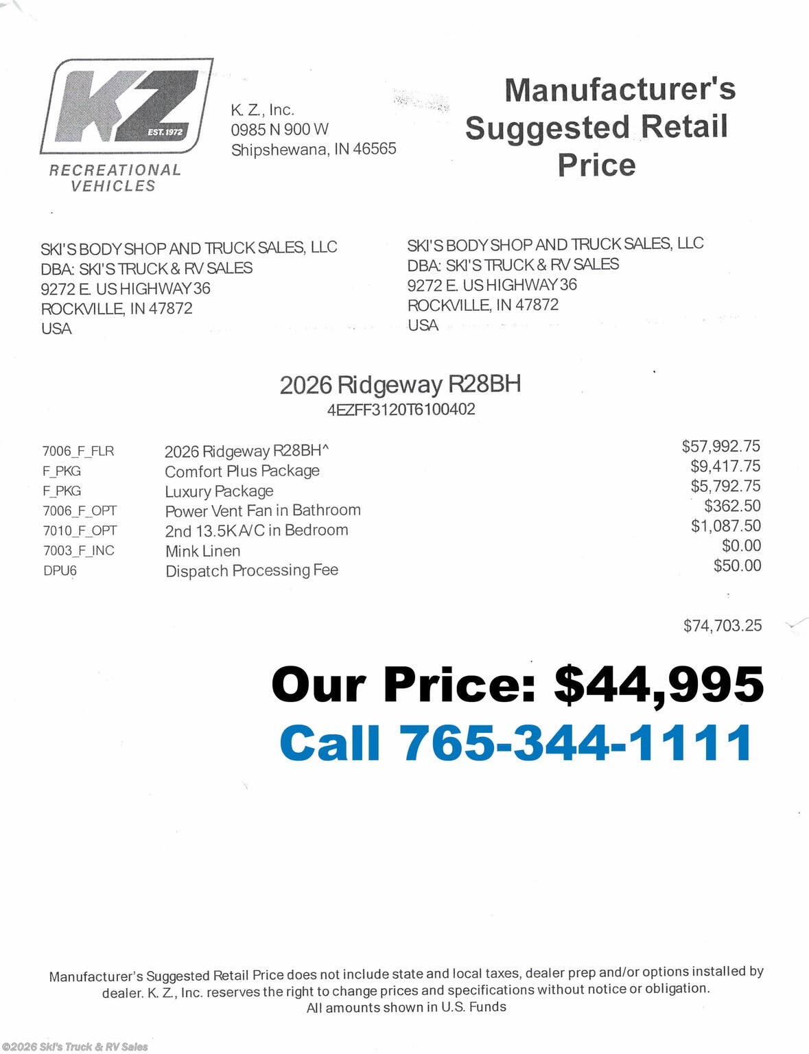 Request More Info on this 2026 K-Z Ridgeway R28BH Offered for sale by Ski's Truck & RV Sales