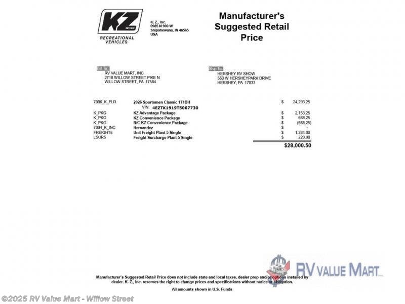 Request More Info on this 2026 K-Z Sportsmen Classic 171BH Offered for sale by RV Value Mart - Willow Street