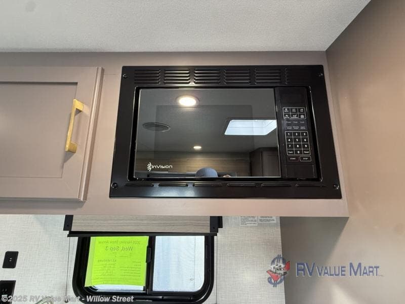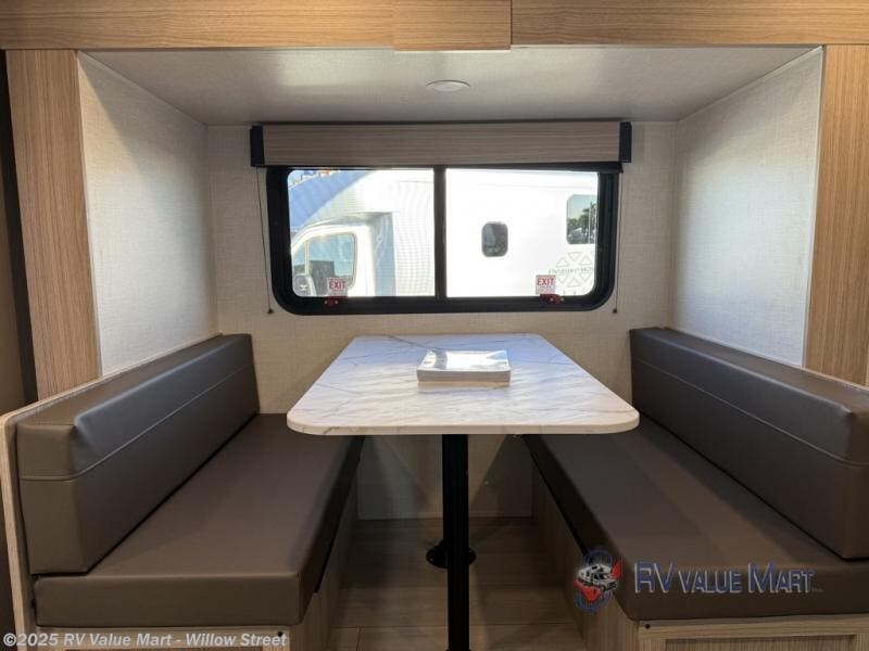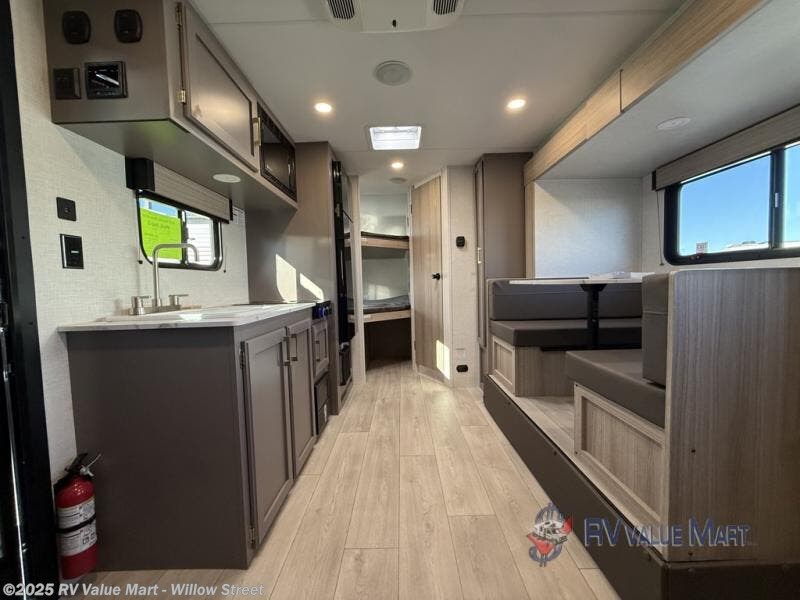 The spacious double-size bunk beds are perfect for families or groups, providing ample sleeping space for a restful night's sleep. There is a 60” jiffy sofa and a murphy bed that offers additional sleeping space or a comfortable spot to relax, making it ideal for families or couples. Further, the cozy booth dinette is a perfect spot for meals or playing board games, creating lasting memories with loved ones. In the kitchen area, the 12V refrigerator keeps your food and drinks fresh, while the microwave provides a convenient way to prepare meals on the go. And after a long day, the full bathroom will be a haven for convenience and comfort, featuring everything you need to freshen up on the go.