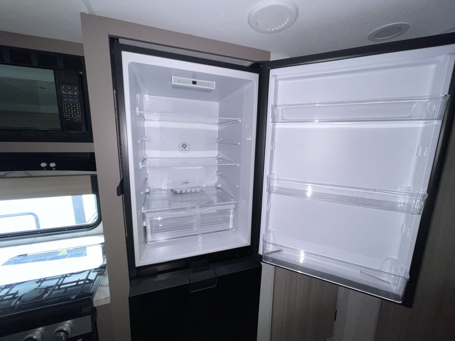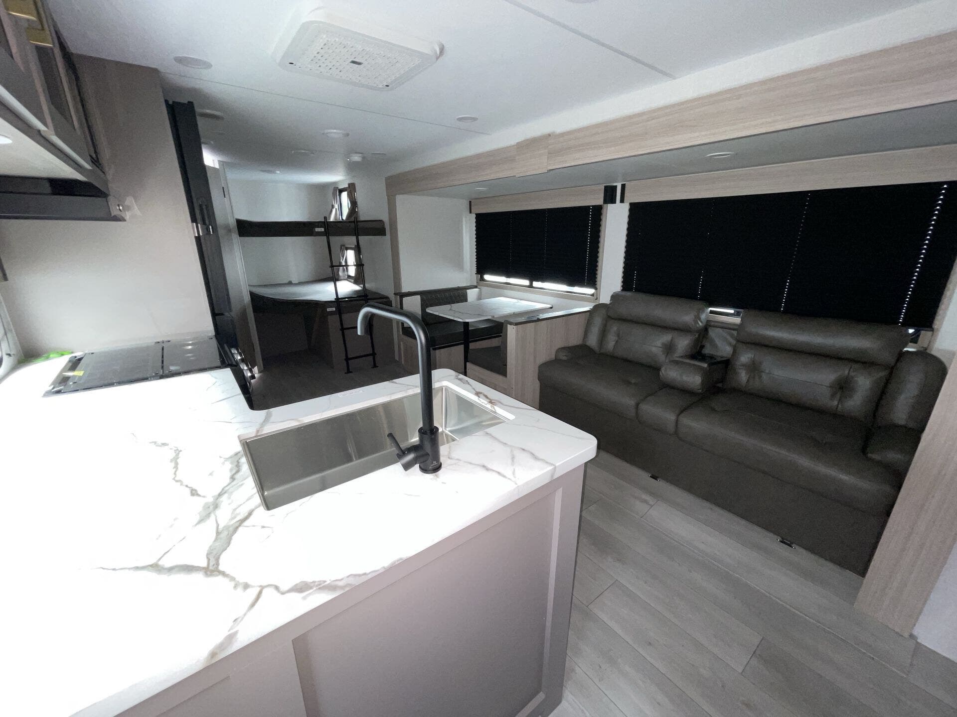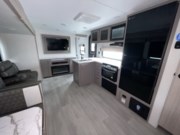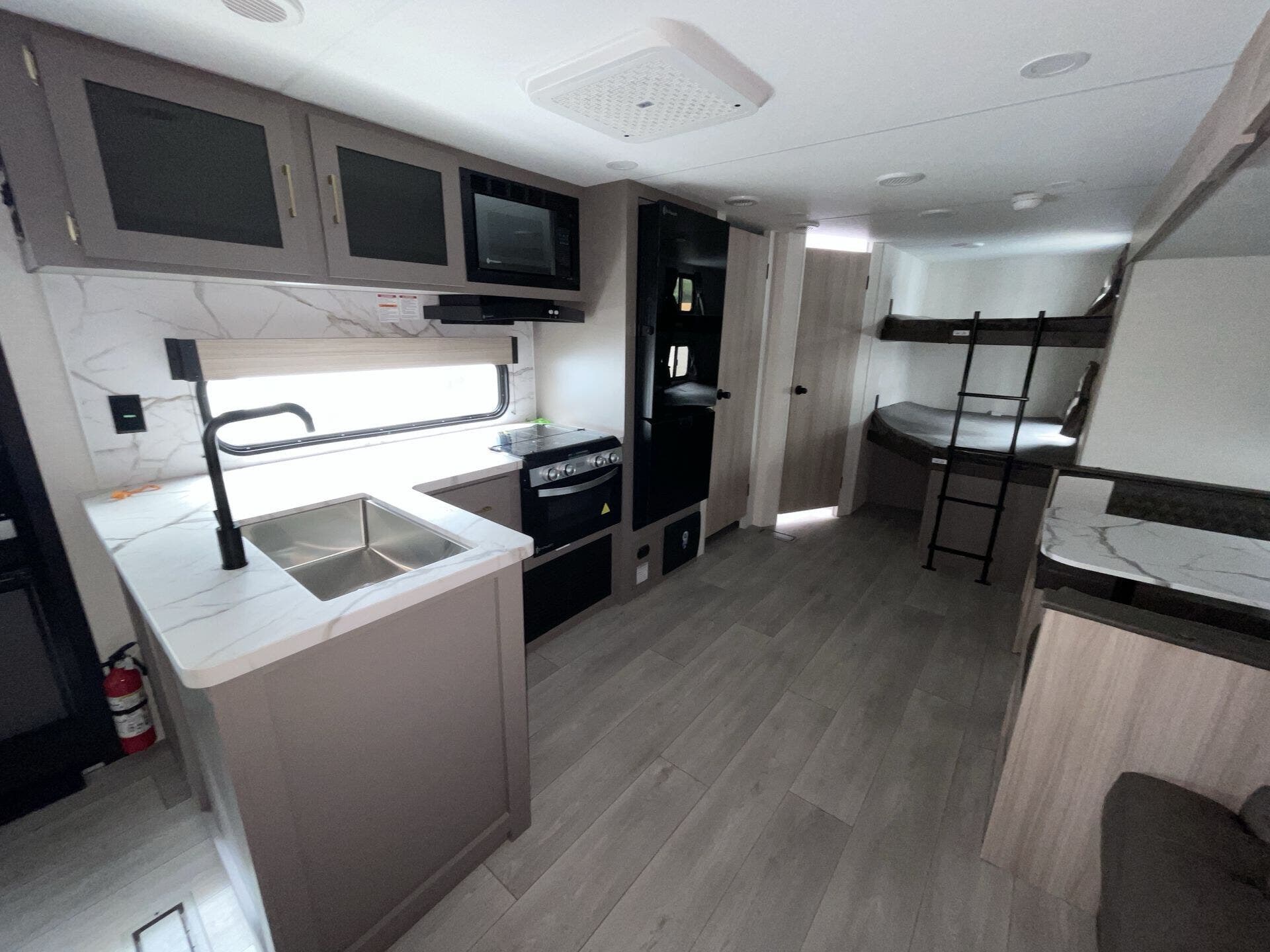 Inside, the 261BHK maximizes every inch of space with a practical and inviting layout. The rear bunkhouse offers multiple bunks for kids or guests, creating a private sleeping area, while the front master bedroom features a queen bed and ample wardrobe storage. The central living area includes a slide-out with theater seating and a U-shaped dinette, perfect for relaxing, dining, or enjoying entertainment. The fully equipped kitchen boasts stainless steel appliances, solid-surface countertops, and a pantry, making meal prep simple and enjoyable no matter where your travels take you.