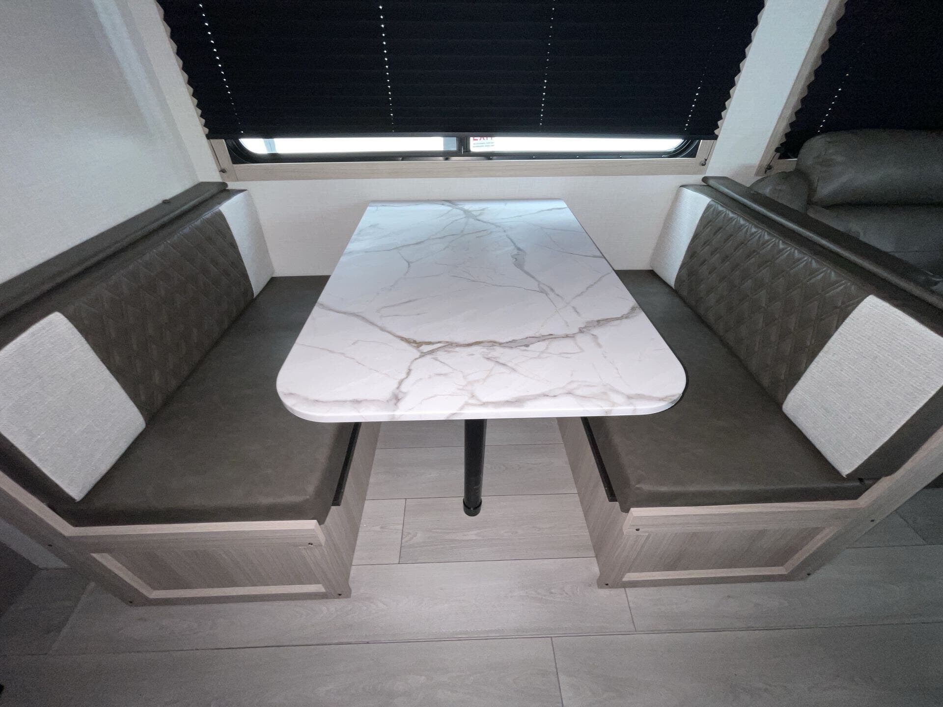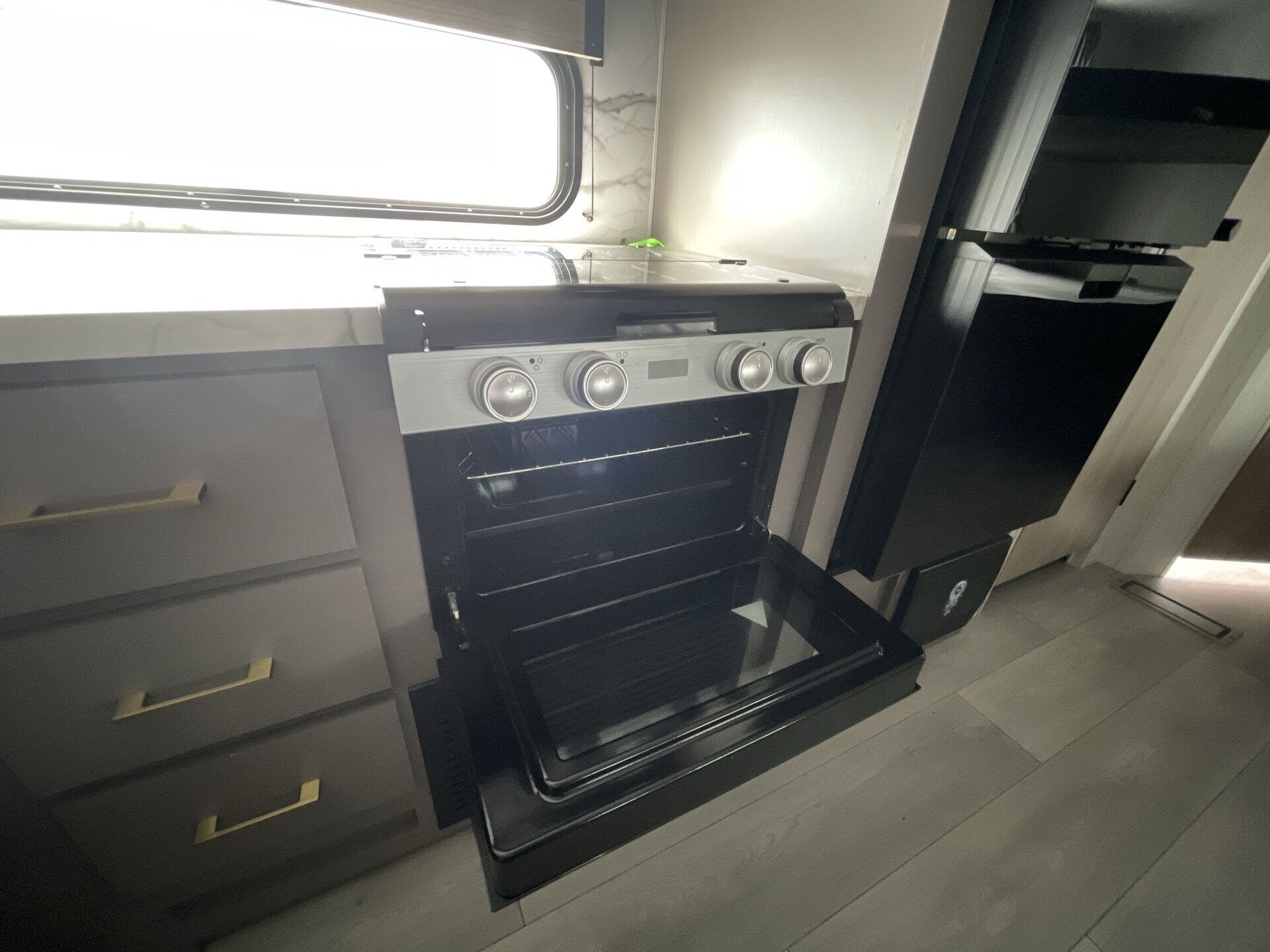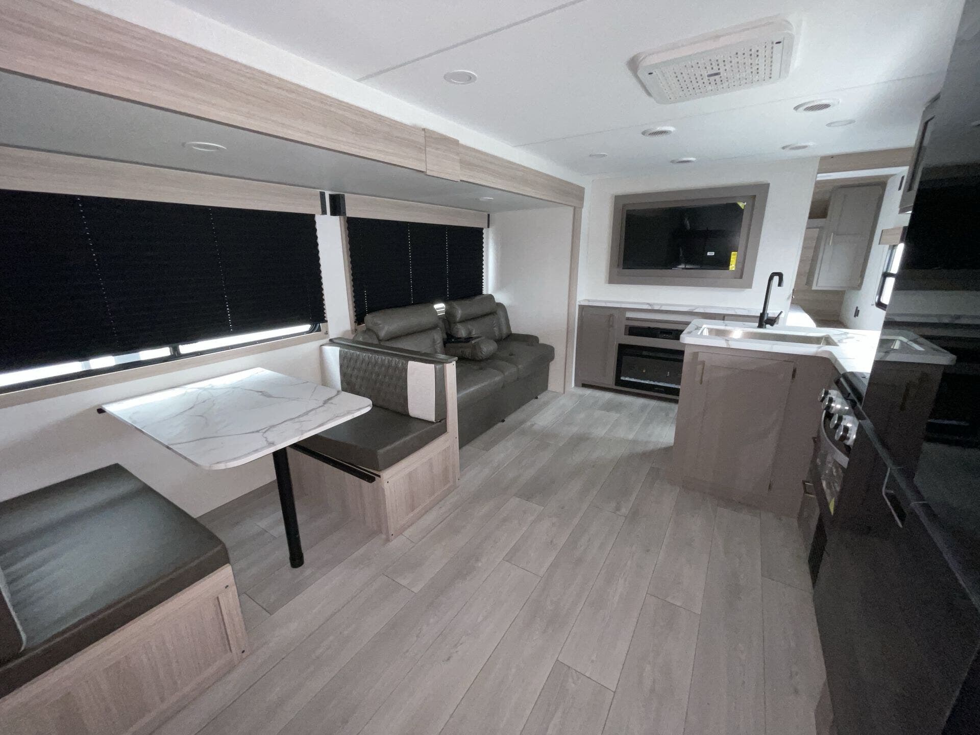 Inside, the 261BHK maximizes every inch of space with a practical and inviting layout. The rear bunkhouse offers multiple bunks for kids or guests, creating a private sleeping area, while the front master bedroom features a queen bed and ample wardrobe storage. The central living area includes a slide-out with theater seating and a U-shaped dinette, perfect for relaxing, dining, or enjoying entertainment. The fully equipped kitchen boasts stainless steel appliances, solid-surface countertops, and a pantry, making meal prep simple and enjoyable no matter where your travels take you.