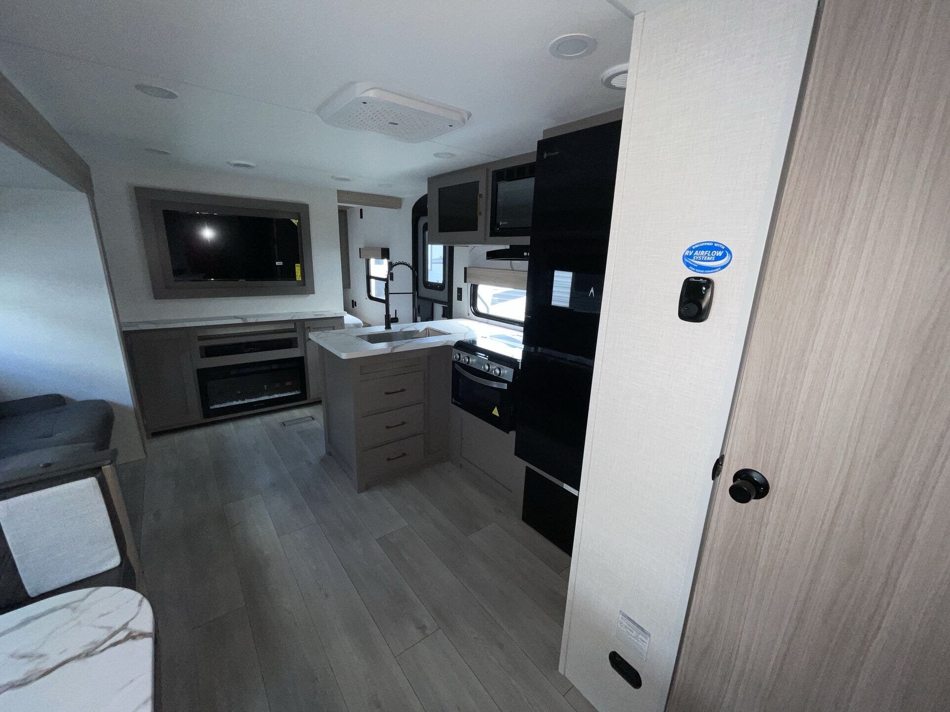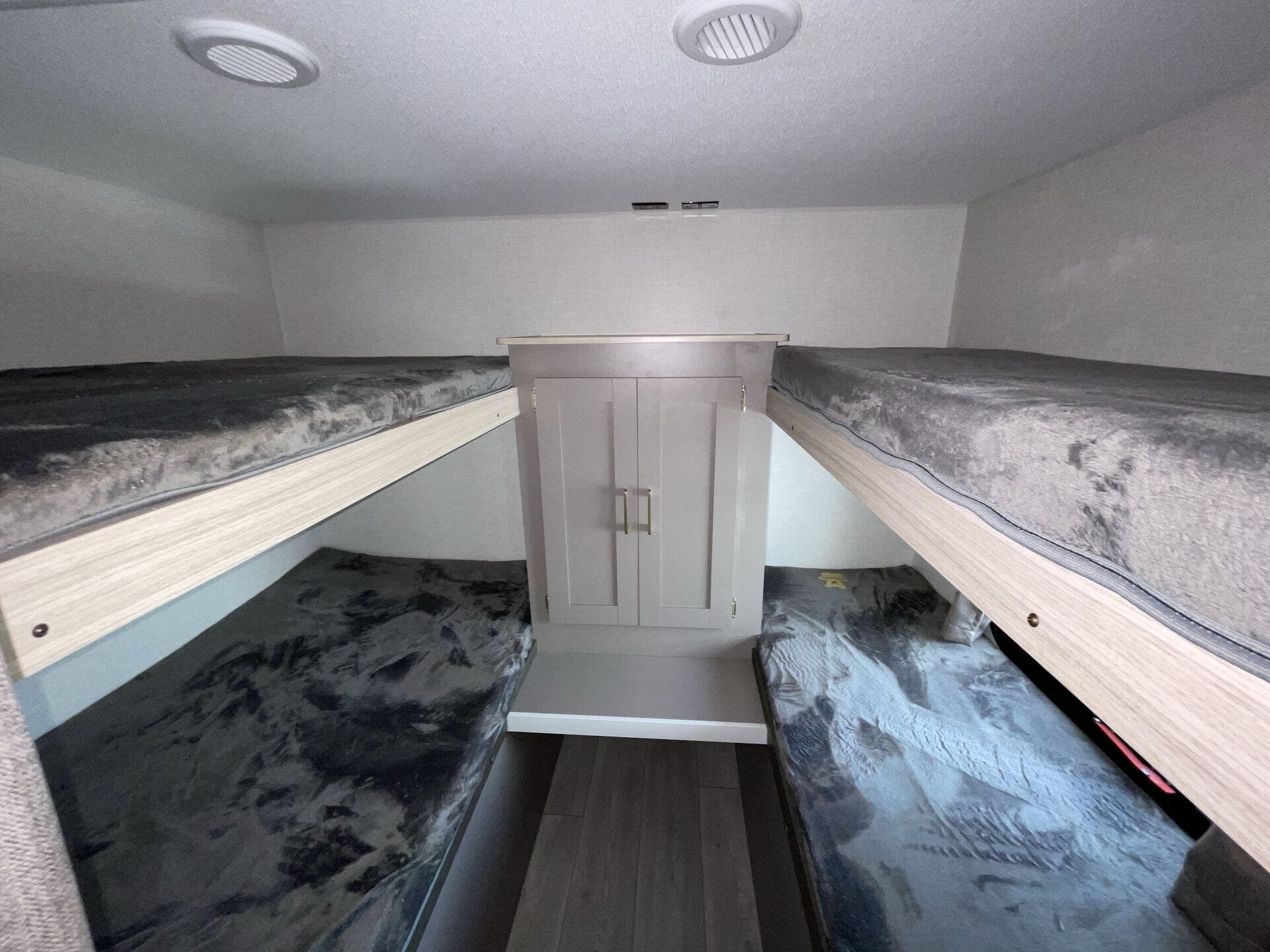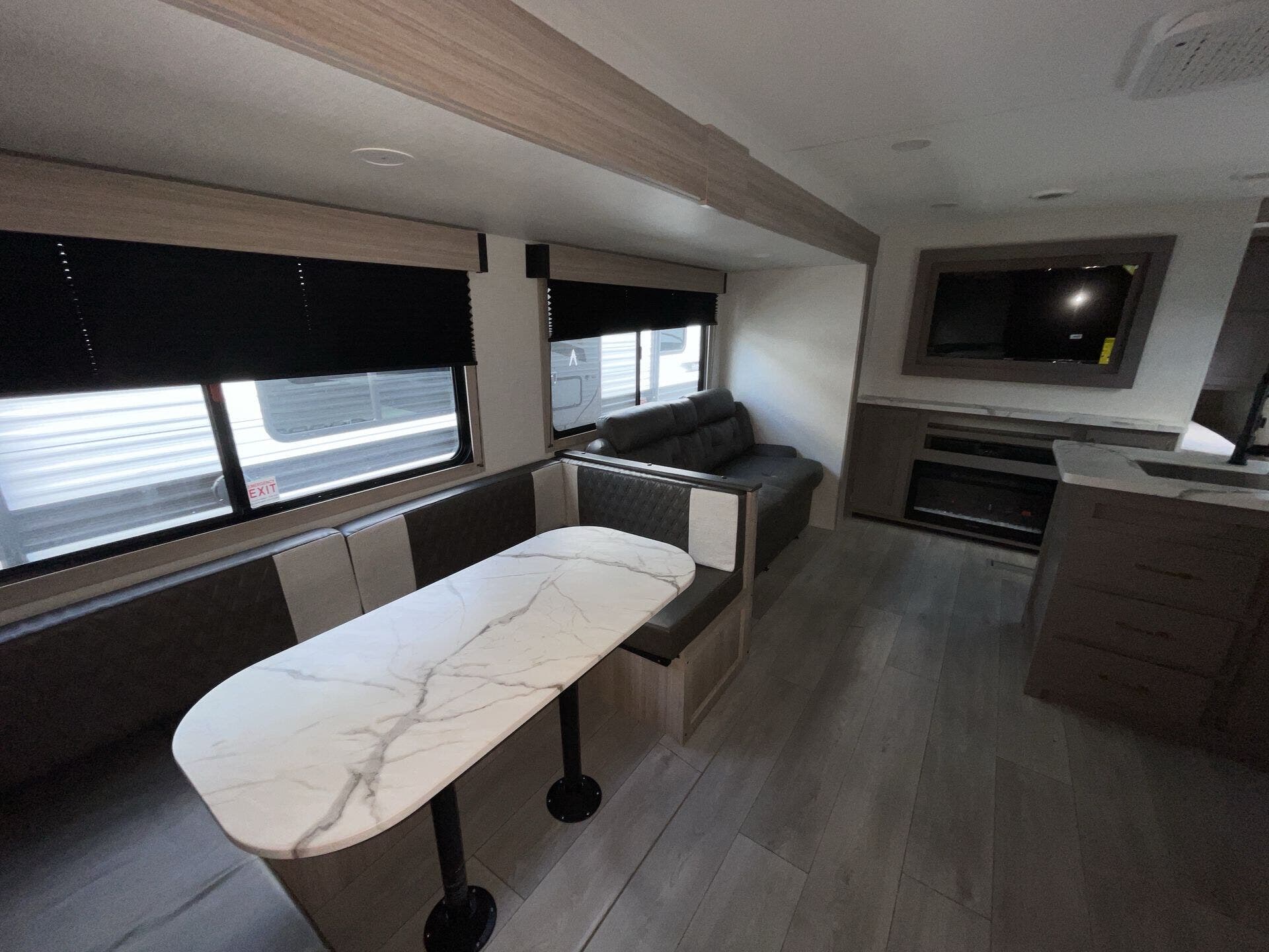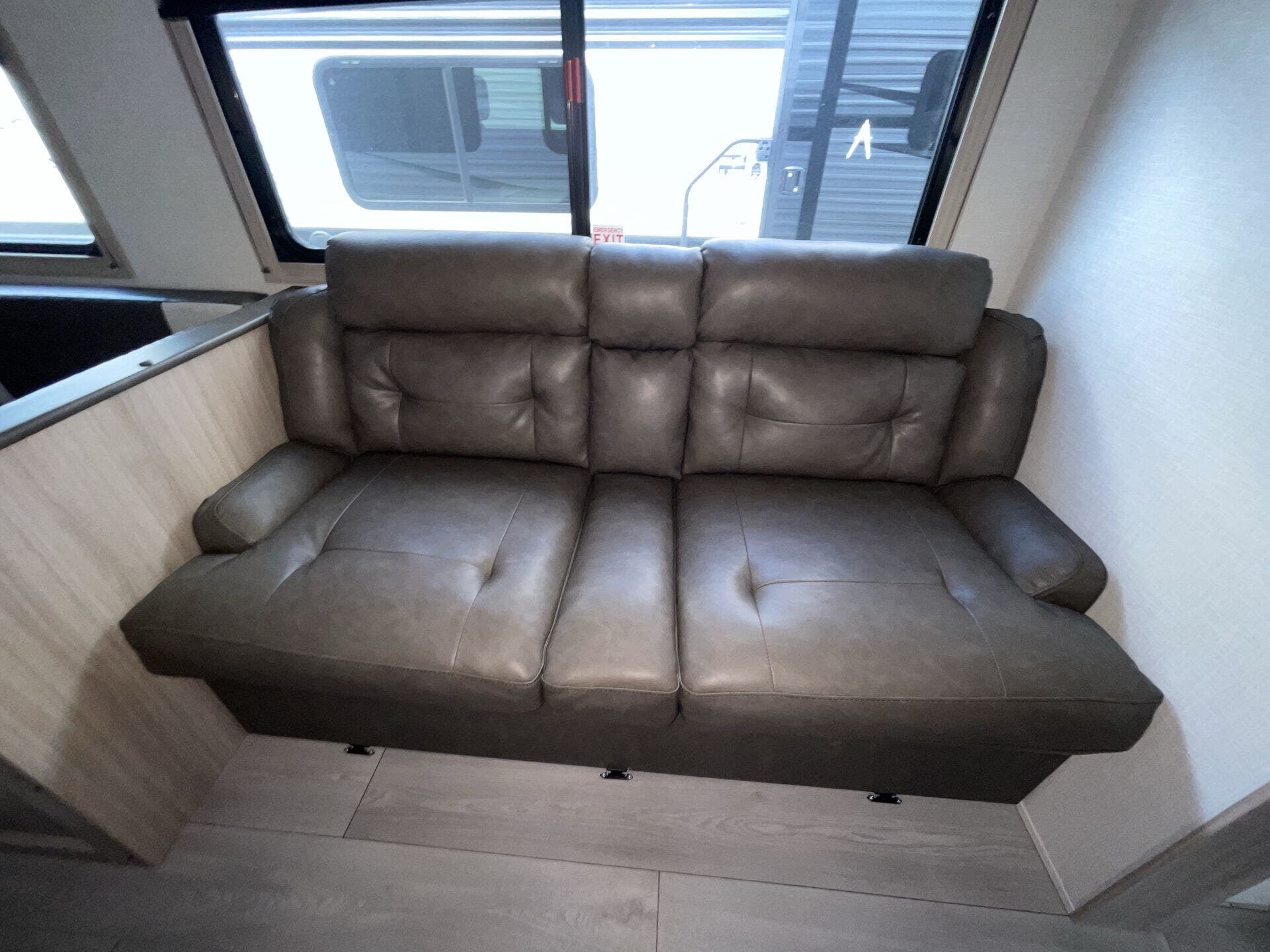 Inside, the 301BHK features a well-thought-out floorplan that maximizes space and comfort. The rear bunkhouse offers multiple bunks for kids or guests, providing a private sleeping area, while the front master bedroom includes a queen bed and ample wardrobe storage. The central living area is highlighted by a large slide-out with theater seating, a U-shaped dinette, and an entertainment center—perfect for relaxing, dining, or enjoying movie nights on the road. The fully equipped kitchen features stainless steel appliances, solid-surface countertops, and a spacious pantry, making meal prep easy and enjoyable.