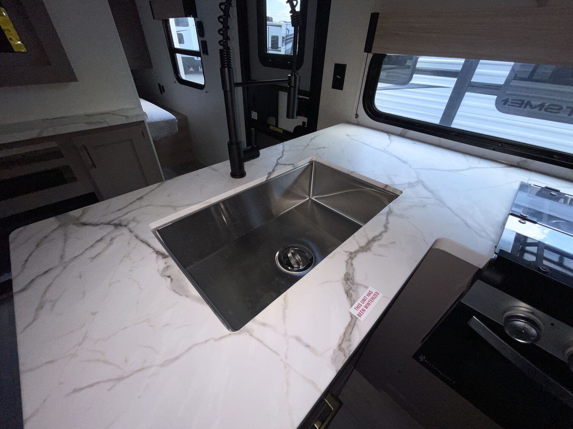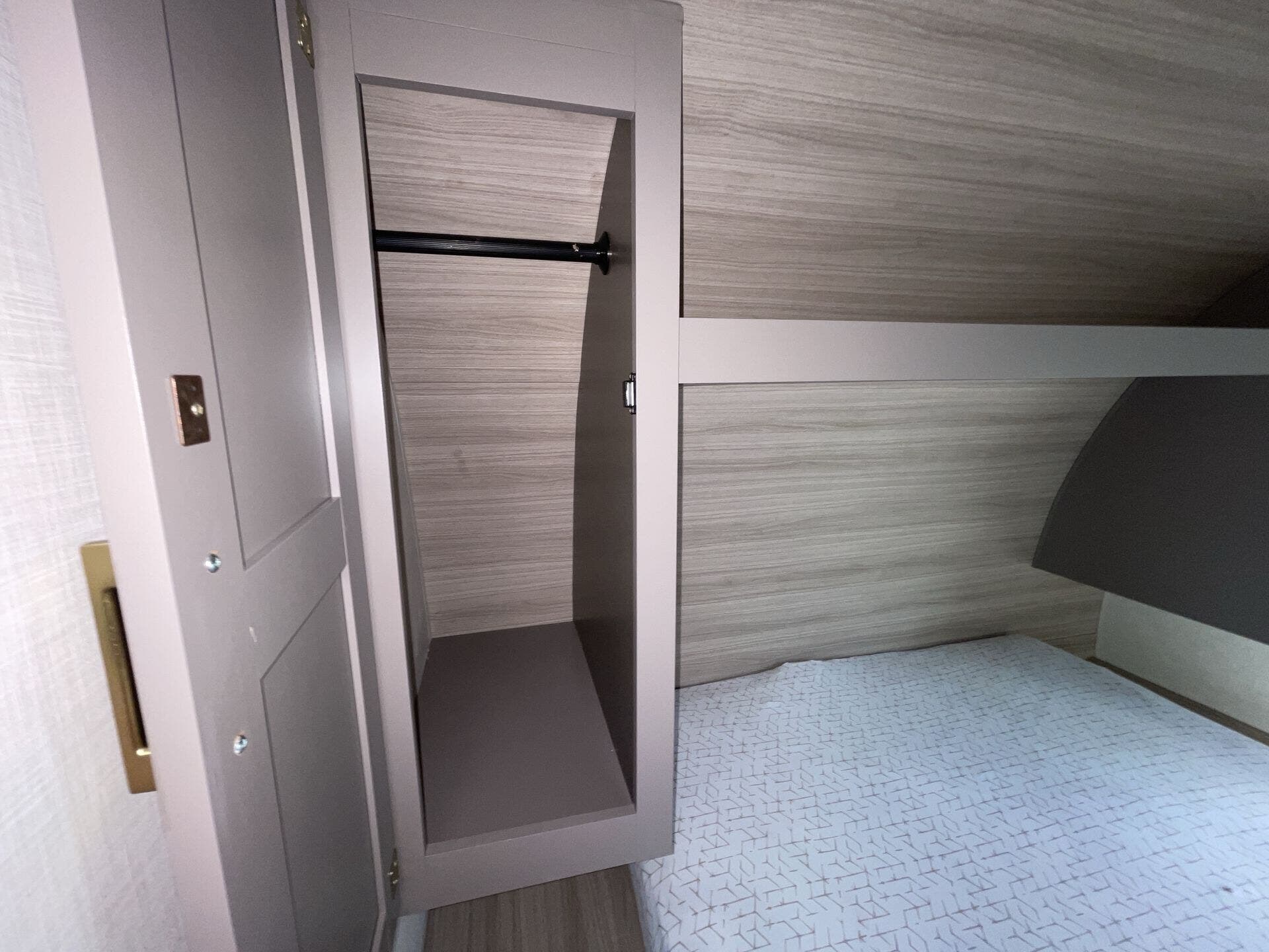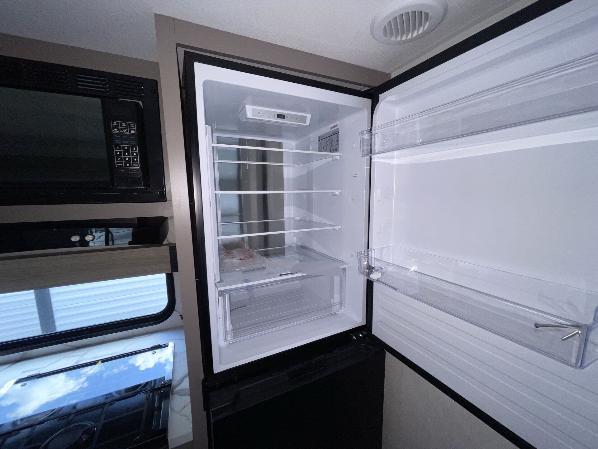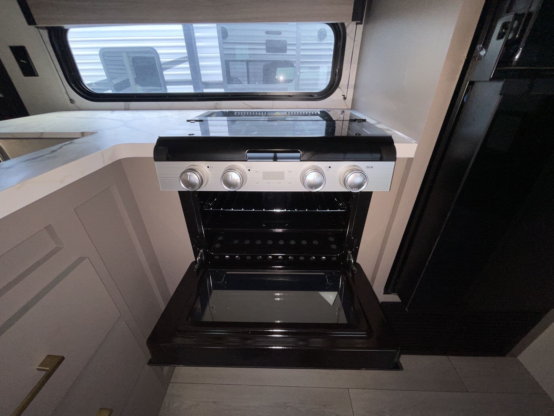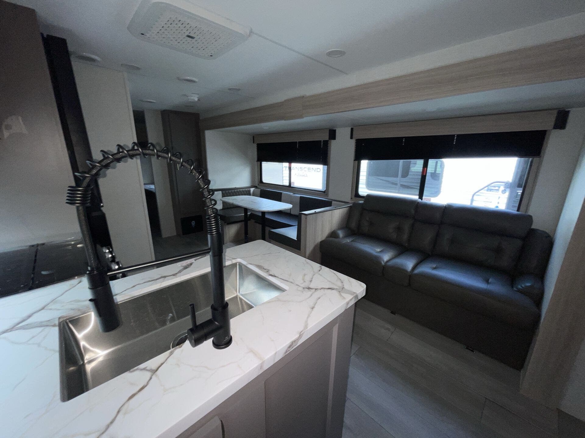 Inside, the 301BHK features a well-thought-out floorplan that maximizes space and comfort. The rear bunkhouse offers multiple bunks for kids or guests, providing a private sleeping area, while the front master bedroom includes a queen bed and ample wardrobe storage. The central living area is highlighted by a large slide-out with theater seating, a U-shaped dinette, and an entertainment center—perfect for relaxing, dining, or enjoying movie nights on the road. The fully equipped kitchen features stainless steel appliances, solid-surface countertops, and a spacious pantry, making meal prep easy and enjoyable.